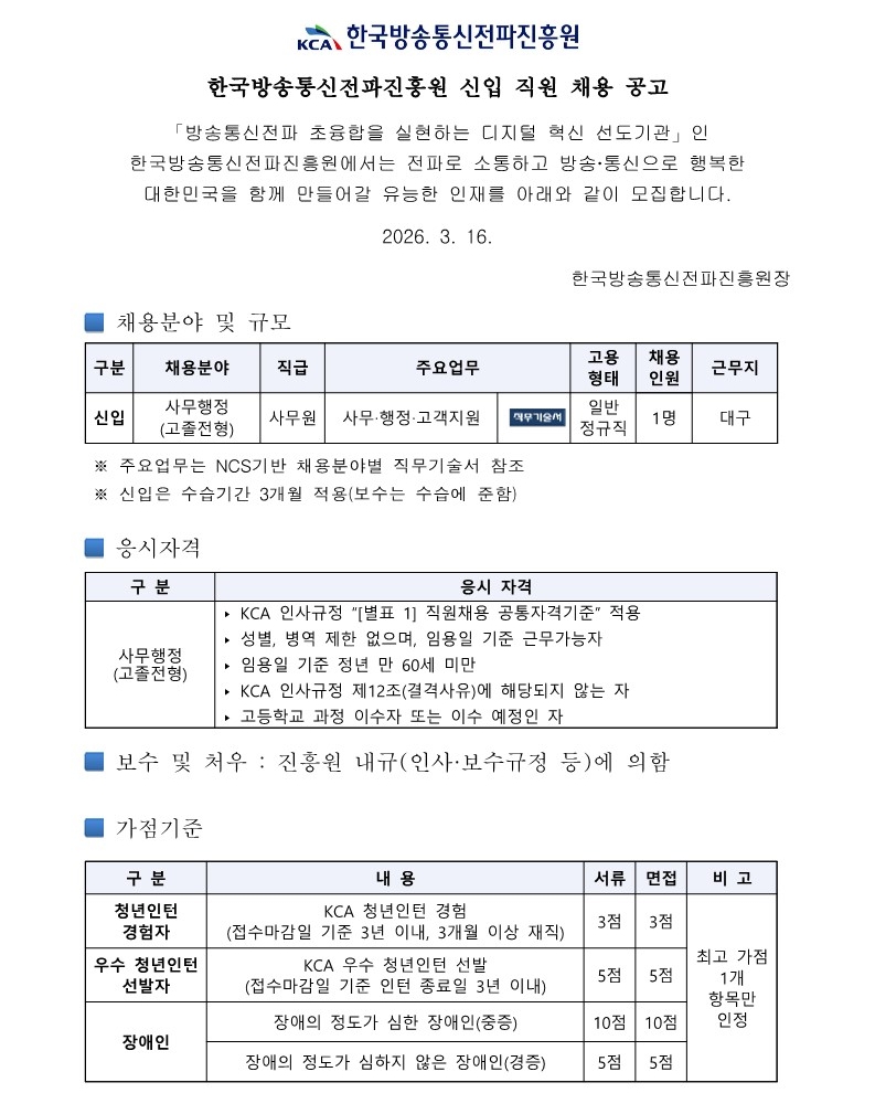 2026³âµµ Á¦1Â÷ Çѱ¹¹æ¼ÛÅë½ÅÀüÆÄÁøÈï¿ø ½ÅÀÔ Á÷¿ø ä¿ë °ø°í