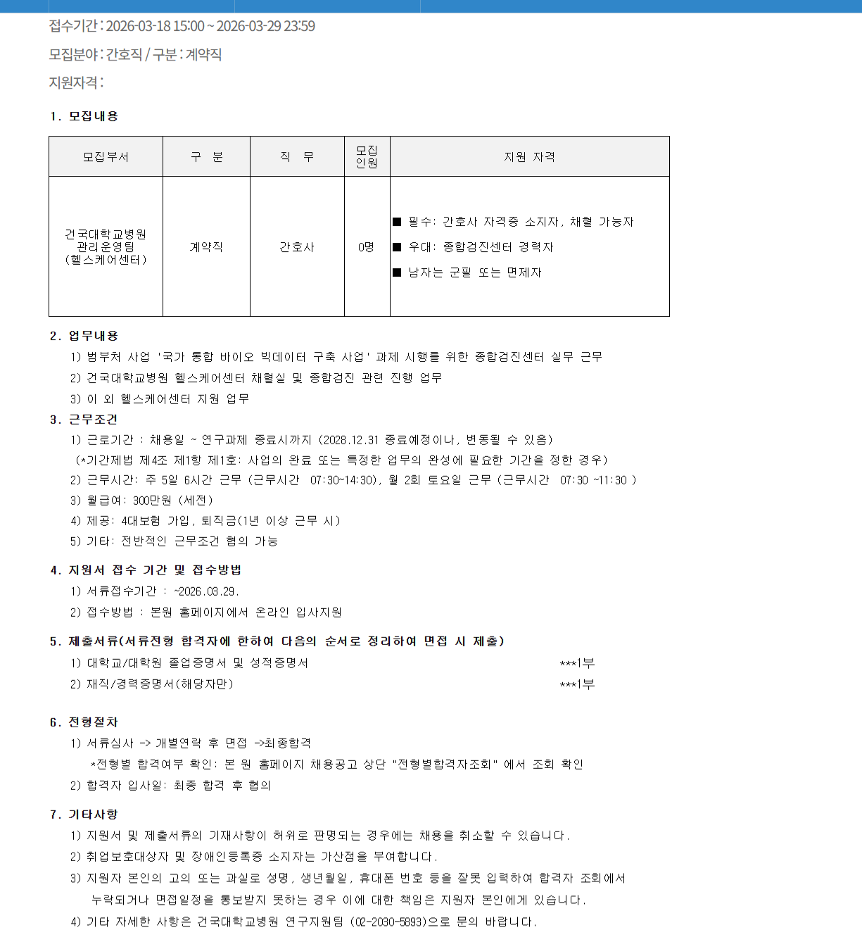 ¸ðÁýºÎ¼ ±¸ ºÐ Á÷ ¹« ¸ðÁý Àοø Áö¿ø ÀÚ°Ý °Ç±¹´ëÇб³º´¿ø °ü¸®¿î¿µÆÀ (ÇコÄɾÅÍ) °è¾àÁ÷ °£È£»ç 0¸í ¡á Çʼö: °£È£»ç ÀÚ°ÝÁõ ¼ÒÁöÀÚ, äÇ÷ °¡´ÉÀÚ ¡á ¿ì´ë: Á¾ÇÕ°ËÁø¼¾ÅÍ °æ·ÂÀÚ ¡á ³²ÀÚ´Â ±ºÇÊ ¶Ç´Â ¸éÁ¦ÀÚ