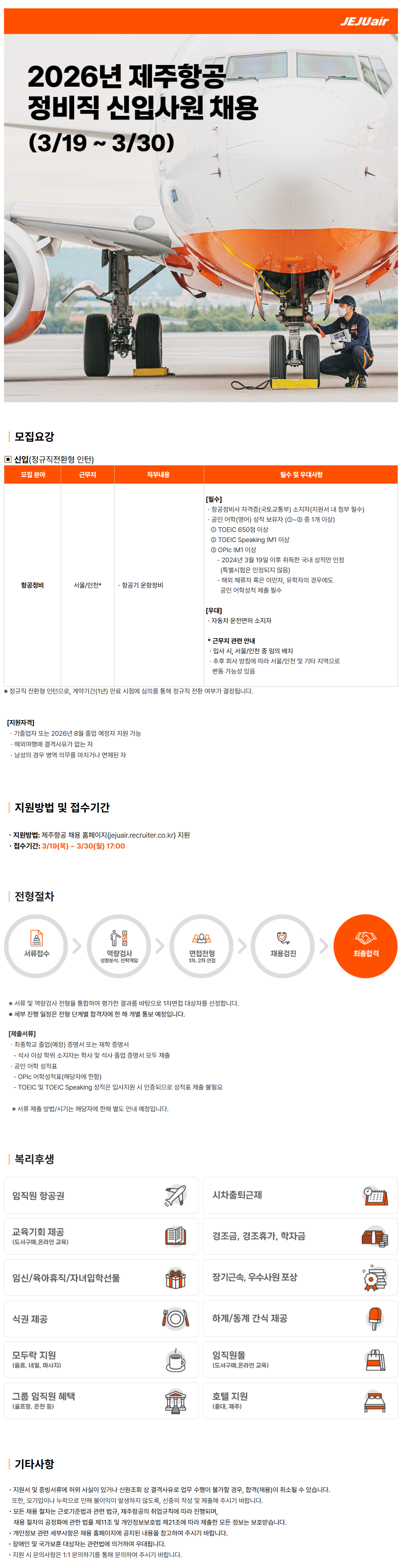 £ü¸ðÁý¿ä°­ ¢Ã ½ÅÀÔ(Á¤±ÔÁ÷ÀüȯÇü ÀÎÅÏ) ¸ðÁý ºÐ¾ß ±Ù¹«Áö Á÷¹«³»¿ë Çʼö ¹× ¿ì´ë»çÇ× Ç×°øÁ¤ºñ ¼­¿ï/ÀÎõ* ¤ýÇ×°ø±â ¿îÇ×Á¤ºñ [Çʼö] ¤ýÇ×°øÁ¤ºñ»ç ÀÚ°ÝÁõ(±¹Åä±³ÅëºÎ) ¼ÒÁöÀÚ(Áö¿ø¼­ ³» ÷ºÎ Çʼö) ¤ý°øÀÎ ¾îÇÐ(¿µ¾î) ¼ºÀû º¸À¯ÀÚ (¨ç~¨é Áß 1°³ ÀÌ»ó) ¨ç TOEIC 650Á¡ ÀÌ»ó ¨è TOEIC Speaking IM1 ÀÌ»ó ¨é OPIc IM1 ÀÌ»ó - 2024³â 3¿ù 19ÀÏ ÀÌÈÄ ÃëµæÇÑ ±¹³» ¼ºÀû¸¸ ÀÎÁ¤ (Ưº°½ÃÇèÀº ÀÎÁ¤µÇÁö ¾ÊÀ½) - ÇØ¿Ü ü·ùÀÚ È¤Àº À̹ÎÀÚ, À¯ÇÐÀÚÀÇ °æ¿ì¿¡µµ °øÀÎ ¾îÇмºÀû Á¦Ãâ Çʼö [¿ì´ë] ¤ýÀÚµ¿Â÷ ¿îÀü¸éÇã ¼ÒÁöÀÚ * ±Ù¹«Áö °ü·Ã ¾È³» ¤ýÀÔ»ç ½Ã, ¼­¿ï/ÀÎõ Áß ÀÓÀÇ ¹èÄ¡ ¤ýÃßÈÄ È¸»ç ¹æÄ§¿¡ µû¶ó ¼­¿ï/ÀÎõ ¹× ±âŸ Áö¿ªÀ¸·Î º¯µ¿ °¡´É¼º ÀÖÀ½ ¡Ø Á¤±ÔÁ÷ ÀüȯÇü ÀÎÅÏÀ¸·Î, °è¾à±â°£(1³â) ¸¸·á ½ÃÁ¡¿¡ ½ÉÀǸ¦ ÅëÇØ Á¤±ÔÁ÷ Àüȯ ¿©ºÎ°¡ °áÁ¤µË´Ï´Ù. [Áö¿øÀÚ°Ý] ¤ý±âÁ¹¾÷ÀÚ ¶Ç´Â 2026³â 8¿ù Á¹¾÷ ¿¹Á¤ÀÚ Áö¿ø °¡´É ¤ýÇØ¿Ü¿©Çà¿¡ °á°Ý»çÀ¯°¡ ¾ø´Â ÀÚ ¤ý³²¼ºÀÇ °æ¿ì º´¿ª Àǹ«¸¦ ¸¶Ä¡°Å³ª ¸éÁ¦µÈ ÀÚ £üÁö¿ø¹æ¹ý ¹× Á¢¼ö±â°£ ¤ý​Áö¿ø¹æ¹ý: ​Á¦ÁÖÇ×°ø ä¿ë ȨÆäÀÌÁö(jejuair.recruiter.co.kr) Áö¿ø ¤ýÁ¢¼ö±â°£: 3/19(¸ñ) ~ 3/30(¿ù) 17:00