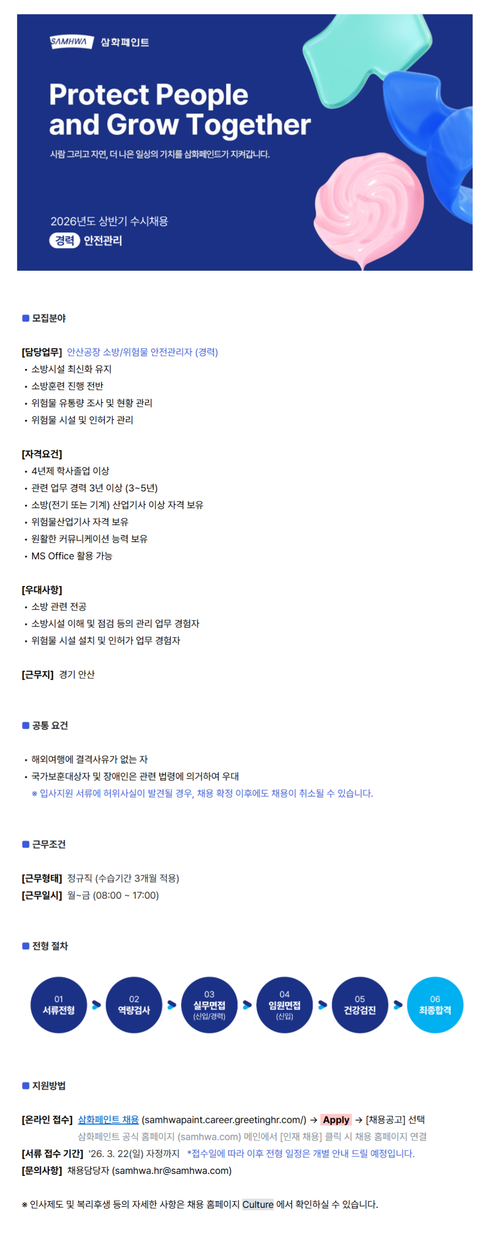 [ÀÚ°Ý¿ä°Ç] 4³âÁ¦ ÇлçÁ¹¾÷ ÀÌ»ó °ü·Ã ¾÷¹« °æ·Â 3³â ÀÌ»ó (3~5³â) ¼Ò¹æ(Àü±â ¶Ç´Â ±â°è) »ê¾÷±â»ç ÀÌ»ó ÀÚ°Ý º¸À¯ À§Çè¹°»ê¾÷±â»ç ÀÚ°Ý º¸À¯ ¿øÈ°ÇÑ Ä¿¹Â´ÏÄÉÀÌ¼Ç ´É·Â º¸À¯ MS Office Ȱ¿ë °¡´É
