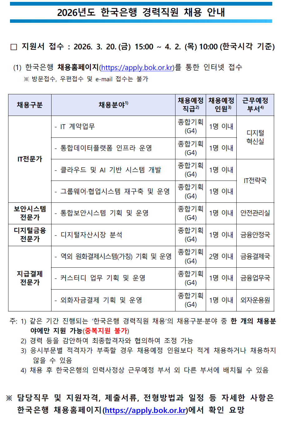 2026³âµµ Çѱ¹ÀºÇà °æ·ÂÁ÷¿ø ä¿ë ¾È³» ¡à Áö¿ø¼­ Á¢¼ö : 2026. 3. 20. (±Ý) 15:00 ~ 4. 2. (¸ñ) 10:00 (Çѱ¹½Ã°¢ ±âÁØ) (1) Çѱ¹ÀºÇà ä¿ëȨÆäÀÌÁö(https://apply.bok.or.kr)¸¦ ÅëÇÑ ÀÎÅÍ³Ý Á¢¼ö ¡Ø ¹æ¹®Á¢¼ö, ¿ìÆíÁ¢¼ö ¹× e-mail Á¢¼ö´Â ºÒ°¡ ä¿ë¿¹Á¤ ä¿ë¿¹Á¤ ±Ù¹«¿¹Á¤ ä¿ë±¸ºÐ ä¿ëºÐ¾ß1) Á÷±Þ2) Àοø3) ºÎ¼­4) Á¾ÇÕ±âȹ - IT °è¾à¾÷¹« 1¸í À̳» (G4) µðÁöÅÐ Çõ½Å½Ç Á¾ÇÕ±âȹ - ÅëÇÕµ¥ÀÌÅÍÇ÷§Æû ÀÎÇÁ¶ó ¿î¿µ 1¸í À̳» (G4) ITÀü¹®°¡ Á¾ÇÕ±âȹ - Ŭ¶ó¿ìµå ¹× AI ±â¹Ý ½Ã½ºÅÛ °³¹ß 1¸í À̳» (G4) ITÀü·«±¹ Á¾ÇÕ±âȹ - ±×·ì¿þ¾î¡¤Çù¾÷½Ã½ºÅÛ À籸Ãà ¹× ¿î¿µ 1¸í À̳» (G4) º¸¾È½Ã½ºÅÛ Á¾ÇÕ±âȹ - ÅëÇÕº¸¾È½Ã½ºÅÛ ±âȹ ¹× ¿î¿µ 1¸í À̳» ¾ÈÀü°ü¸®½Ç Àü¹®°¡ (G4) µðÁöÅбÝÀ¶ Á¾ÇÕ±âȹ - µðÁöÅÐÀÚ»ê½ÃÀå ºÐ¼® 1¸í À̳» ±ÝÀ¶¾ÈÁ¤±¹ Àü¹®°¡ (G4) Á¾ÇÕ±âȹ - ¿ª¿Ü ¿øÈ­°áÁ¦½Ã½ºÅÛ(°¡Äª) ±âȹ ¹× ¿î¿µ 2¸í À̳» ±ÝÀ¶°áÁ¦±¹ (G4) Áö±Þ°áÁ¦ Á¾ÇÕ±âȹ - Ä¿½ºÅ͵ð ¾÷¹« ±âȹ ¹× ¿î¿µ 1¸í À̳» ±ÝÀ¶¾÷¹«±¹ Àü¹®°¡ (G4) Á¾ÇÕ±âȹ - ¿ÜÈ­ÀڱݰáÁ¦ ±âȹ ¹× ¿î¿µ 1¸í À̳» ¿ÜÀÚ¿î¿ë¿ø (G4) ÁÖ: 1) °°Àº ±â°£ ÁøÇàµÇ´Â 'Çѱ¹ÀºÇà °æ·ÂÁ÷¿ø ä¿ë'ÀÇ Ã¤¿ë±¸ºÐ¡¤ºÐ¾ß Áß ÇÑ °³ÀÇ Ã¤¿ëºÐ ¾ß¿¡¸¸ Áö¿ø °¡´É(Áߺ¹Áö¿ø ºÒ°¡) 2) °æ·Â µîÀ» °¨¾ÈÇÏ¿© ÃÖÁ¾ÇÕ°ÝÀÚ¿Í ÇùÀÇÇÏ¿© Á¶Á¤ °¡´É 3) ÀÀ½ÃºÎ¹®º° Àû°ÝÀÚ°¡ ºÎÁ·ÇÒ °æ¿ì ä¿ë¿¹Á¤ Àοøº¸´Ù Àû°Ô ä¿ëÇϰųª ä¿ëÇÏÁö ¾ÊÀ» ¼ö ÀÖÀ½ 4) ä¿ë ÈÄ Çѱ¹ÀºÇàÀÇ Àη»çÁ¤»ó ±Ù¹«¿¹Á¤ ºÎ¼­ ¿Ü ´Ù¸¥ ºÎ¼­¿¡ ¹èÄ¡µÉ ¼ö ÀÖÀ½ ¡Ø ´ã´çÁ÷¹« ¹× Áö¿øÀÚ°Ý, Á¦Ãâ¼­·ù, ÀüÇü¹æ¹ý°ú ÀÏÁ¤ µî ÀÚ¼¼ÇÑ »çÇ×Àº Çѱ¹ÀºÇà ä¿ëȨÆäÀÌÁö(https://apply.hok.or.kr)¿¡¼­ È®ÀÎ ¿ä¸Á
