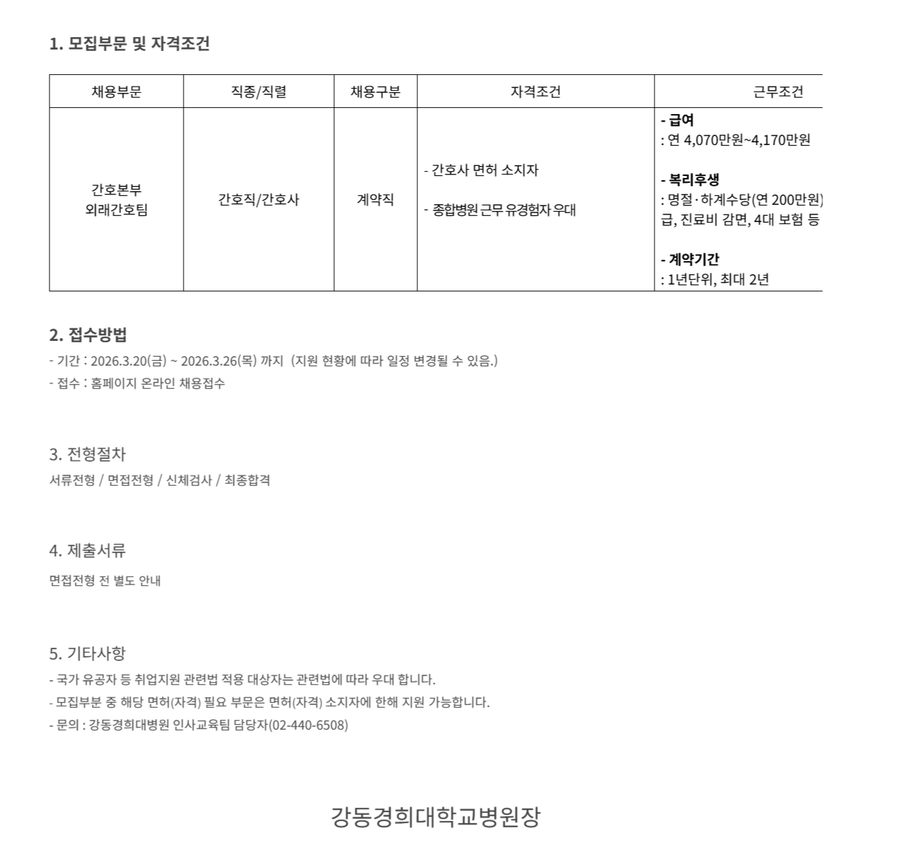 1. ¸ðÁýºÎ¹® ¹× ÀÚ°ÝÁ¶°Ç ä¿ëºÎ¹® Á÷Á¾/Á÷·Ä ä¿ë±¸ºÐ ÀÚ°ÝÁ¶°Ç ±Ù¹«Á¶°Ç ¸ðÁýÀοø °£È£º»ºÎ ¿Ü·¡°£È£ÆÀ °£È£Á÷/°£È£»ç °è¾àÁ÷ - °£È£»ç ¸éÇã ¼ÒÁöÀÚ - Á¾ÇÕº´¿ø ±Ù¹« À¯°æÇèÀÚ ¿ì´ë - ±Þ¿© : ¿¬ 4,070¸¸¿ø~4,170¸¸¿ø - º¹¸®ÈÄ»ý : ¸íÀý¡¤Çϰè¼ö´ç(¿¬ 200¸¸¿ø) º°µµ Áö±Þ, Áø·áºñ °¨¸é, 4´ë º¸Çè µî - °è¾à±â°£ : 1³â´ÜÀ§, ÃÖ´ë 2³â 0¸í 2. Á¢¼ö¹æ¹ý - ±â°£ : 2026.3.20(±Ý) ~ 2026.3.26(¸ñ) ±îÁö (Áö¿ø ÇöȲ¿¡ µû¶ó ÀÏÁ¤ º¯°æµÉ ¼ö ÀÖÀ½.) - Á¢¼ö : ȨÆäÀÌÁö ¿Â¶óÀΠä¿ëÁ¢¼ö ​ ​ 3. ÀüÇüÀýÂ÷ ¼­·ùÀüÇü / ¸éÁ¢ÀüÇü / ½Åü°Ë»ç / ÃÖÁ¾ÇÕ°Ý​ ​ ​ 4. Á¦Ãâ¼­·ù ​¸éÁ¢ÀüÇü Àü º°µµ ¾È³» ​ ​ 5. ±âŸ»çÇ× - ±¹°¡ À¯°øÀÚ µî Ãë¾÷Áö¿ø °ü·Ã¹ý Àû¿ë ´ë»óÀÚ´Â °ü·Ã¹ý¿¡ µû¶ó ¿ì´ë ÇÕ´Ï´Ù. ​ - ¸ðÁýºÎºÐ Áß ÇØ´ç ¸éÇã(ÀÚ°Ý) ÇÊ¿ä ºÎ¹®Àº ¸éÇã(ÀÚ°Ý) ¼ÒÁöÀÚ¿¡ ÇÑÇØ Áö¿ø °¡´ÉÇÕ´Ï´Ù.​ - ​¹®ÀÇ : °­µ¿°æÈñ´ëº´¿ø Àλ米À°ÆÀ ´ã´çÀÚ(***-****-****) ​ ​ °­µ¿°æÈñ´ëÇб³º´¿øÀå