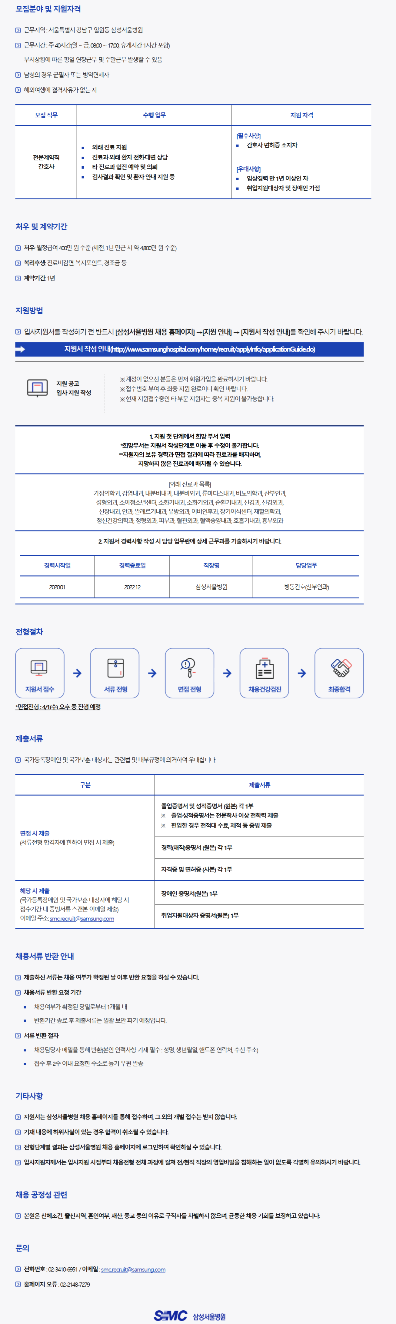 ¸ðÁý Á÷¹« ¼öÇà ¾÷¹« Áö¿ø ÀÚ°Ý Àü¹®°è¾àÁ÷ °£È£»ç ¿Ü·¡ Áø·á Áö¿ø Áø·á°ú ¿Ü·¡ ȯÀÚ ÀüÈ­¡¤´ë¸é »ó´ã Ÿ Áø·á°ú ÇùÁø ¿¹¾à ¹× ÀÇ·Ú °Ë»ç°á°ú È®ÀÎ ¹× ȯÀÚ ¾È³» Áö¿ø µî [Çʼö»çÇ×] °£È£»ç ¸éÇãÁõ ¼ÒÁöÀÚ [¿ì´ë»çÇ×] ÀÓ»ó°æ·Â ¸¸ 1³â ÀÌ»óÀÎ ÀÚ Ãë¾÷Áö¿ø´ë»óÀÚ ¹× Àå¾ÖÀÎ °¡Á¡
