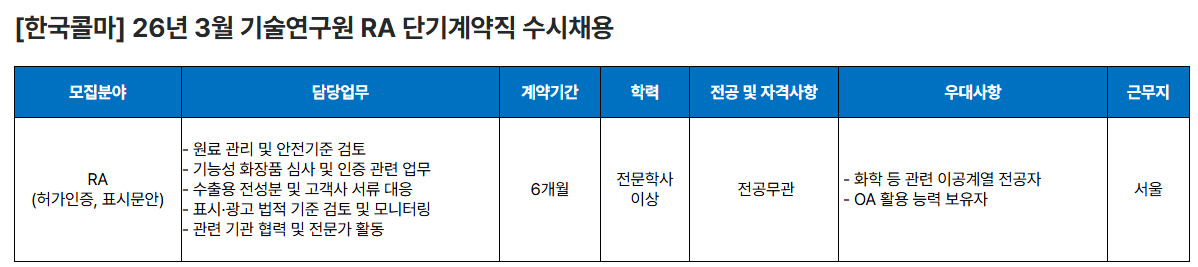 [Çѱ¹Äݸ¶] 26³â 3¿ù ±â¼ú¿¬±¸¿ø RA ´Ü±â°è¾àÁ÷ ¼ö½Ãä¿ë