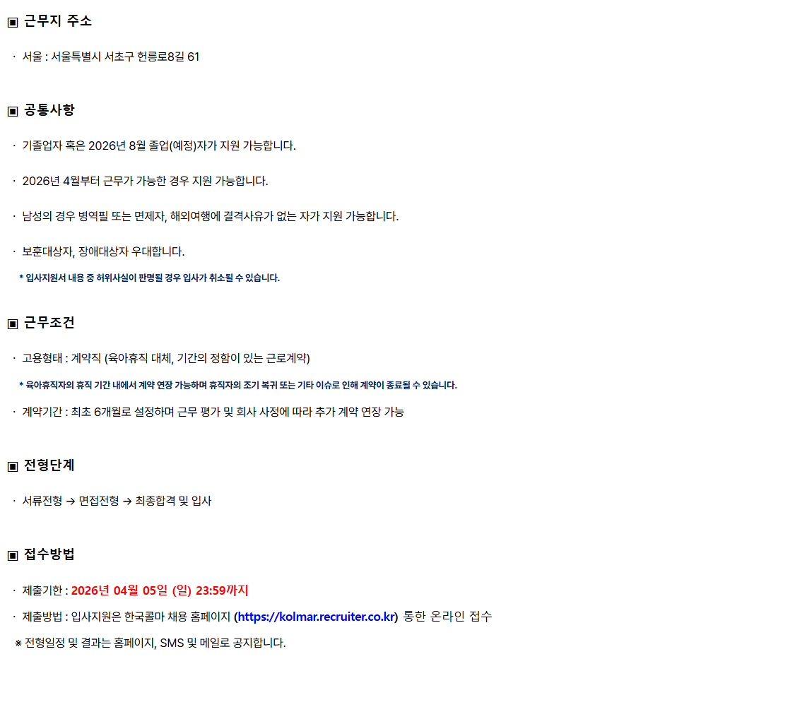 ¤ý Á¦Ãâ¹æ¹ý : ÀÔ»çÁö¿øÀº Çѱ¹Äݸ¶ ä¿ë ȨÆäÀÌÁö (https://kolmar.recruiter.co.kr) ÅëÇÑ ¿Â¶óÀÎ Á¢¼ö
