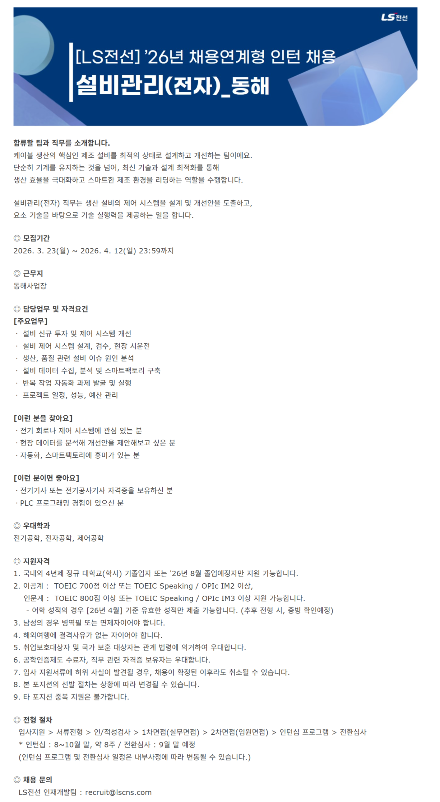 [LSÀü¼±] '26³â ä¿ë¿¬°èÇü ÀÎÅÏ Ã¤¿ë - ¼³ºñ°ü¸®(ÀüÀÚ)