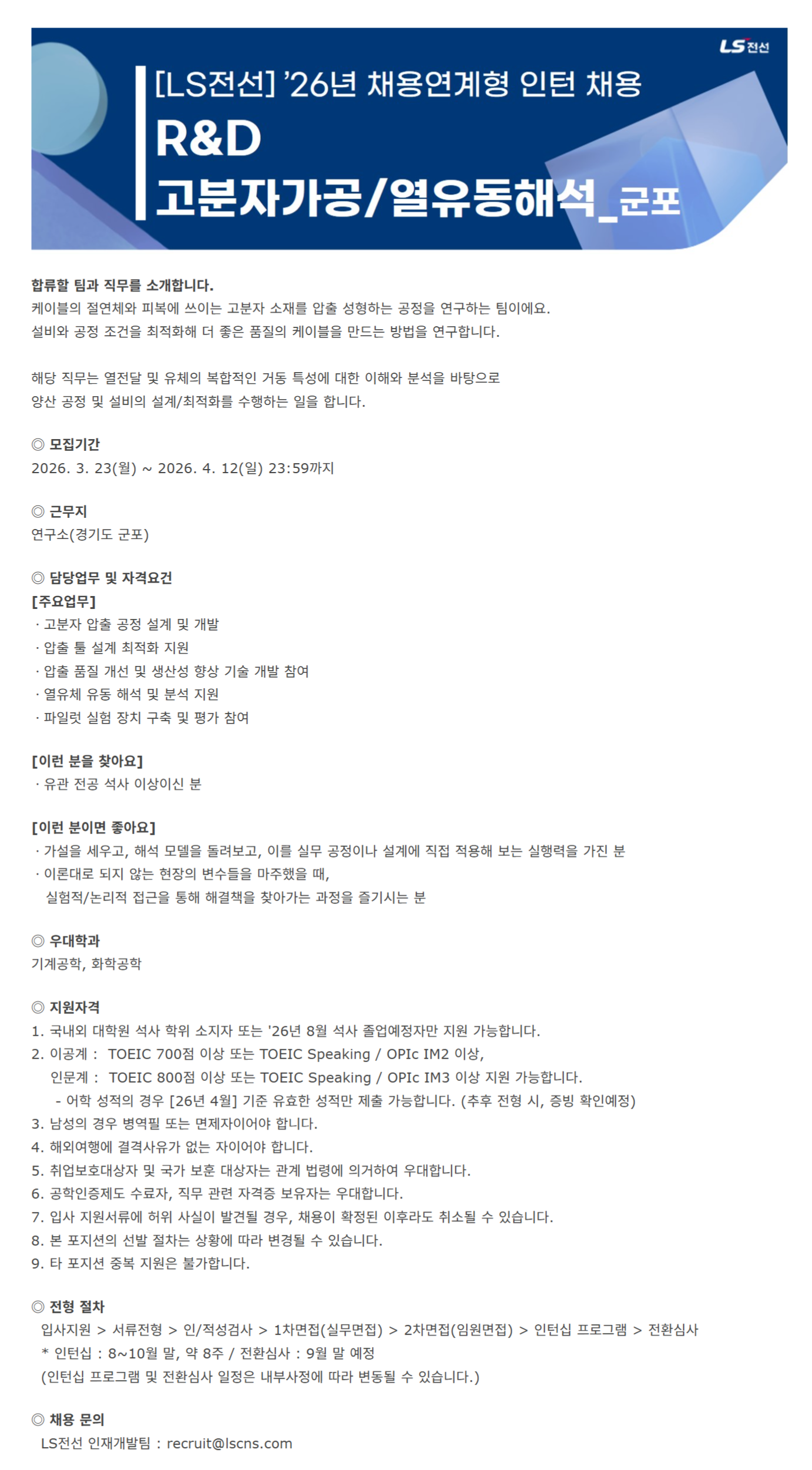 [LSÀü¼±] '26³â ä¿ë¿¬°èÇü ÀÎÅÏ Ã¤¿ë - R&D(°íºÐÀÚ°¡°ø/¿À¯µ¿Çؼ®)