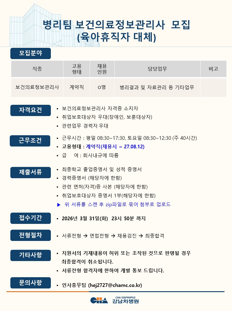 [°³²Â÷º´¿ø] º´¸®ÆÀ º¸°ÇÀÇ·áÁ¤º¸°ü¸®»ç ¸ðÁý(À°¾ÆÈÞÁ÷ÀÚ ´ëü)