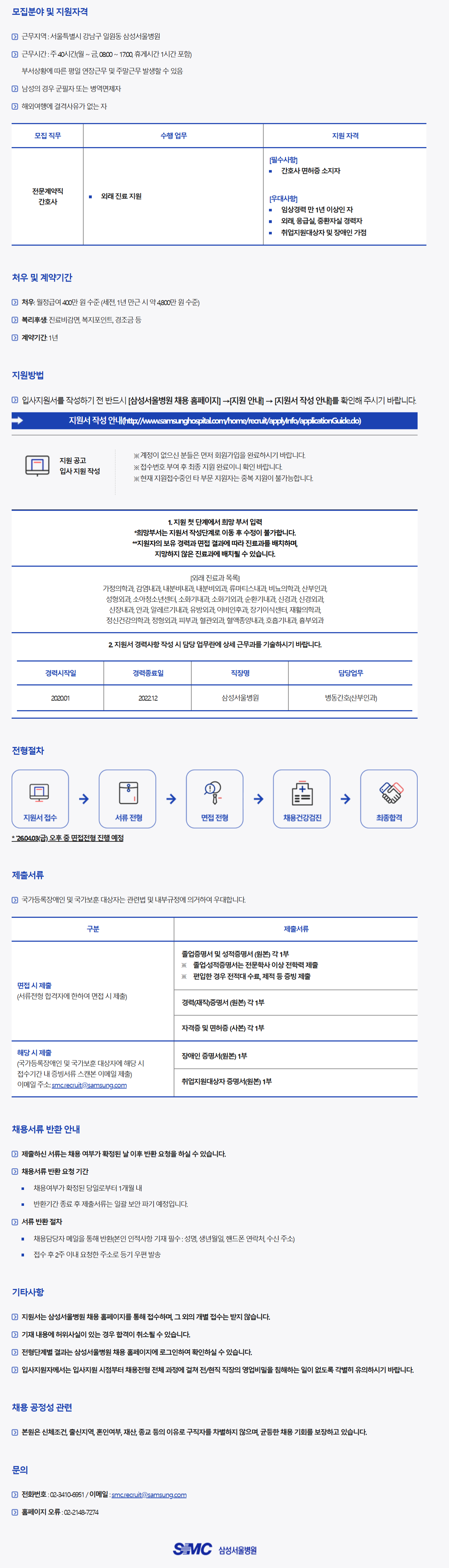 ¸ðÁý Á÷¹« ¼öÇà ¾÷¹« Áö¿ø ÀÚ°Ý Àü¹®°è¾àÁ÷ °£È£»ç ¿Ü·¡ Áø·á Áö¿ø [Çʼö»çÇ×] °£È£»ç ¸éÇãÁõ ¼ÒÁöÀÚ [¿ì´ë»çÇ×] ÀÓ»ó°æ·Â ¸¸ 1³â ÀÌ»óÀÎ ÀÚ ¿Ü·¡, ÀÀ±Þ½Ç, ÁßȯÀÚ½Ç °æ·ÂÀÚ Ãë¾÷Áö¿ø´ë»óÀÚ ¹× Àå¾ÖÀÎ °¡Á¡