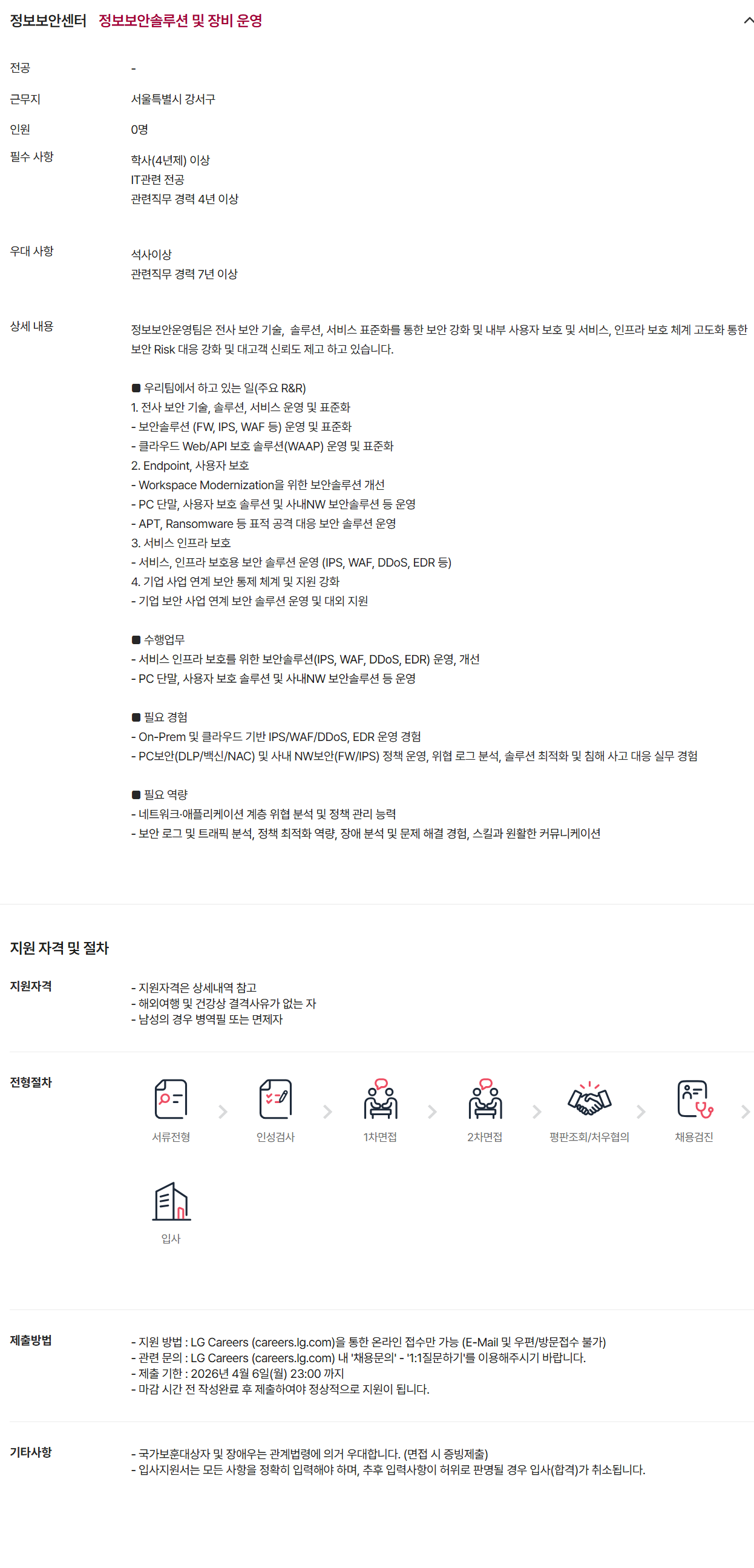 - PCº¸¾È(DLP/¹é½Å/NAC) ¹× »ç³» NWº¸¾È(FW/IPS) Á¤Ã¥ ¿î¿µ, À§Çù ·Î±× ºÐ¼®, ¼Ö·ç¼Ç ÃÖÀûÈ ¹× Ä§ÇØ »ç°í ´ëÀÀ ½Ç¹« °æÇè