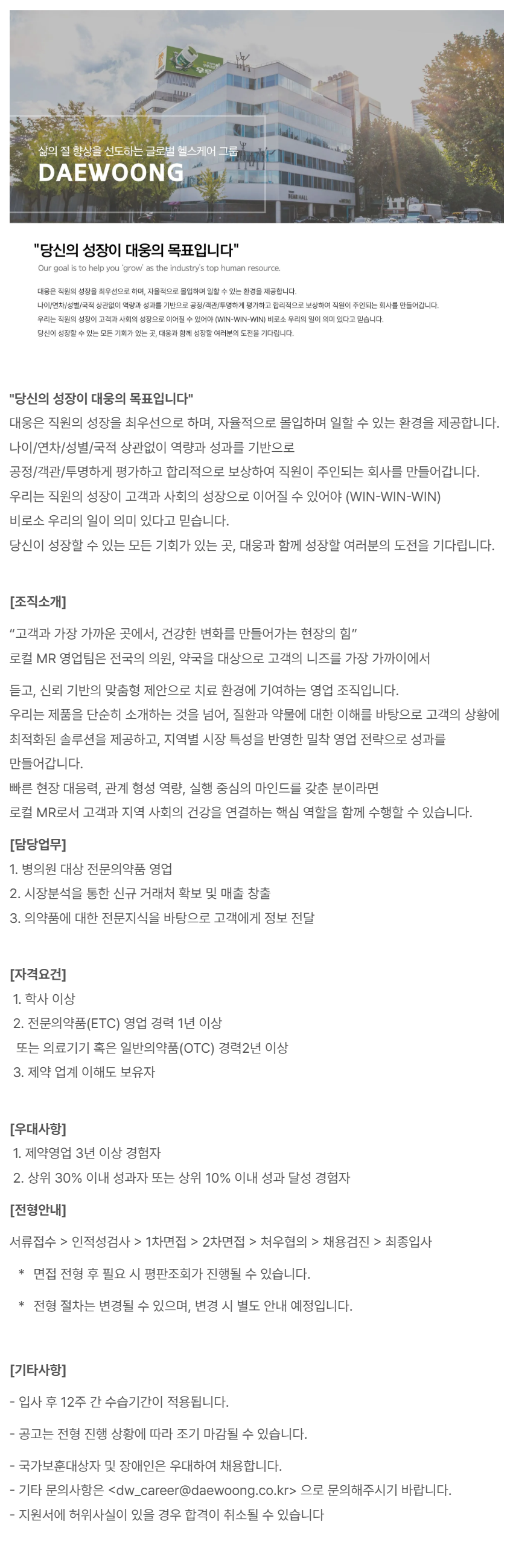 - ±âŸ ¹®ÀÇ»çÇ×Àº <dw_career@daewoong.co.kr******@*******.***> À¸·Î ¹®ÀÇÇØÁֽñ⠹ٶø´Ï´Ù.