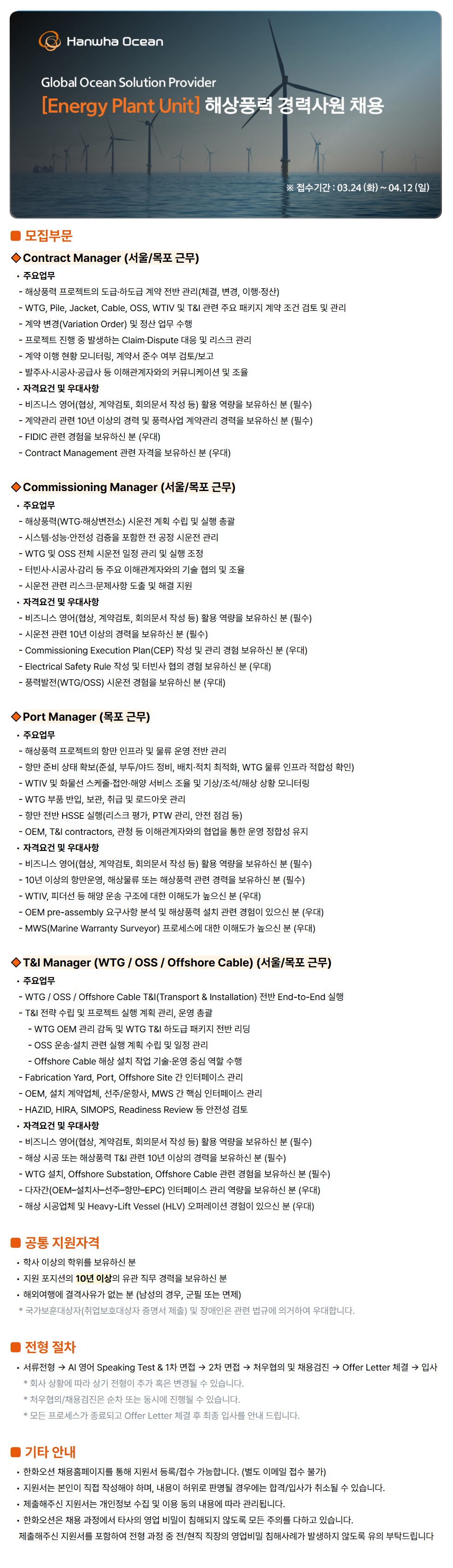 🔸T&I Manager (WTG / OSS / Offshore Cable) (¼¿ï/¸ñÆ÷ ±Ù¹«)