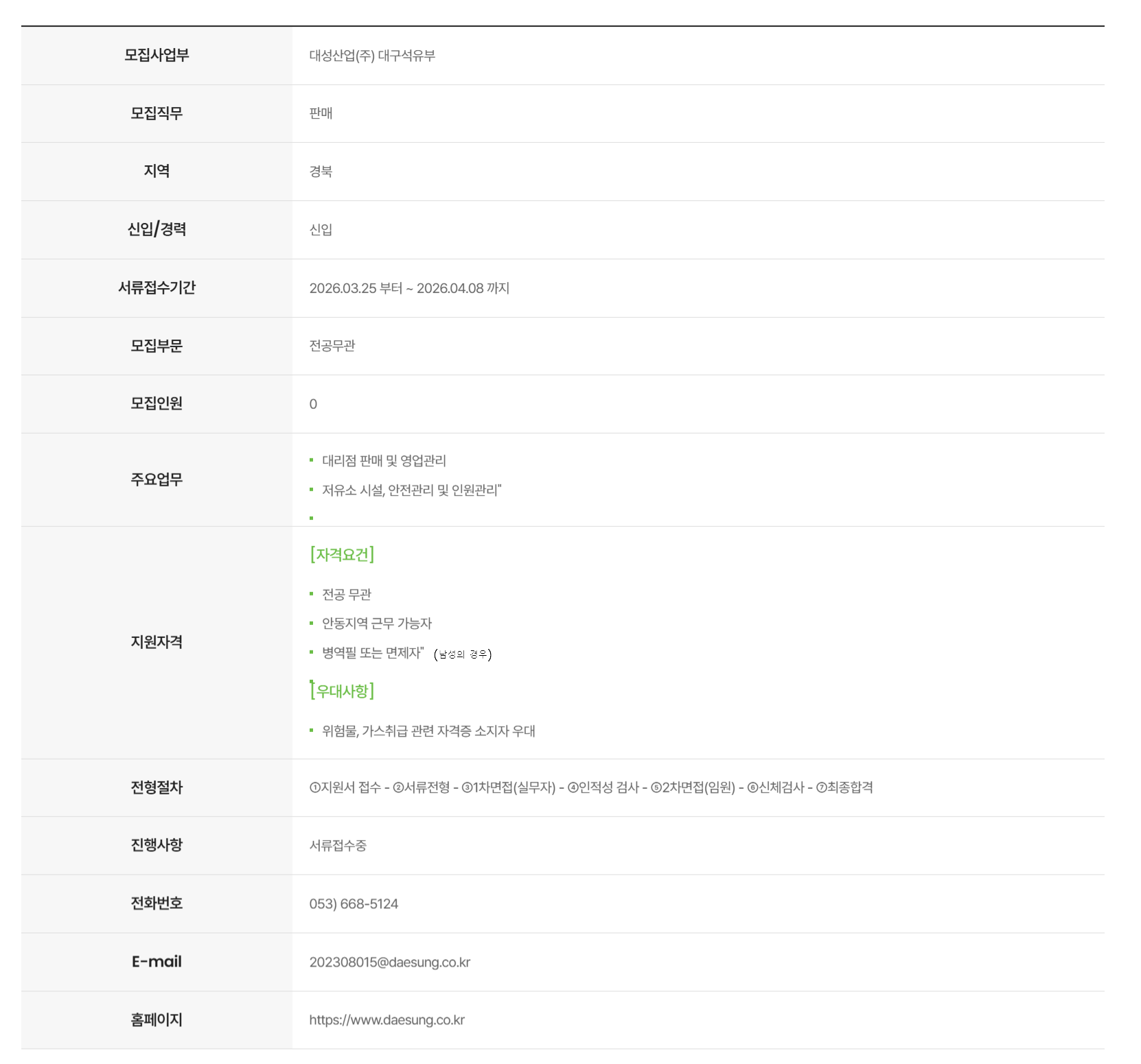 ´ë¼º»ê¾÷¢ß´ë±¸¼®À¯°¡½º»ç¾÷ºÎ ÆÇ¸Å(¿µ¾÷)°ü¸® ½ÅÀÔ»ç¿ø ä¿ë
