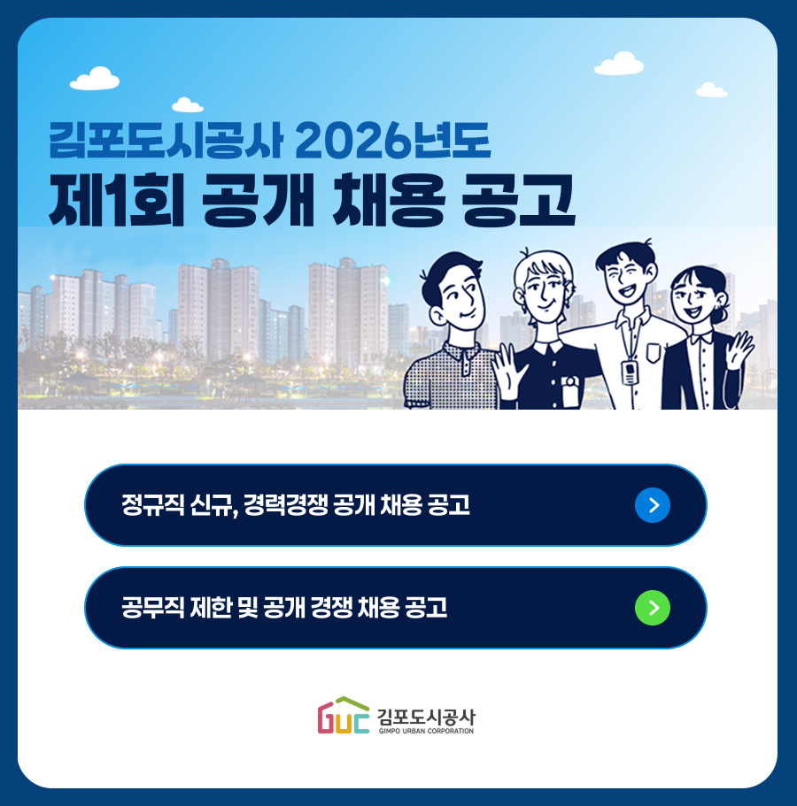 ±èÆ÷µµ½Ã°ø»ç 2026³âµµ Á¦1ȸ °ø°³ ä¿ë °ø°í Á¤±ÔÁ÷ ½Å±Ô, °æ·Â°æÀï °ø°³ ä¿ë °ø°í > °ø¹«Á÷ Á¦ÇÑ ¹× °ø°³ °æÀï ä¿ë °ø°í DUC ±èÆ÷µµ½Ã°ø»ç GIMPO URBAN CORPORATION
