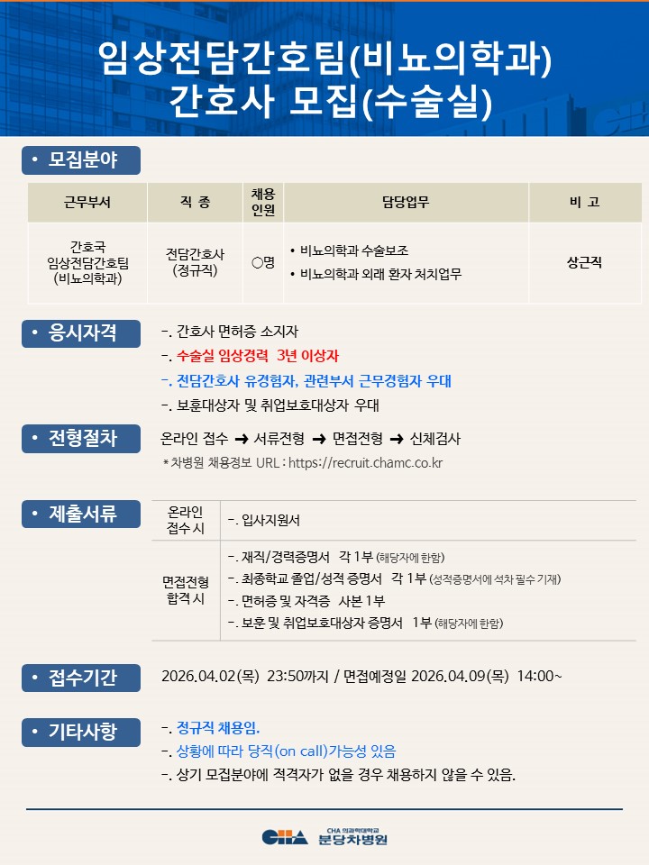 [ºÐ´çÂ÷º´¿ø] ÀÓ»óÀü´ã°£È£ÆÀ(ºñ´¢ÀÇÇаú) °£È£»ç ¸ðÁý(¼ö¼ú½Ç)