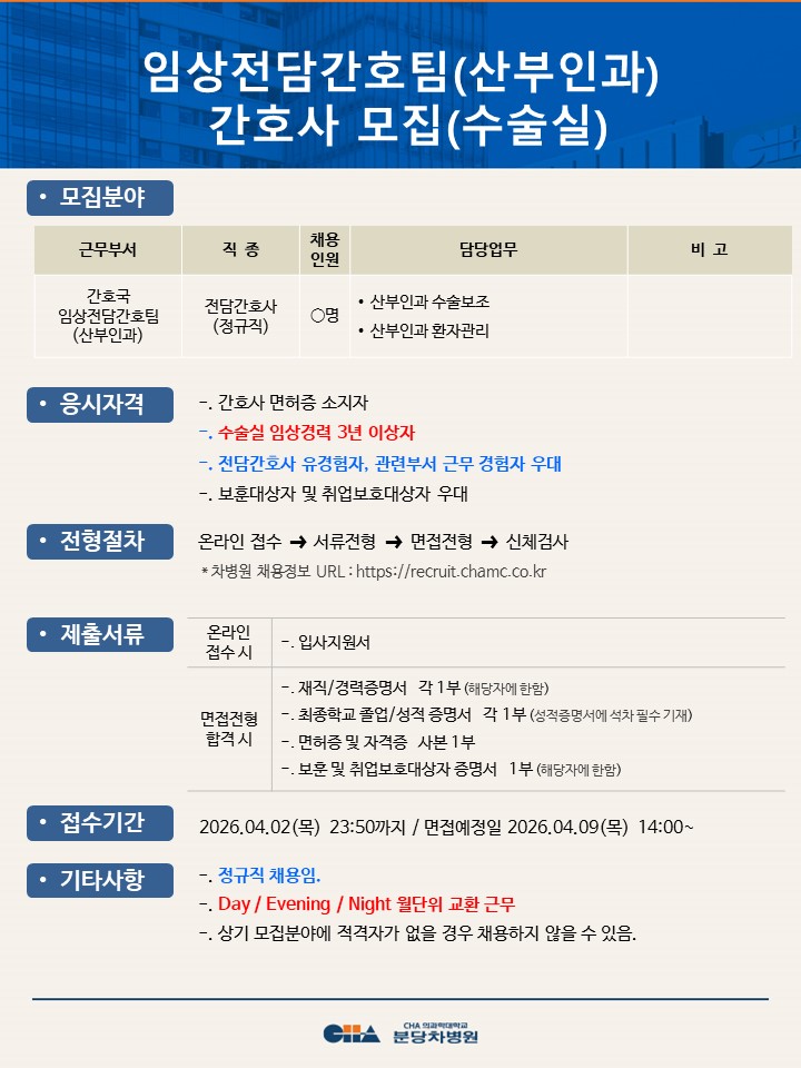 [ºÐ´çÂ÷º´¿ø] ÀÓ»óÀü´ã°£È£ÆÀ(»êºÎÀΰú) °£È£»ç ¸ðÁý(¼ö¼ú½Ç)