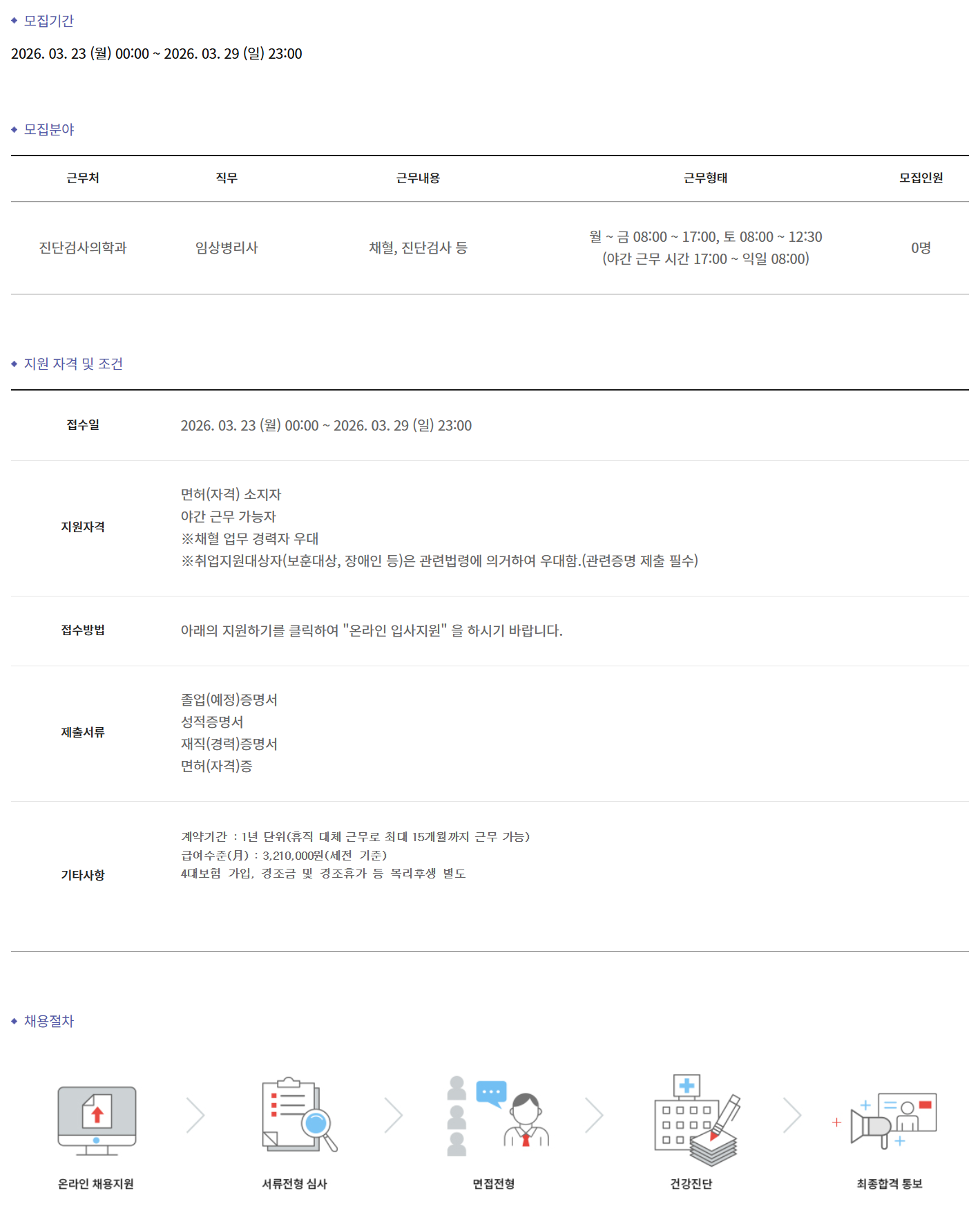 ±Ù¹«Ã³ Á÷¹« ±Ù¹«³»¿ë ±Ù¹«ÇüÅ ¸ðÁýÀοø Áø´Ü°Ë»çÀÇÇаú ÀÓ»óº´¸®»ç äÇ÷, Áø´Ü°Ë»ç µî ¿ù ~ ±Ý 08:00 ~ 17:00, Åä 08:00 ~ 12:30 (¾ß°£ ±Ù¹« ½Ã°£ 17:00 ~ ÀÍÀÏ 08:00) 0¸í