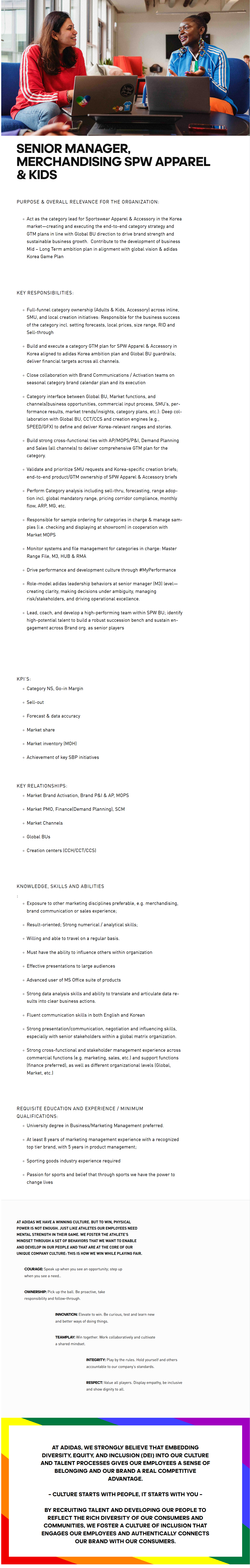Act as the category lead for Sportswear Apparel & Accessory in the Korea market—creating and executing the end-to-end category strategy and GTM plans in line with Global BU direction to drive brand strength and sustainable business growth. Contribute to the development of business Mid – Long Term ambition plan in alignment with global vision & adidas Korea Game Plan