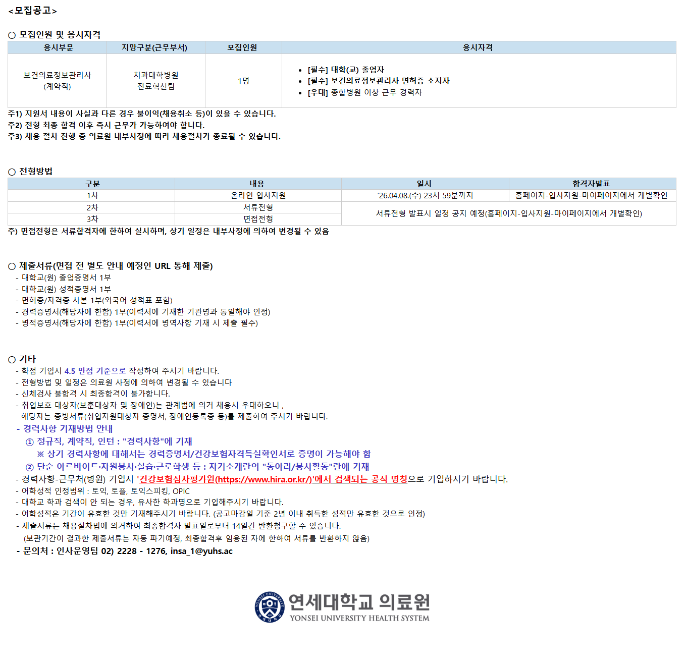 <¸ðÁý°ø°í> ¡Û ¸ðÁýÀοø ¹× ÀÀ½ÃÀÚ°Ý ÀÀ½ÃºÎ¹® Áö¸Á±¸ºÐ(±Ù¹«ºÎ¼­) ¸ðÁýÀοø ÀÀ½ÃÀÚ°Ý º¸°ÇÀÇ·áÁ¤º¸°ü¸®»ç (°è¾àÁ÷) Ä¡°ú´ëÇк´¿ø Áø·áÇõ½ÅÆÀ 1¸í [Çʼö] ´ëÇÐ(±³) Á¹¾÷ÀÚ [Çʼö] º¸°ÇÀÇ·áÁ¤º¸°ü¸®»ç ¸éÇãÁõ ¼ÒÁöÀÚ [¿ì´ë] Á¾ÇÕº´¿ø ÀÌ»ó ±Ù¹« °æ·ÂÀÚ ÁÖ1) Áö¿ø¼­ ³»¿ëÀÌ »ç½Ç°ú ´Ù¸¥ °æ¿ì ºÒÀÌÀÍ(ä¿ëÃë¼Ò µî)ÀÌ ÀÖÀ» ¼ö ÀÖ½À´Ï´Ù. ÁÖ2) ÀüÇü ÃÖÁ¾ ÇÕ°Ý ÀÌÈÄ Áï½Ã ±Ù¹«°¡ °¡´ÉÇÏ¿©¾ß ÇÕ´Ï´Ù. ÁÖ3) ä¿ë ÀýÂ÷ ÁøÇà Áß ÀÇ·á¿ø ³»ºÎ»çÁ¤¿¡ µû¶ó ä¿ëÀýÂ÷°¡ Á¾·áµÉ ¼ö ÀÖ½À´Ï´Ù. ¡Û ÀüÇü¹æ¹ý ±¸ºÐ ³»¿ë ÀϽà ÇÕ°ÝÀÚ¹ßÇ¥ 1Â÷ ¿Â¶óÀÎ ÀÔ»çÁö¿ø '26.04.08.(¼ö) 23½Ã 59ºÐ±îÁö ȨÆäÀÌÁö-ÀÔ»çÁö¿ø-¸¶ÀÌÆäÀÌÁö¿¡¼­ °³º°È®ÀÎ 2Â÷ ¼­·ùÀüÇü ¼­·ùÀüÇü ¹ßÇ¥½Ã ÀÏÁ¤ °øÁö ¿¹Á¤(ȨÆäÀÌÁö-ÀÔ»çÁö¿ø-¸¶ÀÌÆäÀÌÁö¿¡¼­ °³º°È®ÀÎ) 3Â÷ ¸éÁ¢ÀüÇü ÁÖ) ¸éÁ¢ÀüÇüÀº ¼­·ùÇÕ°ÝÀÚ¿¡ ÇÑÇÏ¿© ½Ç½ÃÇϸç, »ó±â ÀÏÁ¤Àº ³»ºÎ»çÁ¤¿¡ ÀÇÇÏ¿© º¯°æµÉ ¼ö ÀÖÀ½ ​ ¡Û Á¦Ãâ¼­·ù(¸éÁ¢ Àü º°µµ ¾È³» ¿¹Á¤ÀÎ URL ÅëÇØ Á¦Ãâ) - ​´ëÇб³(¿ø) Á¹¾÷Áõ¸í¼­ 1ºÎ - ´ëÇб³(¿ø) ¼ºÀûÁõ¸í¼­ 1ºÎ - ¸éÇãÁõ/ÀÚ°ÝÁõ »çº» 1ºÎ(¿Ü±¹¾î ¼ºÀûÇ¥ Æ÷ÇÔ) - °æ·ÂÁõ¸í¼­(ÇØ´çÀÚ¿¡ ÇÑÇÔ) 1ºÎ(À̷¼­¿¡ ±âÀçÇÑ ±â°ü¸í°ú µ¿ÀÏÇØ¾ß ÀÎÁ¤) - º´ÀûÁõ¸í¼­(ÇØ´çÀÚ¿¡ ÇÑÇÔ) 1ºÎ(À̷¼­¿¡ º´¿ª»çÇ× ±âÀç ½Ã Á¦Ãâ Çʼö) ¡Û ±âŸ - ÇÐÁ¡ ±âÀԽà 4.5 ¸¸Á¡ ±âÁØÀ¸·Î ÀÛ¼ºÇÏ¿© Áֽñ⠹ٶø´Ï´Ù. - ÀüÇü¹æ¹ý ¹× ÀÏÁ¤Àº ÀÇ·á¿ø »çÁ¤¿¡ ÀÇÇÏ¿© º¯°æµÉ ¼ö ÀÖ½À´Ï´Ù - ½Åü°Ë»ç ºÒÇÕ°Ý ½Ã ÃÖÁ¾ÇÕ°ÝÀÌ ºÒ°¡ÇÕ´Ï´Ù. - Ãë¾÷º¸È£ ´ë»óÀÚ(º¸ÈÆ´ë»óÀÚ ¹× Àå¾ÖÀÎ)´Â °ü°è¹ý¿¡ ÀǰŠä¿ë½Ã ¿ì´ëÇÏ¿À´Ï , ÇØ´çÀÚ´Â Áõºù¼­·ù(Ãë¾÷Áö¿ø´ë»óÀÚ Áõ¸í¼­, Àå¾ÖÀεî·ÏÁõ µî)¸¦ Á¦ÃâÇÏ¿© Áֽñ⠹ٶø´Ï´Ù. - °æ·Â»çÇ× ±âÀç¹æ¹ý ¾È³» ¨ç Á¤±ÔÁ÷, °è¾àÁ÷, ÀÎÅÏ : "°æ·Â»çÇ×"¿¡ ±âÀç ¡Ø »ó±â °æ·Â»çÇ׿¡ ´ëÇØ¼­´Â °æ·ÂÁõ¸í¼­/°Ç°­º¸ÇèÀڰݵæ½ÇÈ®Àμ­·Î Áõ¸íÀÌ °¡´ÉÇØ¾ß ÇÔ ¨è ´Ü¼ø ¾Æ¸£¹ÙÀÌÆ®¡¤ÀÚ¿øºÀ»ç¡¤½Ç½À¡¤±Ù·ÎÇлý µî : ÀÚ±â¼Ò°³¶õÀÇ "µ¿¾Æ¸®/ºÀ»çȰµ¿"¶õ¿¡ ±âÀç - °æ·Â»çÇ×-±Ù¹«Ã³(º´¿ø) ±âÀԽà '°Ç°­º¸Çè½É»çÆò°¡¿ø(https://www.hira.or.kr/)'¿¡¼­ °Ë»öµÇ´Â °ø½Ä ¸íĪÀ¸·Î ±âÀÔÇϽñ⠹ٶø´Ï´Ù. - ¾îÇмºÀû ÀÎÁ¤¹üÀ§ : ÅäÀÍ, ÅäÇÃ, ÅäÀͽºÇÇÅ·, OPIC - ´ëÇб³ Çаú °Ë»öÀÌ ¾È µÇ´Â °æ¿ì, À¯»çÇÑ Çаú¸íÀ¸·Î ±âÀÔÇØÁֽñ⠹ٶø´Ï´Ù. - ¾îÇмºÀûÀº ±â°£ÀÌ À¯È¿ÇÑ °Í¸¸ ±âÀçÇØÁֽñ⠹ٶø´Ï´Ù. (°ø°í¸¶°¨ÀÏ ±âÁØ 2³â À̳» ÃëµæÇÑ ¼ºÀû¸¸ À¯È¿ÇÑ °ÍÀ¸·Î ÀÎÁ¤) - Á¦Ãâ¼­·ù´Â ä¿ëÀýÂ÷¹ý¿¡ ÀǰÅÇÏ¿© ÃÖÁ¾ÇÕ°ÝÀÚ ¹ßÇ¥ÀϷκÎÅÍ 14Àϰ£ ¹Ýȯû±¸ÇÒ ¼ö ÀÖ½À´Ï´Ù. (º¸°ü±â°£ÀÌ °á°úÇÑ Á¦Ãâ¼­·ù´Â ÀÚµ¿ ÆÄ±â¿¹Á¤, ÃÖÁ¾ÇÕ°ÝÈÄ ÀÓ¿ëµÈ ÀÚ¿¡ ÇÑÇÏ¿© ¼­·ù¸¦ ¹ÝȯÇÏÁö ¾ÊÀ½) - ¹®ÀÇó : Àλç¿î¿µÆÀ ***-****-****, ******@*******.***