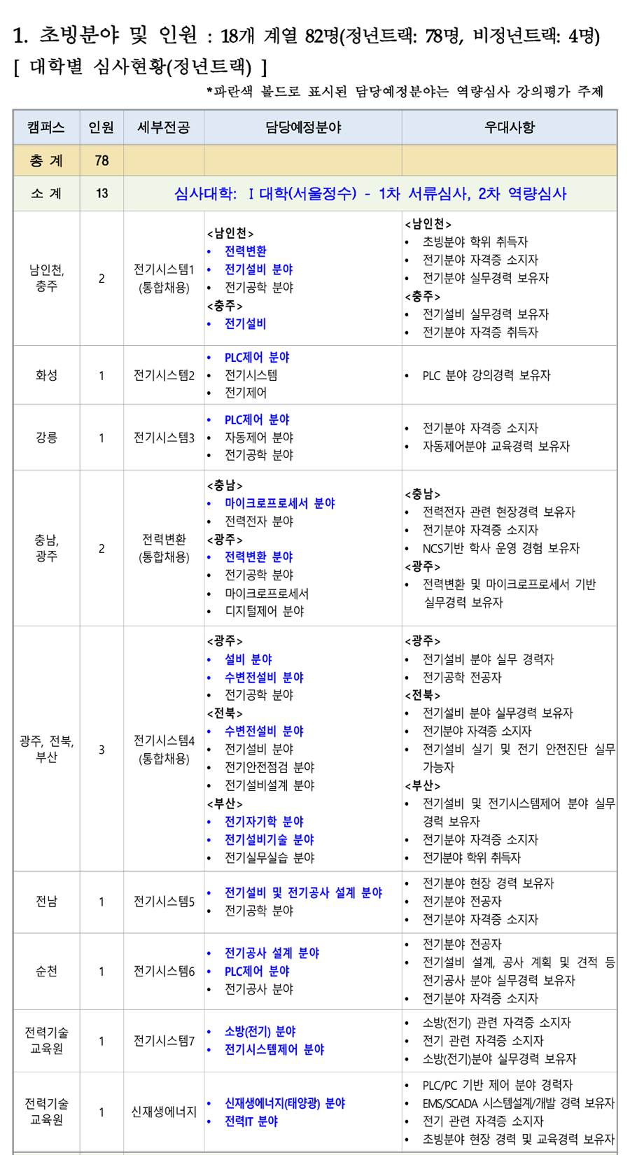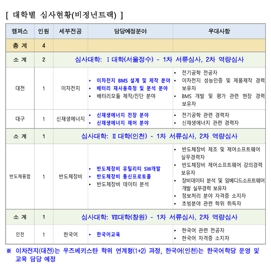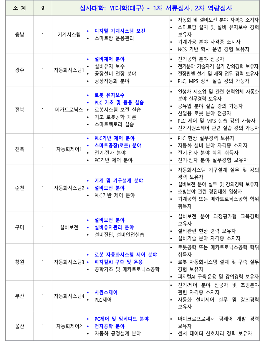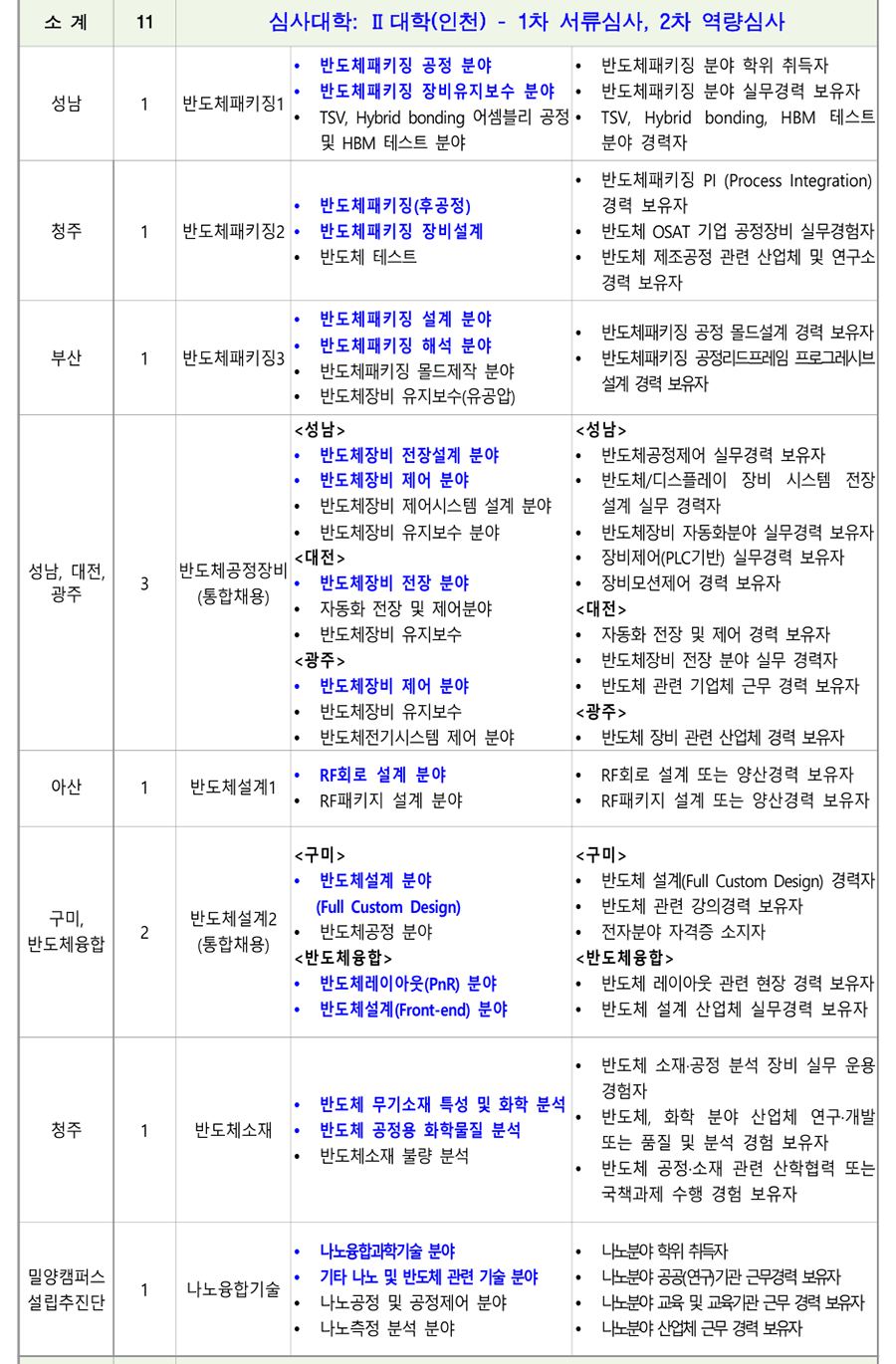 1. ÃʺùºÐ¾ß ¹× Àοø : 18°³ °è¿ 82¸í(Á¤³âÆ®·¢: 78¸í, ºñÁ¤³âÆ®·¢: 4¸í) [ ´ëÇк° ½É»çÇöȲ(Á¤³âÆ®·¢) ] *ÆÄ¶õ»ö º¼µå·Î Ç¥½ÃµÈ ´ã´ç¿¹Á¤ºÐ¾ß´Â ¿ª·®½É»ç °ÀÇÆò°¡ ÁÖÁ¦ Ä·ÆÛ½º Àοø ¼¼ºÎÀü°ø ´ã´ç¿¹Á¤ºÐ¾ß ¿ì´ë»çÇ× ÃÑ °è 78 ¼Ò °è 13 ½É»ç´ëÇÐ: I ´ëÇÐ(¼¿ïÁ¤¼ö) - 1Â÷ ¼·ù½É»ç, 2Â÷ ¿ª·®½É»ç <³²ÀÎõ> <³²ÀÎõ> ÃʺùºÐ¾ß ÇÐÀ§ ÃëµæÀÚ Àü·Âº¯È¯ Àü±âºÐ¾ß ÀÚ°ÝÁõ ¼ÒÁöÀÚ ³²ÀÎõ, Àü±â½Ã½ºÅÛ1 Àü±â¼³ºñ ºÐ¾ß 2 Àü±âºÐ¾ß ½Ç¹«°æ·Â º¸À¯ÀÚ ÃæÁÖ (ÅëÇÕä¿ë) Àü±â°øÇÐ ºÐ¾ß <ÃæÁÖ> <ÃæÁÖ> Àü±â¼³ºñ ½Ç¹«°æ·Â º¸À¯ÀÚ Àü±â¼³ºñ ¡¤ Àü±âºÐ¾ß ÀÚ°ÝÁõ ÃëµæÀÚ ¡¤ PLCÁ¦¾î ºÐ¾ß ȼº 1 Àü±â½Ã½ºÅÛ2 ¡¤ Àü±â½Ã½ºÅÛ PLC ºÐ¾ß °Àǰæ·Â º¸À¯ÀÚ ¡¤ Àü±âÁ¦¾î PLCÁ¦¾î ºÐ¾ß Àü±âºÐ¾ß ÀÚ°ÝÁõ ¼ÒÁöÀÚ °¸ª 1 Àü±â½Ã½ºÅÛ3 ¡¤ ÀÚµ¿Á¦¾î ºÐ¾ß ¡¤ ÀÚµ¿Á¦¾îºÐ¾ß ±³À°°æ·Â º¸À¯ÀÚ Àü±â°øÇÐ ºÐ¾ß <Ãæ³²> <Ãæ³²> ¸¶ÀÌÅ©·ÎÇÁ·Î¼¼¼ ºÐ¾ß Àü·ÂÀüÀÚ °ü·Ã ÇöÀå°æ·Â º¸À¯ÀÚ Àü·ÂÀüÀÚ ºÐ¾ß Àü±âºÐ¾ß ÀÚ°ÝÁõ ¼ÒÁöÀÚ Ãæ³², Àü·Âº¯È¯ <±¤ÁÖ> 2 NCS±â¹Ý ÇÐ»ç ¿î¿µ °æÇè º¸À¯ÀÚ ±¤ÁÖ (ÅëÇÕä¿ë) Àü·Âº¯È¯ ºÐ¾ß <±¤ÁÖ> Àü±â°øÇÐ ºÐ¾ß Àü·Âº¯È¯ ¹× ¸¶ÀÌÅ©·ÎÇÁ·Î¼¼¼ ±â¹Ý ¡¤ ¸¶ÀÌÅ©·ÎÇÁ·Î¼¼¼ ½Ç¹«°æ·Â º¸À¯ÀÚ ¡¤ µðÁöÅÐÁ¦¾î ºÐ¾ß <±¤ÁÖ> <±¤ÁÖ> ¼³ºñ ºÐ¾ß Àü±â¼³ºñ ºÐ¾ß ½Ç¹« °æ·ÂÀÚ ¼öº¯Àü¼³ºñ ºÐ¾ß Àü±â°øÇÐ Àü°øÀÚ Àü±â°øÇÐ ºÐ¾ß <ÀüºÏ> <ÀüºÏ> Àü±â¼³ºñ ºÐ¾ß ½Ç¹«°æ·Â º¸À¯ÀÚ ¼öº¯Àü¼³ºñ ºÐ¾ß Àü±âºÐ¾ß ÀÚ°ÝÁõ ¼ÒÁöÀÚ ±¤ÁÖ, ÀüºÏ, Àü±â½Ã½ºÅÛ4 3 Àü±â¼³ºñ ºÐ¾ß Àü±â¼³ºñ ½Ç±â ¹× Àü±â ¾ÈÀüÁø´Ü ½Ç¹« ºÎ»ê (ÅëÇÕä¿ë) Àü±â¾ÈÀüÁ¡°Ë ºÐ¾ß °¡´ÉÀÚ Àü±â¼³ºñ¼³°è ºÐ¾ß <ºÎ»ê> <ºÎ»ê> Àü±â¼³ºñ ¹× Àü±â½Ã½ºÅÛÁ¦¾î ºÐ¾ß ½Ç¹« Àü±âÀÚ±âÇÐ ºÐ¾ß °æ·Â º¸À¯ÀÚ Àü±â¼³ºñ±â¼ú ºÐ¾ß Àü±âºÐ¾ß ÀÚ°ÝÁõ ¼ÒÁöÀÚ ¡¤ Àü±â½Ç¹«½Ç½À ºÐ¾ß ¡¤ Àü±âºÐ¾ß ÇÐÀ§ ÃëµæÀÚ ¡¤ Àü±âºÐ¾ß ÇöÀå °æ·Â º¸À¯ÀÚ Àü±â¼³ºñ ¹× Àü±â°ø»ç ¼³°è ºÐ¾ß Àü³² 1 Àü±â½Ã½ºÅÛ5 Àü±âºÐ¾ß Àü°øÀÚ ¡¤ Àü±â°øÇÐ ºÐ¾ß ¡¤ Àü±âºÐ¾ß ÀÚ°ÝÁõ ¼ÒÁöÀÚ ¡¤ Àü±âºÐ¾ß Àü°øÀÚ Àü±â°ø»ç ¼³°è ºÐ¾ß Àü±â¼³ºñ ¼³°è, °ø»ç °èȹ ¹× °ßÀû µî ¼øÃµ 1 Àü±â½Ã½ºÅÛ6 PLCÁ¦¾î ºÐ¾ß Àü±â°ø»ç ºÐ¾ß ½Ç¹«°æ·Â º¸À¯ÀÚ ¡¤ Àü±â°ø»ç ºÐ¾ß ¡¤ Àü±âºÐ¾ß ÀÚ°ÝÁõ ¼ÒÁöÀÚ ¼Ò¹æ(Àü±â) °ü·Ã ÀÚ°ÝÁõ ¼ÒÁöÀÚ Àü·Â±â¼ú ¼Ò¹æ(Àü±â) ºÐ¾ß 1 Àü±â½Ã½ºÅÛ7 Àü±â °ü·Ã ÀÚ°ÝÁõ ¼ÒÁöÀÚ ±³À°¿ø ¡¤ Àü±â½Ã½ºÅÛÁ¦¾î ºÐ¾ß ¼Ò¹æ(Àü±â)ºÐ¾ß ½Ç¹«°æ·Â º¸À¯ÀÚ ¡¤ PLC/PC ±â¹Ý Á¦¾î ºÐ¾ß °æ·ÂÀÚ Àü·Â±â¼ú ½ÅÀç»ý¿¡³ÊÁö(ž籤) ºÐ¾ß EMS/SCADA ½Ã½ºÅÛ¼³°è/°³¹ß °æ·Â º¸À¯ÀÚ 1 ½ÅÀç»ý¿¡³ÊÁö ±³À°¿ø Àü·ÂIT ºÐ¾ß Àü±â °ü·Ã ÀÚ°ÝÁõ ¼ÒÁöÀÚ ÃʺùºÐ¾ß ÇöÀå °æ·Â ¹× ±³À°°æ·Â º¸À¯ÀÚ ¼Ò °è 11 ½É»ç´ëÇÐ: II ´ëÇÐ(ÀÎõ) - 1Â÷ ¼·ù½É»ç, 2Â÷ ¿ª·®½É»ç ¹ÝµµÃ¼ÆÐŰ¡ °øÁ¤ ºÐ¾ß ¹ÝµµÃ¼ÆÐŰ¡ ºÐ¾ß ÇÐÀ§ ÃëµæÀÚ ¹ÝµµÃ¼ÆÐŰ¡ ÀåºñÀ¯Áöº¸¼ö ºÐ¾ß ¹ÝµµÃ¼ÆÐŰ¡ ºÐ¾ß ½Ç¹«°æ·Â º¸À¯ÀÚ ¼º³² 1 ¹ÝµµÃ¼ÆÐŰ¡1 TSV, Hybrid bonding ¾î¼Àºí¸® °øÁ¤ TSV, Hybrid bonding, HBM Å×½ºÆ® ¹× HBM Å×½ºÆ® ºÐ¾ß ºÐ¾ß °æ·ÂÀÚ ¹ÝµµÃ¼ÆÐŰ¡ PI (Process Integration) ¹ÝµµÃ¼ÆÐŰ¡(ÈİøÁ¤) °æ·Â º¸À¯ÀÚ Ã»ÁÖ 1 ¹ÝµµÃ¼ÆÐŰ¡2 ¡Ü ¹ÝµµÃ¼ÆÐŰ¡ Àåºñ¼³°è ¹ÝµµÃ¼ OSAT ±â¾÷ °øÁ¤Àåºñ ½Ç¹«°æÇèÀÚ ¹ÝµµÃ¼ Å×½ºÆ® ¹ÝµµÃ¼ Á¦Á¶°øÁ¤ °ü·Ã »ê¾÷ü ¹× ¿¬±¸¼Ò °æ·Â º¸À¯ÀÚ ¹ÝµµÃ¼ÆÐŰ¡ ¼³°è ºÐ¾ß ¹ÝµµÃ¼ÆÐŰ¡ °øÁ¤ ¸ôµå¼³°è °æ·Â º¸À¯ÀÚ ¹ÝµµÃ¼ÆÐŰ¡ ÇØ¼® ºÐ¾ß ºÎ»ê 1 ¹ÝµµÃ¼ÆÐŰ¡3 ¹ÝµµÃ¼ÆÐŰ¡ °øÁ¤¸®µåÇÁ·¹ÀÓ ÇÁ·Î±×·¹½Ãºê ¹ÝµµÃ¼ÆÐŰ¡ ¸ôµåÁ¦ÀÛ ºÐ¾ß ¼³°è °æ·Â º¸À¯ÀÚ ¹ÝµµÃ¼Àåºñ À¯Áöº¸¼ö(À¯°ø¾Ð) <¼º³²> <¼º³²> ¹ÝµµÃ¼Àåºñ ÀüÀå¼³°è ºÐ¾ß ¹ÝµµÃ¼°øÁ¤Á¦¾î ½Ç¹«°æ·Â º¸À¯ÀÚ ¹ÝµµÃ¼Àåºñ Á¦¾î ºÐ¾ß ¹ÝµµÃ¼/µð½ºÇ÷¹ÀÌ Àåºñ ½Ã½ºÅÛ ÀüÀå ¹ÝµµÃ¼Àåºñ Á¦¾î½Ã½ºÅÛ ¼³°è ºÐ¾ß ¼³°è ½Ç¹« °æ·ÂÀÚ ¹ÝµµÃ¼Àåºñ À¯Áöº¸¼ö ºÐ¾ß ¹ÝµµÃ¼Àåºñ ÀÚµ¿ÈºÐ¾ß ½Ç¹«°æ·Â º¸À¯ÀÚ <´ëÀü> ÀåºñÁ¦¾î(PLC±â¹Ý) ½Ç¹«°æ·Â º¸À¯ÀÚ ¼º³², ´ëÀü, ¹ÝµµÃ¼°øÁ¤Àåºñ 3 ¹ÝµµÃ¼Àåºñ ÀüÀå ºÐ¾ß Àåºñ¸ð¼ÇÁ¦¾î °æ·Â º¸À¯ÀÚ ±¤ÁÖ (ÅëÇÕä¿ë) ÀÚµ¿È ÀüÀå ¹× Á¦¾îºÐ¾ß <´ëÀü> ¹ÝµµÃ¼Àåºñ À¯Áöº¸¼ö ÀÚµ¿È ÀüÀå ¹× Á¦¾î °æ·Â º¸À¯ÀÚ <±¤ÁÖ> ¹ÝµµÃ¼Àåºñ ÀüÀå ºÐ¾ß ½Ç¹« °æ·ÂÀÚ ¹ÝµµÃ¼Àåºñ Á¦¾î ºÐ¾ß ¹ÝµµÃ¼ °ü·