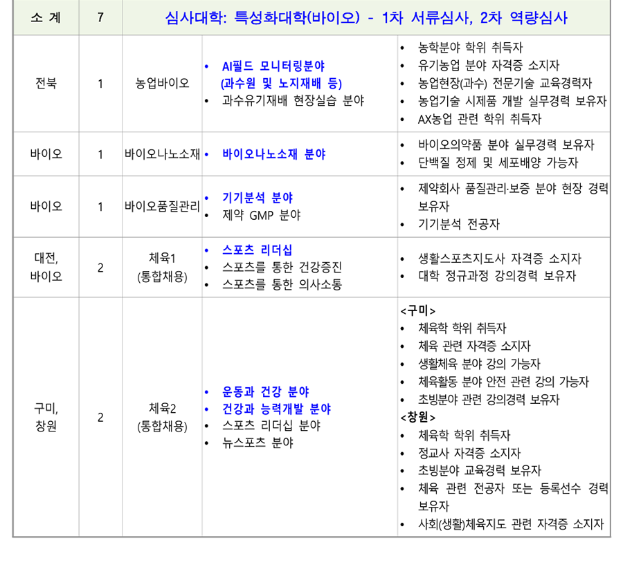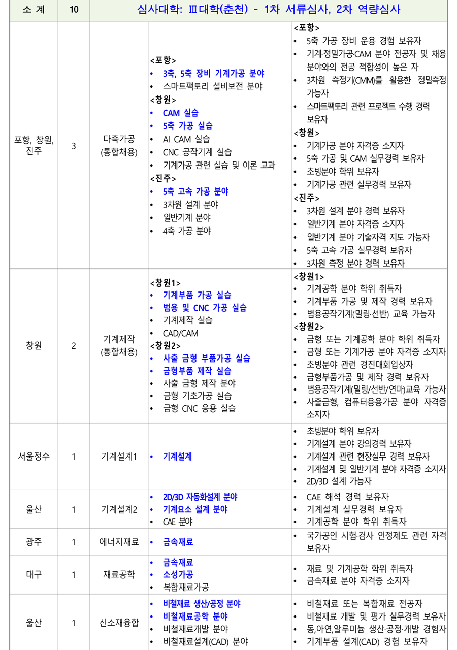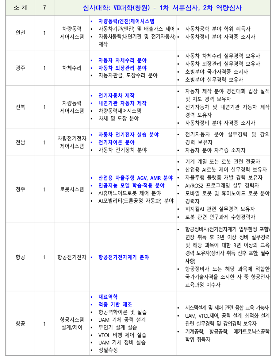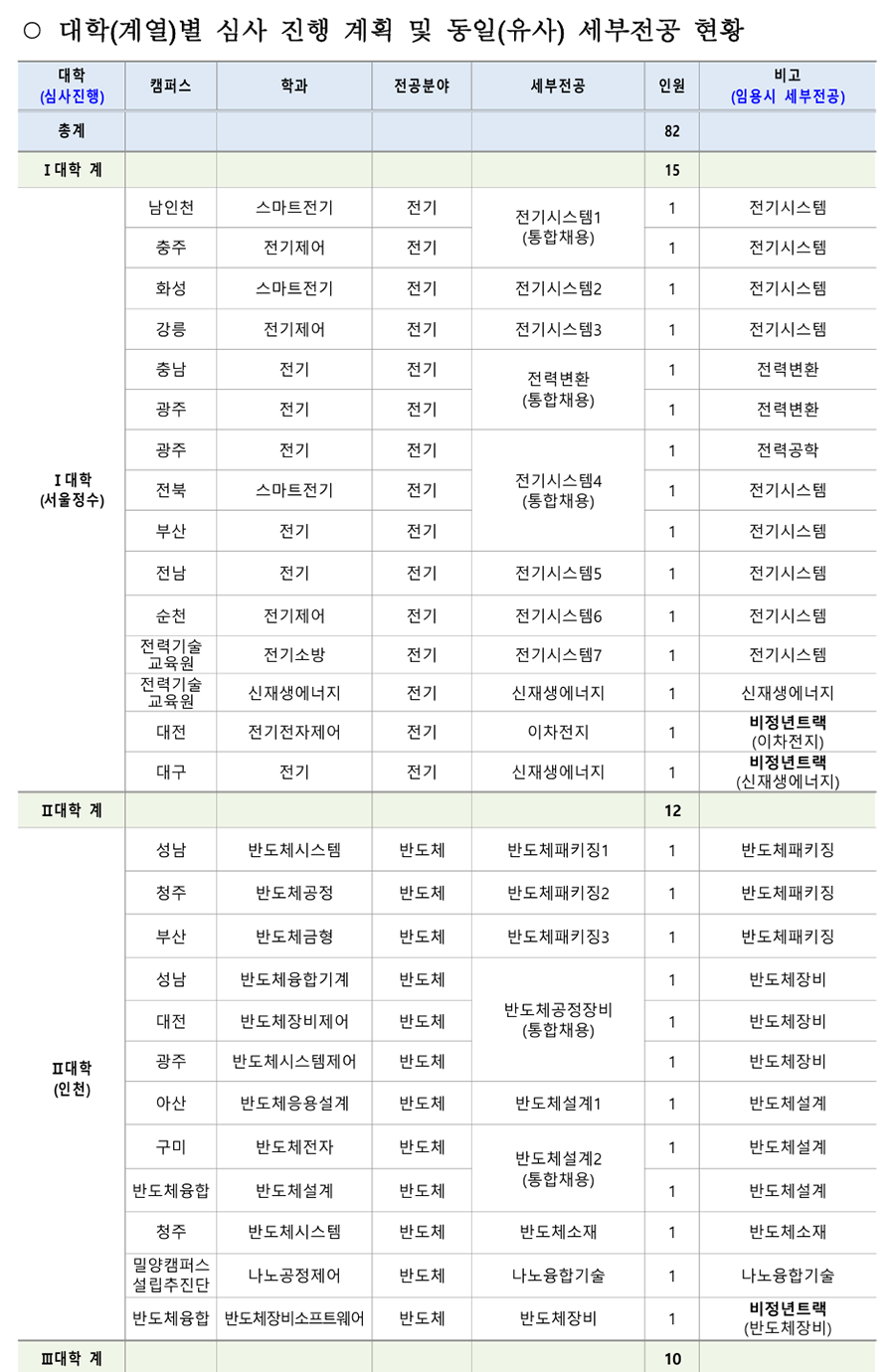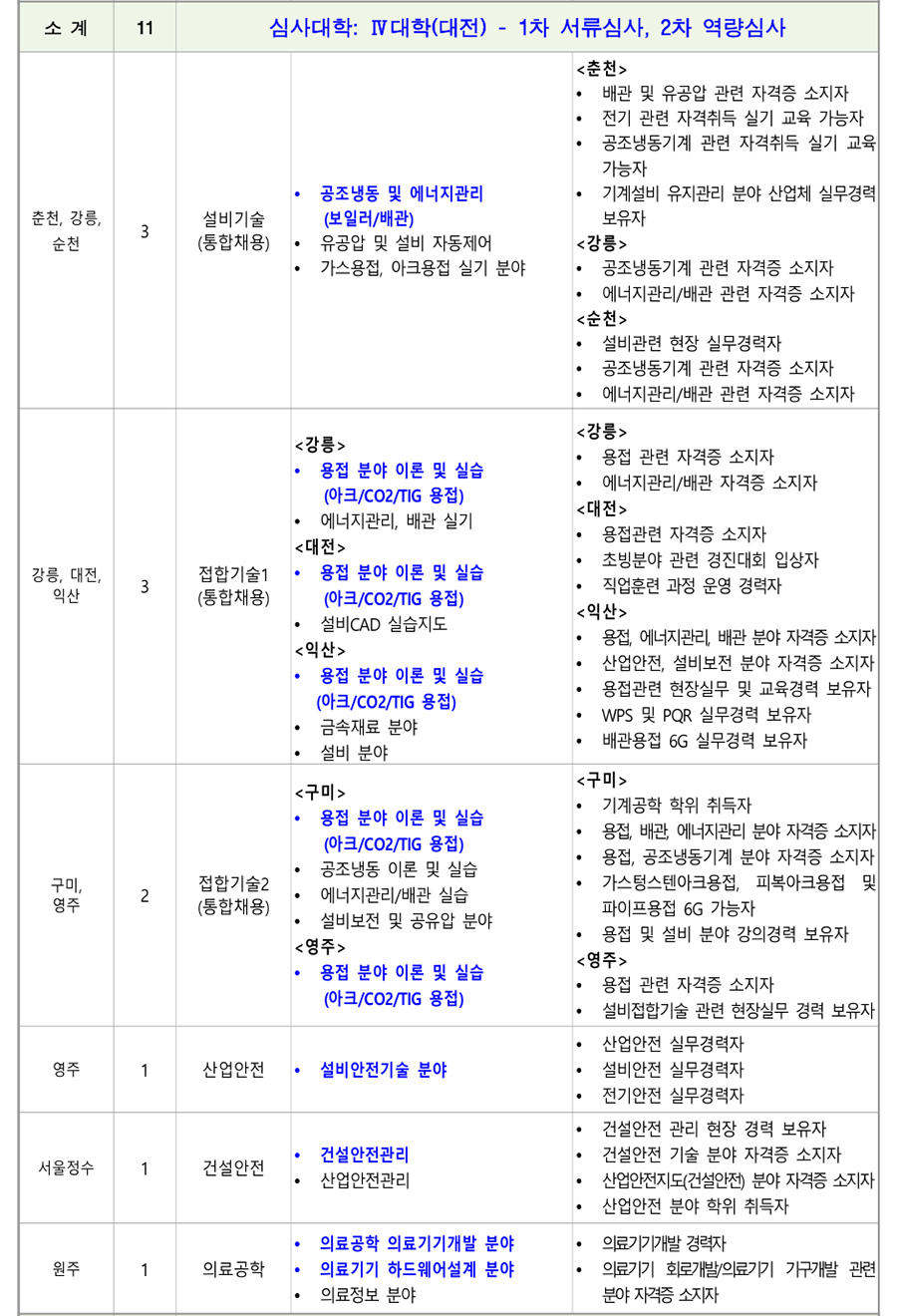 1. ÃʺùºÐ¾ß ¹× Àοø : 18°³ °è¿ 82¸í(Á¤³âÆ®·¢: 78¸í, ºñÁ¤³âÆ®·¢: 4¸í) [ ´ëÇк° ½É»çÇöȲ(Á¤³âÆ®·¢) ] *ÆÄ¶õ»ö º¼µå·Î Ç¥½ÃµÈ ´ã´ç¿¹Á¤ºÐ¾ß´Â ¿ª·®½É»ç °ÀÇÆò°¡ ÁÖÁ¦ Ä·ÆÛ½º Àοø ¼¼ºÎÀü°ø ´ã´ç¿¹Á¤ºÐ¾ß ¿ì´ë»çÇ× ÃÑ °è 78 ¼Ò °è 13 ½É»ç´ëÇÐ: I ´ëÇÐ(¼¿ïÁ¤¼ö) - 1Â÷ ¼·ù½É»ç, 2Â÷ ¿ª·®½É»ç <³²ÀÎõ> <³²ÀÎõ> ÃʺùºÐ¾ß ÇÐÀ§ ÃëµæÀÚ Àü·Âº¯È¯ Àü±âºÐ¾ß ÀÚ°ÝÁõ ¼ÒÁöÀÚ ³²ÀÎõ, Àü±â½Ã½ºÅÛ1 Àü±â¼³ºñ ºÐ¾ß 2 Àü±âºÐ¾ß ½Ç¹«°æ·Â º¸À¯ÀÚ ÃæÁÖ (ÅëÇÕä¿ë) Àü±â°øÇÐ ºÐ¾ß <ÃæÁÖ> <ÃæÁÖ> Àü±â¼³ºñ ½Ç¹«°æ·Â º¸À¯ÀÚ Àü±â¼³ºñ ¡¤ Àü±âºÐ¾ß ÀÚ°ÝÁõ ÃëµæÀÚ ¡¤ PLCÁ¦¾î ºÐ¾ß ȼº 1 Àü±â½Ã½ºÅÛ2 ¡¤ Àü±â½Ã½ºÅÛ PLC ºÐ¾ß °Àǰæ·Â º¸À¯ÀÚ ¡¤ Àü±âÁ¦¾î PLCÁ¦¾î ºÐ¾ß Àü±âºÐ¾ß ÀÚ°ÝÁõ ¼ÒÁöÀÚ °¸ª 1 Àü±â½Ã½ºÅÛ3 ¡¤ ÀÚµ¿Á¦¾î ºÐ¾ß ¡¤ ÀÚµ¿Á¦¾îºÐ¾ß ±³À°°æ·Â º¸À¯ÀÚ Àü±â°øÇÐ ºÐ¾ß <Ãæ³²> <Ãæ³²> ¸¶ÀÌÅ©·ÎÇÁ·Î¼¼¼ ºÐ¾ß Àü·ÂÀüÀÚ °ü·Ã ÇöÀå°æ·Â º¸À¯ÀÚ Àü·ÂÀüÀÚ ºÐ¾ß Àü±âºÐ¾ß ÀÚ°ÝÁõ ¼ÒÁöÀÚ Ãæ³², Àü·Âº¯È¯ <±¤ÁÖ> 2 NCS±â¹Ý ÇÐ»ç ¿î¿µ °æÇè º¸À¯ÀÚ ±¤ÁÖ (ÅëÇÕä¿ë) Àü·Âº¯È¯ ºÐ¾ß <±¤ÁÖ> Àü±â°øÇÐ ºÐ¾ß Àü·Âº¯È¯ ¹× ¸¶ÀÌÅ©·ÎÇÁ·Î¼¼¼ ±â¹Ý ¡¤ ¸¶ÀÌÅ©·ÎÇÁ·Î¼¼¼ ½Ç¹«°æ·Â º¸À¯ÀÚ ¡¤ µðÁöÅÐÁ¦¾î ºÐ¾ß <±¤ÁÖ> <±¤ÁÖ> ¼³ºñ ºÐ¾ß Àü±â¼³ºñ ºÐ¾ß ½Ç¹« °æ·ÂÀÚ ¼öº¯Àü¼³ºñ ºÐ¾ß Àü±â°øÇÐ Àü°øÀÚ Àü±â°øÇÐ ºÐ¾ß <ÀüºÏ> <ÀüºÏ> Àü±â¼³ºñ ºÐ¾ß ½Ç¹«°æ·Â º¸À¯ÀÚ ¼öº¯Àü¼³ºñ ºÐ¾ß Àü±âºÐ¾ß ÀÚ°ÝÁõ ¼ÒÁöÀÚ ±¤ÁÖ, ÀüºÏ, Àü±â½Ã½ºÅÛ4 3 Àü±â¼³ºñ ºÐ¾ß Àü±â¼³ºñ ½Ç±â ¹× Àü±â ¾ÈÀüÁø´Ü ½Ç¹« ºÎ»ê (ÅëÇÕä¿ë) Àü±â¾ÈÀüÁ¡°Ë ºÐ¾ß °¡´ÉÀÚ Àü±â¼³ºñ¼³°è ºÐ¾ß <ºÎ»ê> <ºÎ»ê> Àü±â¼³ºñ ¹× Àü±â½Ã½ºÅÛÁ¦¾î ºÐ¾ß ½Ç¹« Àü±âÀÚ±âÇÐ ºÐ¾ß °æ·Â º¸À¯ÀÚ Àü±â¼³ºñ±â¼ú ºÐ¾ß Àü±âºÐ¾ß ÀÚ°ÝÁõ ¼ÒÁöÀÚ ¡¤ Àü±â½Ç¹«½Ç½À ºÐ¾ß ¡¤ Àü±âºÐ¾ß ÇÐÀ§ ÃëµæÀÚ ¡¤ Àü±âºÐ¾ß ÇöÀå °æ·Â º¸À¯ÀÚ Àü±â¼³ºñ ¹× Àü±â°ø»ç ¼³°è ºÐ¾ß Àü³² 1 Àü±â½Ã½ºÅÛ5 Àü±âºÐ¾ß Àü°øÀÚ ¡¤ Àü±â°øÇÐ ºÐ¾ß ¡¤ Àü±âºÐ¾ß ÀÚ°ÝÁõ ¼ÒÁöÀÚ ¡¤ Àü±âºÐ¾ß Àü°øÀÚ Àü±â°ø»ç ¼³°è ºÐ¾ß Àü±â¼³ºñ ¼³°è, °ø»ç °èȹ ¹× °ßÀû µî ¼øÃµ 1 Àü±â½Ã½ºÅÛ6 PLCÁ¦¾î ºÐ¾ß Àü±â°ø»ç ºÐ¾ß ½Ç¹«°æ·Â º¸À¯ÀÚ ¡¤ Àü±â°ø»ç ºÐ¾ß ¡¤ Àü±âºÐ¾ß ÀÚ°ÝÁõ ¼ÒÁöÀÚ ¼Ò¹æ(Àü±â) °ü·Ã ÀÚ°ÝÁõ ¼ÒÁöÀÚ Àü·Â±â¼ú ¼Ò¹æ(Àü±â) ºÐ¾ß 1 Àü±â½Ã½ºÅÛ7 Àü±â °ü·Ã ÀÚ°ÝÁõ ¼ÒÁöÀÚ ±³À°¿ø ¡¤ Àü±â½Ã½ºÅÛÁ¦¾î ºÐ¾ß ¼Ò¹æ(Àü±â)ºÐ¾ß ½Ç¹«°æ·Â º¸À¯ÀÚ ¡¤ PLC/PC ±â¹Ý Á¦¾î ºÐ¾ß °æ·ÂÀÚ Àü·Â±â¼ú ½ÅÀç»ý¿¡³ÊÁö(ž籤) ºÐ¾ß EMS/SCADA ½Ã½ºÅÛ¼³°è/°³¹ß °æ·Â º¸À¯ÀÚ 1 ½ÅÀç»ý¿¡³ÊÁö ±³À°¿ø Àü·ÂIT ºÐ¾ß Àü±â °ü·Ã ÀÚ°ÝÁõ ¼ÒÁöÀÚ ÃʺùºÐ¾ß ÇöÀå °æ·Â ¹× ±³À°°æ·Â º¸À¯ÀÚ ¼Ò °è 11 ½É»ç´ëÇÐ: II ´ëÇÐ(ÀÎõ) - 1Â÷ ¼·ù½É»ç, 2Â÷ ¿ª·®½É»ç ¹ÝµµÃ¼ÆÐŰ¡ °øÁ¤ ºÐ¾ß ¹ÝµµÃ¼ÆÐŰ¡ ºÐ¾ß ÇÐÀ§ ÃëµæÀÚ ¹ÝµµÃ¼ÆÐŰ¡ ÀåºñÀ¯Áöº¸¼ö ºÐ¾ß ¹ÝµµÃ¼ÆÐŰ¡ ºÐ¾ß ½Ç¹«°æ·Â º¸À¯ÀÚ ¼º³² 1 ¹ÝµµÃ¼ÆÐŰ¡1 TSV, Hybrid bonding ¾î¼Àºí¸® °øÁ¤ TSV, Hybrid bonding, HBM Å×½ºÆ® ¹× HBM Å×½ºÆ® ºÐ¾ß ºÐ¾ß °æ·ÂÀÚ ¹ÝµµÃ¼ÆÐŰ¡ PI (Process Integration) ¹ÝµµÃ¼ÆÐŰ¡(ÈİøÁ¤) °æ·Â º¸À¯ÀÚ Ã»ÁÖ 1 ¹ÝµµÃ¼ÆÐŰ¡2 ¡Ü ¹ÝµµÃ¼ÆÐŰ¡ Àåºñ¼³°è ¹ÝµµÃ¼ OSAT ±â¾÷ °øÁ¤Àåºñ ½Ç¹«°æÇèÀÚ ¹ÝµµÃ¼ Å×½ºÆ® ¹ÝµµÃ¼ Á¦Á¶°øÁ¤ °ü·Ã »ê¾÷ü ¹× ¿¬±¸¼Ò °æ·Â º¸À¯ÀÚ ¹ÝµµÃ¼ÆÐŰ¡ ¼³°è ºÐ¾ß ¹ÝµµÃ¼ÆÐŰ¡ °øÁ¤ ¸ôµå¼³°è °æ·Â º¸À¯ÀÚ ¹ÝµµÃ¼ÆÐŰ¡ ÇØ¼® ºÐ¾ß ºÎ»ê 1 ¹ÝµµÃ¼ÆÐŰ¡3 ¹ÝµµÃ¼ÆÐŰ¡ °øÁ¤¸®µåÇÁ·¹ÀÓ ÇÁ·Î±×·¹½Ãºê ¹ÝµµÃ¼ÆÐŰ¡ ¸ôµåÁ¦ÀÛ ºÐ¾ß ¼³°è °æ·Â º¸À¯ÀÚ ¹ÝµµÃ¼Àåºñ À¯Áöº¸¼ö(À¯°ø¾Ð) <¼º³²> <¼º³²> ¹ÝµµÃ¼Àåºñ ÀüÀå¼³°è ºÐ¾ß ¹ÝµµÃ¼°øÁ¤Á¦¾î ½Ç¹«°æ·Â º¸À¯ÀÚ ¹ÝµµÃ¼Àåºñ Á¦¾î ºÐ¾ß ¹ÝµµÃ¼/µð½ºÇ÷¹ÀÌ Àåºñ ½Ã½ºÅÛ ÀüÀå ¹ÝµµÃ¼Àåºñ Á¦¾î½Ã½ºÅÛ ¼³°è ºÐ¾ß ¼³°è ½Ç¹« °æ·ÂÀÚ ¹ÝµµÃ¼Àåºñ À¯Áöº¸¼ö ºÐ¾ß ¹ÝµµÃ¼Àåºñ ÀÚµ¿ÈºÐ¾ß ½Ç¹«°æ·Â º¸À¯ÀÚ <´ëÀü> ÀåºñÁ¦¾î(PLC±â¹Ý) ½Ç¹«°æ·Â º¸À¯ÀÚ ¼º³², ´ëÀü, ¹ÝµµÃ¼°øÁ¤Àåºñ 3 ¹ÝµµÃ¼Àåºñ ÀüÀå ºÐ¾ß Àåºñ¸ð¼ÇÁ¦¾î °æ·Â º¸À¯ÀÚ ±¤ÁÖ (ÅëÇÕä¿ë) ÀÚµ¿È ÀüÀå ¹× Á¦¾îºÐ¾ß <´ëÀü> ¹ÝµµÃ¼Àåºñ À¯Áöº¸¼ö ÀÚµ¿È ÀüÀå ¹× Á¦¾î °æ·Â º¸À¯ÀÚ <±¤ÁÖ> ¹ÝµµÃ¼Àåºñ ÀüÀå ºÐ¾ß ½Ç¹« °æ·ÂÀÚ ¹ÝµµÃ¼Àåºñ Á¦¾î ºÐ¾ß ¹ÝµµÃ¼ °ü·