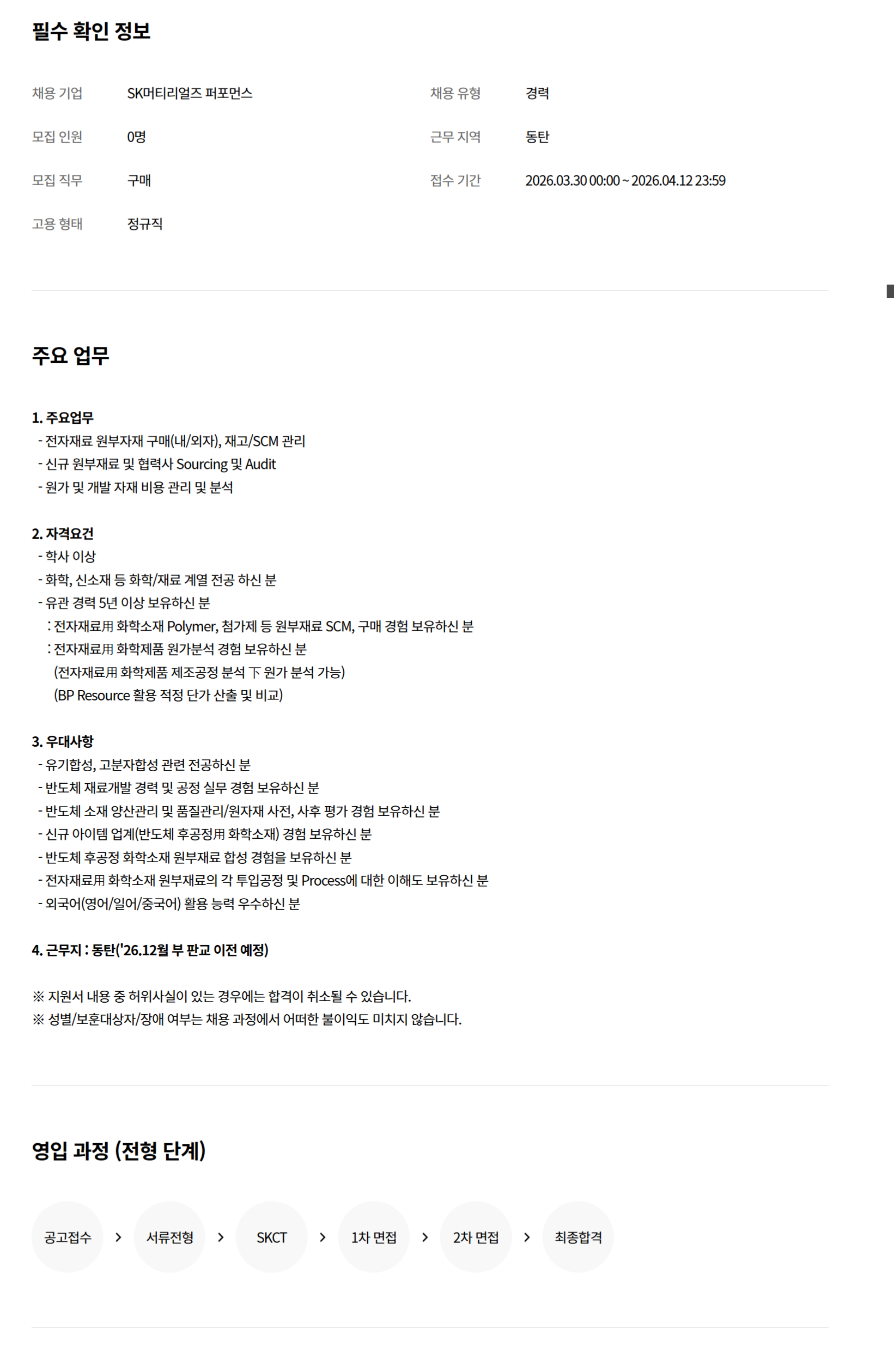 1. ÁÖ¿ä¾÷¹« - ÀüÀÚÀç·á ¿øºÎÀÚÀç ±¸¸Å(³»/¿ÜÀÚ), Àç°í/SCM °ü¸® - ½Å±Ô ¿øºÎÀç·á ¹× Çù·Â»ç Sourcing ¹× Audit - ¿ø°¡ ¹× °³¹ß ÀÚÀç ºñ¿ë °ü¸® ¹× ºÐ¼® 2. ÀÚ°Ý¿ä°Ç - Çлç ÀÌ»ó - È­ÇÐ, ½Å¼ÒÀç µî È­ÇÐ/Àç·á °è¿­ Àü°ø ÇϽŠºÐ - À¯°ü °æ·Â 5³â ÀÌ»ó º¸À¯ÇϽŠºÐ : ÀüÀÚÀç·áéÄ È­ÇмÒÀç Polymer, ÷°¡Á¦ µî ¿øºÎÀç·á SCM, ±¸¸Å °æÇè º¸À¯ÇϽŠºÐ : ÀüÀÚÀç·áéÄ È­ÇÐÁ¦Ç° ¿ø°¡ºÐ¼® °æÇè º¸À¯ÇϽŠºÐ (ÀüÀÚÀç·áéÄ È­ÇÐÁ¦Ç° Á¦Á¶°øÁ¤ ºÐ¼® ù» ¿ø°¡ ºÐ¼® °¡´É) (BP Resource Ȱ¿ë ÀûÁ¤ ´Ü°¡ »êÃâ ¹× ºñ±³)