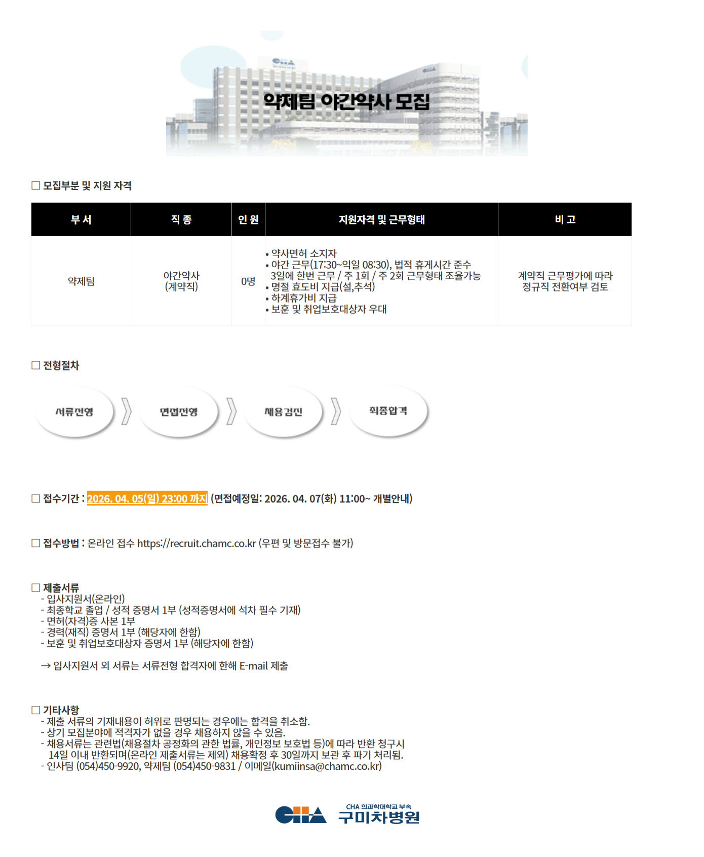 [±¸¹ÌÂ÷º´¿ø] ¾àÁ¦ÆÀ ¾ß°£¾à»ç ¸ðÁý(°è¾àÁ÷)