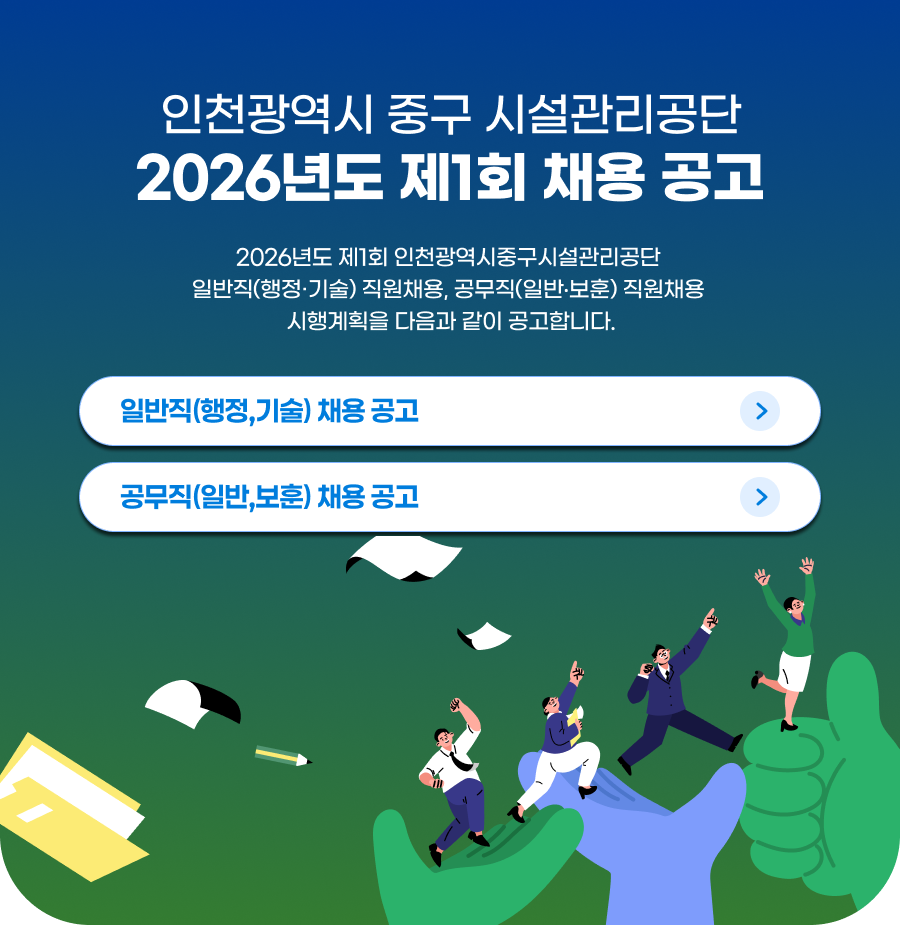 ÀÎõ±¤¿ª½Ã Áß±¸ ½Ã¼³°ü¸®°ø´Ü 2026³âµµ Á¦1ȸ ä¿ë °ø°í 2026³âµµ Á¦1ȸ ÀÎõ±¤¿ª½ÃÁß±¸½Ã¼³°ü¸®°ø´Ü ÀϹÝÁ÷(ÇàÁ¤¡¤±â¼ú) Á÷¿øÃ¤¿ë, °ø¹«Á÷(ÀϹݡ¤º¸ÈÆ) Á÷¿øÃ¤¿ë ½ÃÇà°èȹÀ» ´ÙÀ½°ú °°ÀÌ °ø°íÇÕ´Ï´Ù. ÀϹÝÁ÷(ÇàÁ¤,±â¼ú) ä¿ë °ø°í > °ø¹«Á÷(ÀϹÝ,º¸ÈÆ) ä¿ë °ø°í >