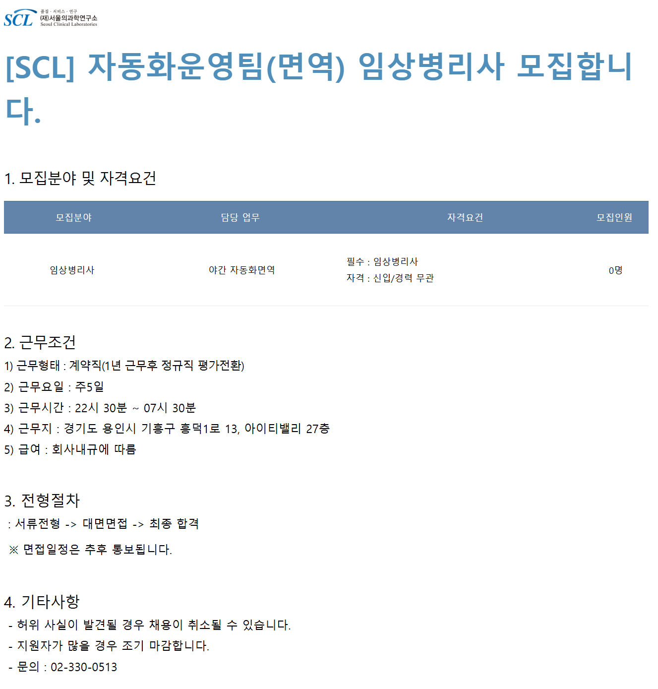 [SCL] ÀÚµ¿È¿î¿µÆÀ(¸é¿ª) ÀÓ»óº´¸®»ç ¸ðÁýÇÕ´Ï´Ù.