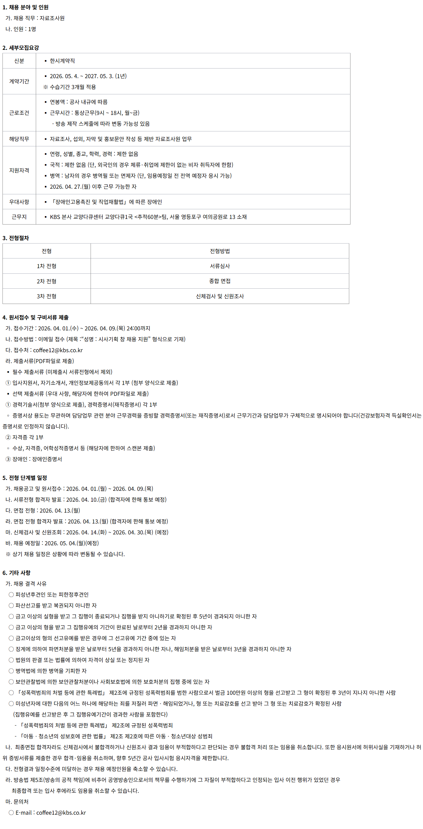 1. ä¿ë ºÐ¾ß ¹× Àοø °¡. ä¿ë Á÷¹« : ÀÚ·áÁ¶»ç¿ø ³ª. Àοø : 1¸í 2. ¼¼ºÎ¸ðÁý¿ä°­ ½ÅºÐ ▪ Çѽðè¾àÁ÷ °è¾à±â°£ ▪ 2026. 05. 4. ~ 2027. 05. 3. (1³â) ¡Ø ¼ö½À±â°£ 3°³¿ù Àû¿ë ±Ù·ÎÁ¶°Ç ▪ ¿¬ºÀ¾× : °ø»ç ³»±Ô¿¡ µû¸§ ▪ ±Ù¹«½Ã°£ : Åë»ó±Ù¹«(9½Ã ~ 18½Ã, ¿ù~±Ý) - ¹æ¼Û Á¦ÀÛ ½ºÄÉÁÙ¿¡ µû¶ó º¯µ¿ °¡´É¼º ÀÖÀ½ ÇØ´çÁ÷¹« ▪ ÀÚ·áÁ¶»ç, ¼·¿Ü, ÀÚ¸· ¹× È«º¸¹®¾È ÀÛ¼º µî Á¦¹Ý ÀÚ·áÁ¶»ç¿ø ¾÷¹« Áö¿øÀÚ°Ý ▪ ¿¬·É, ¼ºº°, Á¾±³, ÇзÂ, °æ·Â : Á¦ÇÑ ¾øÀ½ ▪ ±¹Àû : Á¦ÇÑ ¾øÀ½ (´Ü, ¿Ü±¹ÀÎÀÇ °æ¿ì ü·ù¡¤Ãë¾÷¿¡ Á¦ÇÑÀÌ ¾ø´Â ºñÀÚ ÃëµæÀÚ¿¡ ÇÑÇÔ) ▪ º´¿ª : ³²ÀÚÀÇ °æ¿ì º´¿ªÇÊ ¶Ç´Â ¸éÁ¦ÀÚ (´Ü, Àӿ뿹Á¤ÀÏ Àü Àü¿ª ¿¹Á¤ÀÚ ÀÀ½Ã °¡´É) ▪ 2026. 04. 27.(¿ù) ÀÌÈÄ ±Ù¹« °¡´ÉÇÑ ÀÚ ¿ì´ë»çÇ× ▪ ¡¸Àå¾ÖÀΰí¿ëÃËÁø ¹× Á÷¾÷ÀçȰ¹ý¡¹¿¡ µû¸¥ Àå¾ÖÀÎ ±Ù¹«Áö ▪ KBS º»»ç ±³¾ç´ÙÅ¥¼¾ÅÍ ±³¾ç´ÙÅ¥1±¹ <ÃßÀû60ºÐ>ÆÀ, ¼­¿ï ¿µµîÆ÷±¸ ¿©Àǰø¿ø·Î 13 ¼ÒÀç 3. ÀüÇüÀýÂ÷ ÀüÇü ÀüÇü¹æ¹ý 1Â÷ ÀüÇü ¼­·ù½É»ç 2Â÷ ÀüÇü Á¾ÇÕ ¸éÁ¢ 3Â÷ ÀüÇü ½Åü°Ë»ç ¹× ½Å¿øÁ¶»ç 4. ¿ø¼­Á¢¼ö ¹× ±¸ºñ¼­·ù Á¦Ãâ °¡. Á¢¼ö±â°£ : 2026. 04. 01.(¼ö) ~ 2026. 04. 09.(¸ñ) 24:00±îÁö ³ª. Á¢¼ö¹æ¹ý : À̸ÞÀÏ Á¢¼ö (Á¦¸ñ :¡°¼º¸í : ½Ã»ç±âȹ â ä¿ë Áö¿ø¡± Çü½ÄÀ¸·Î ±âÀç) ´Ù. Á¢¼öó : ******@*******.*** ¶ó. Á¦Ãâ¼­·ù(PDFÆÄÀÏ·Î Á¦Ãâ) ▪ Çʼö Á¦Ãâ¼­·ù (¹ÌÁ¦Ãâ½Ã ¼­·ùÀüÇü¿¡¼­ Á¦¿Ü) ¨ç ÀÔ»çÁö¿ø¼­, ÀÚ±â¼Ò°³¼­, °³ÀÎÁ¤º¸Á¦°øµ¿ÀǼ­ °¢ 1ºÎ (÷ºÎ ¾ç½ÄÀ¸·Î Á¦Ãâ) ▪ ¼±Åà Á¦Ãâ¼­·ù (¿ì´ë »çÇ×, ÇØ´çÀÚ¿¡ ÇÑÇÏ¿© PDFÆÄÀÏ·Î Á¦Ãâ) ¨ç °æ·Â±â¼ú¼­(÷ºÎ ¾ç½ÄÀ¸·Î Á¦Ãâ), °æ·ÂÁõ¸í¼­(ÀçÁ÷Áõ¸í¼­) °¢ 1ºÎ ◦ Áõ¸í¼­»ó ¿ëµµ´Â ¹«°üÇÏ¸ç ´ã´ç¾÷¹« °ü·Ã ºÐ¾ß ±Ù¹«°æ·ÂÀ» ÁõºùÇÒ °æ·ÂÁõ¸í¼­(¶Ç´Â ÀçÁ÷Áõ¸í¼­)·Î¼­ ±Ù¹«±â°£°ú ´ã´ç¾÷¹«°¡ ±¸Ã¼ÀûÀ¸·Î ¸í½ÃµÇ¾î¾ß ÇÕ´Ï´Ù(°Ç°­º¸ÇèÀÚ°Ý µæ½ÇÈ®Àμ­´Â Áõ¸í¼­·Î ÀÎÁ¤ÇÏÁö ¾Ê½À´Ï´Ù). ¨è ÀÚ°ÝÁõ °¢ 1ºÎ ◦ ¼ö»ó, ÀÚ°ÝÁõ, ¾îÇмºÀûÁõ¸í¼­ µî (ÇØ´çÀÚ¿¡ ÇÑÇÏ¿© ½ºÄµº» Á¦Ãâ) ¨é Àå¾ÖÀÎ : Àå¾ÖÀÎÁõ¸í¼­ 5. ÀüÇü ´Ü°èº° ÀÏÁ¤ °¡. ä¿ë°ø°í ¹× ¿ø¼­Á¢¼ö : 2026. 04. 01.(¿ù) ~ 2026. 04. 09.(¸ñ) ³ª. ¼­·ùÀüÇü ÇÕ°ÝÀÚ ¹ßÇ¥ : 2026. 04. 10.(±Ý) (ÇÕ°ÝÀÚ¿¡ ÇÑÇØ Å뺸 ¿¹Á¤) ´Ù. ¸éÁ¢ ÀüÇü : 2026. 04. 13.(¿ù) ¶ó. ¸éÁ¢ ÀüÇü ÇÕ°ÝÀÚ ¹ßÇ¥ : 2026. 04. 13.(¿ù) (ÇÕ°ÝÀÚ¿¡ ÇÑÇØ Å뺸 ¿¹Á¤) ¸¶. ½Åü°Ë»ç ¹× ½Å¿øÁ¶È¸ : 2026. 04. 14.(È­) ~ 2026. 04. 30.(¸ñ) (¿¹Á¤) ¹Ù. ä¿ë ¿¹Á¤ÀÏ : 2026. 05. 04.(¿ù)(¿¹Á¤) ¡Ø »ó±â ä¿ë ÀÏÁ¤Àº »óȲ¿¡ µû¶ó º¯µ¿µÉ ¼ö ÀÖ½À´Ï´Ù. 6. ±âŸ »çÇ× °¡. ä¿ë °á°Ý »çÀ¯ ¡Û ÇǼº³âÈİßÀÎ ¶Ç´Â ÇÇÇÑÁ¤ÈİßÀÎ ¡Û ÆÄ»ê¼±°í¸¦ ¹Þ°í º¹±ÇµÇÁö ¾Æ´ÏÇÑ ÀÚ ¡Û ±Ý°í ÀÌ»óÀÇ ½ÇÇüÀ» ¹Þ°í ±× ÁýÇàÀÌ Á¾·áµÇ°Å³ª ÁýÇàÀ» ¹ÞÁö ¾Æ´ÏÇϱâ·Î È®Á¤µÈ ÈÄ 5³âÀÌ °æ°úµÇÁö ¾Æ´ÏÇÑ ÀÚ ¡Û ±Ý°í ÀÌ»óÀÇ ÇüÀ» ¹Þ°í ±× ÁýÇàÀ¯¿¹ÀÇ ±â°£ÀÌ ¿Ï·áµÈ ³¯·ÎºÎÅÍ 2³âÀ» °æ°úÇÏÁö ¾Æ´ÏÇÑ ÀÚ ¡Û ±Ý°íÀÌ»óÀÇ ÇüÀÇ ¼±°íÀ¯¿¹¸¦ ¹ÞÀº °æ¿ì¿¡ ±× ¼±°íÀ¯¿¹ ±â°£ Áß¿¡ ÀÖ´Â ÀÚ ¡Û ¡°è¿¡ ÀÇÇÏ¿© ÆÄ¸éóºÐÀ» ¹ÞÀº ³¯·ÎºÎÅÍ 5³âÀ» °æ°úÇÏÁö ¾Æ´ÏÇÑ ÀÚ³ª, ÇØÀÓóºÐÀ» ¹ÞÀº ³¯·ÎºÎÅÍ 3³âÀ» °æ°úÇÏÁö ¾Æ´ÏÇÑ ÀÚ ¡Û ¹ý¿øÀÇ ÆÇ°á ¶Ç´Â ¹ý·ü¿¡ ÀÇÇÏ¿© ÀÚ°ÝÀÌ »ó½Ç ¶Ç´Â Á¤ÁöµÈ ÀÚ ¡Û º´¿ª¹ý¿¡ ÀÇÇÑ º´¿ªÀ» ±âÇÇÇÑ ÀÚ ¡Û º¸¾È°üÂû¹ý¿¡ ÀÇÇÑ º¸¾È°üÂûóºÐÀ̳ª »çȸº¸È£¹ý¿¡ ÀÇÇÑ º¸È£Ã³ºÐÀÇ ÁýÇà Áß¿¡ ÀÖ´Â ÀÚ ¡Û ¡¸¼ºÆø·Â¹üÁËÀÇ Ã³¹ú µî¿¡ °üÇÑ Æ¯·Ê¹ý¡¹ Á¦2Á¶¿¡ ±ÔÁ¤µÈ ¼ºÆø·Â¹üÁ˸¦ ¹üÇÑ »ç¶÷À¸·Î¼­ ¹ú±Ý 100¸¸¿ø ÀÌ»óÀÇ ÇüÀ» ¼±°í¹Þ°í ±× ÇüÀÌ È®Á¤µÈ ÈÄ 3³âÀÌ Áö³ªÁö ¾Æ´ÏÇÑ »ç¶÷ ¡Û ¹Ì¼º³âÀÚ¿¡ ´ëÇÑ ´ÙÀ½ÀÇ ¾î´À Çϳª¿¡ ÇØ´çÇÏ´Â Á˸¦ ÀúÁú·¯ ÆÄ¸é¤ýÇØÀӵǾú°Å³ª, Çü ¶Ç´Â Ä¡·á°¨È£¸¦ ¼±°í ¹Þ¾Æ ±× Çü ¶Ç´Â Ä¡·á°¨È£°¡ È®Á¤µÈ »ç¶÷ (ÁýÇàÀ¯¿¹¸¦ ¼±°í¹ÞÀº ÈÄ ±× ÁýÇàÀ¯¿¹±â°£ÀÌ °æ°úÇÑ »ç¶÷À» Æ÷ÇÔÇÑ´Ù) - ¡¸¼ºÆø·Â¹üÁËÀÇ Ã³¹ú µî¿¡ °üÇÑ Æ¯·Ê¹ý¡¹ Á¦2Á¶¿¡ ±ÔÁ¤µÈ ¼ºÆø·Â¹üÁË - ¡¸¾Æµ¿¤ýû¼Ò³âÀÇ ¼ºº¸È£¿¡ °üÇÑ ¹ý·ü¡¹ Á¦2Á¶ Á¦2È£¿¡ µû¸¥ ¾Æµ¿¤ýû¼Ò³â´ë»ó ¼º¹üÁË ³ª. ÃÖÁ¾¸éÁ¢ ÇÕ°ÝÀÚ¶óµµ ½Åü°Ë»ç¿¡¼­ ºÒÇÕ°ÝÇϰųª ½Å¿øÁ¶»ç °á°ú ÀÓ¿ëÀÌ ºÎÀûÇÕÇÏ´Ù°í ÆÇ´ÜµÇ´Â °æ¿ì ºÒÇÕ°Ý Ã³¸® ¶Ç´Â ÀÓ¿ëÀ» Ãë¼ÒÇÕ´Ï´Ù. ¶ÇÇÑ ÀÀ½Ã¿ø¼­¿¡ ÇãÀ§»ç½ÇÀ» ±âÀçÇϰųª ÇãÀ§ Áõºù¼­·ù¸¦ Á¦ÃâÇÑ °æ¿ì ÇÕ°Ý¡¤ÀÓ¿ëÀ» Ãë¼ÒÇϸç, ÇâÈ