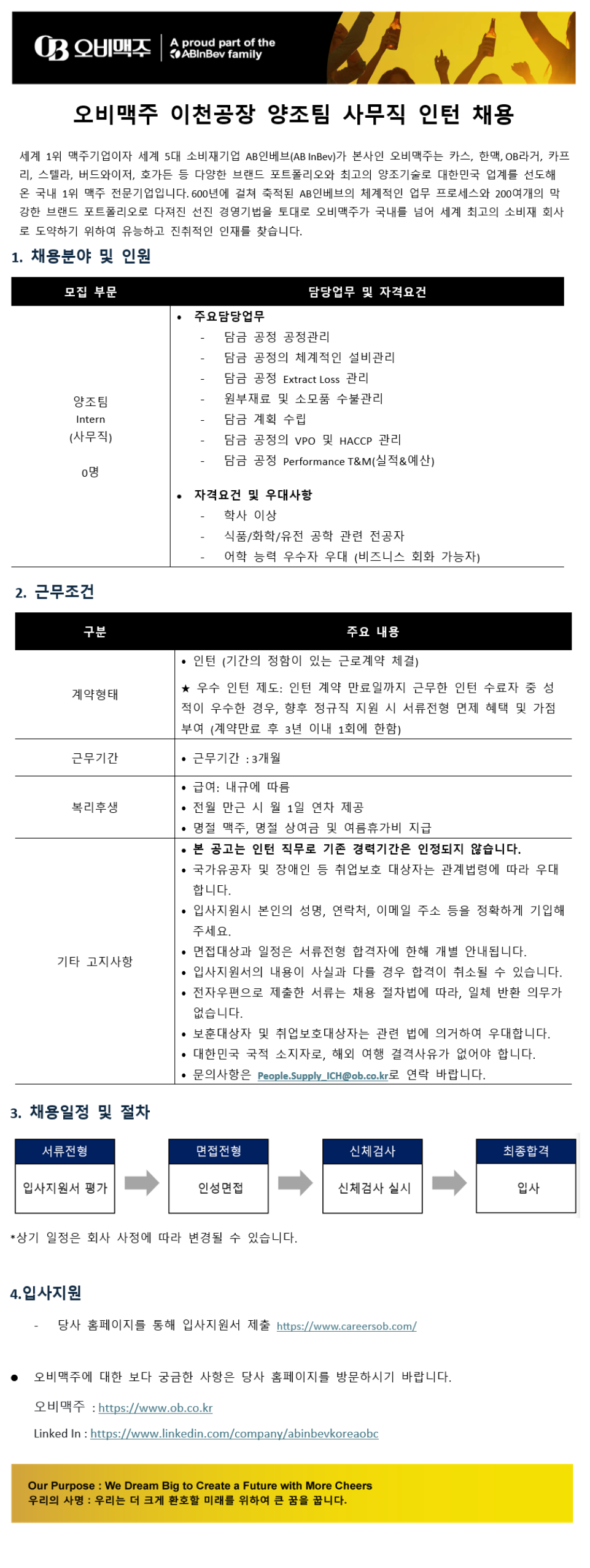 [ABInbev Korea ¿Àºñ¸ÆÁÖ] ÀÌõ°øÀå ¾çÁ¶ÆÀ »ç¹«Á÷ ÀÎÅÏ Ã¤¿ë