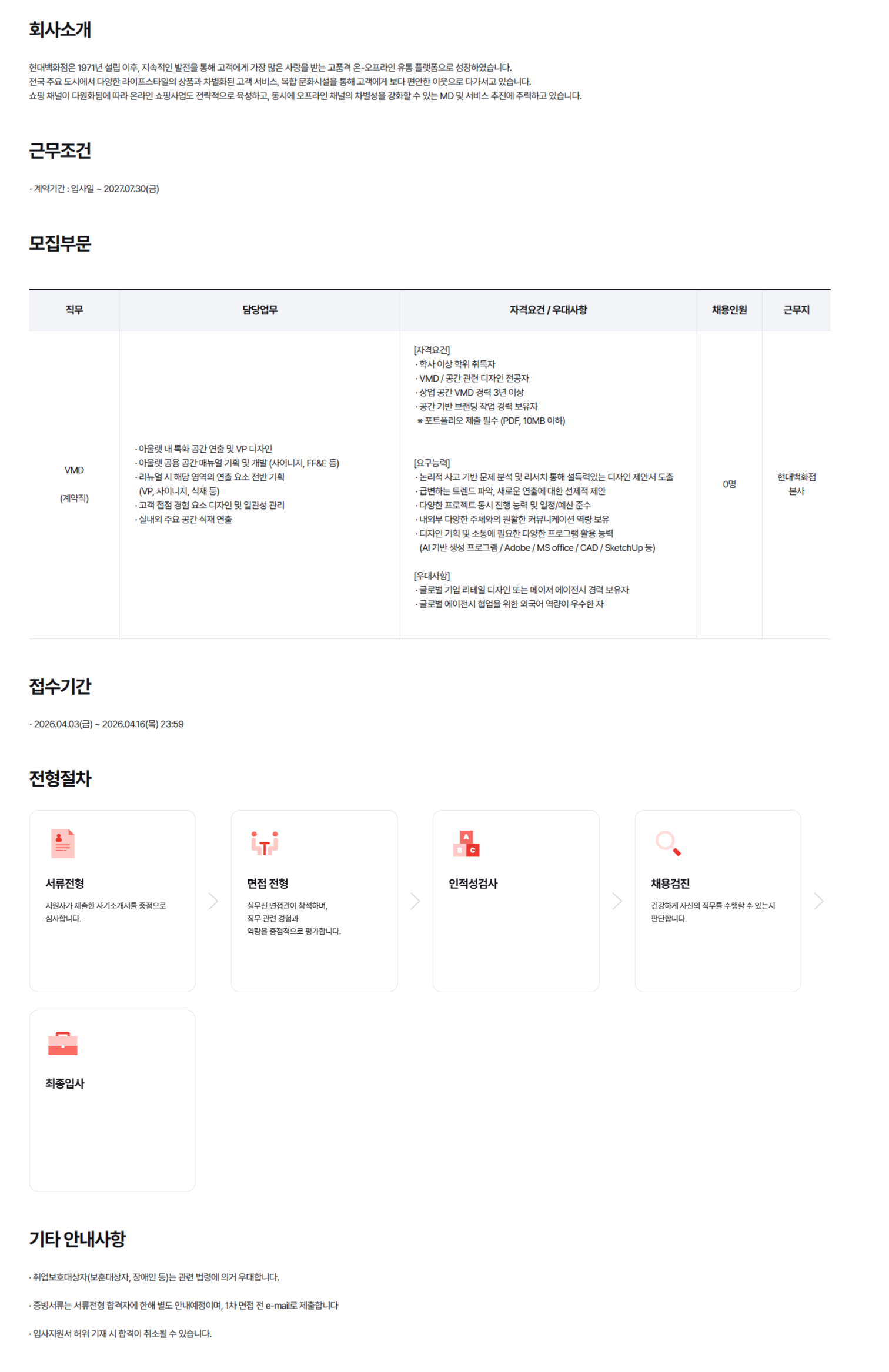 Á÷¹« ´ã´ç¾÷¹« ÀÚ°Ý¿ä°Ç / ¿ì´ë»çÇ× Ã¤¿ëÀοø ±Ù¹«Áö VMD (°è¾àÁ÷) ¡¤ ¾Æ¿ï·¿ ³» Ưȭ °ø°£ ¿¬Ãâ ¹× VP µðÀÚÀÎ ¡¤ ¾Æ¿ï·¿ °ø¿ë °ø°£ ¸Å´º¾ó ±âȹ ¹× °³¹ß (»çÀÌ´ÏÁö, FF&E µî) ¡¤ ¸®´º¾ó ½Ã ÇØ´ç ¿µ¿ªÀÇ ¿¬Ãâ ¿ä¼Ò Àü¹Ý ±âȹ (VP, »çÀÌ´ÏÁö, ½ÄÀç µî) ¡¤ °í°´ Á¢Á¡ °æÇè ¿ä¼Ò µðÀÚÀÎ ¹× Àϰü¼º °ü¸® ¡¤ ½Ç³»¿Ü ÁÖ¿ä °ø°£ ½ÄÀç ¿¬Ãâ [ÀÚ°Ý¿ä°Ç] ¡¤ Çлç ÀÌ»ó ÇÐÀ§ ÃëµæÀÚ ¡¤ VMD / °ø°£ °ü·Ã µðÀÚÀÎ Àü°øÀÚ ¡¤ »ó¾÷ °ø°£ VMD °æ·Â 3³â ÀÌ»ó ¡¤ °ø°£ ±â¹Ý ºê·£µù ÀÛ¾÷ °æ·Â º¸À¯ÀÚ ¡Ø Æ÷Æ®Æú¸®¿À Á¦Ãâ Çʼö (PDF, 10MB ÀÌÇÏ) [¿ä±¸´É·Â] ¡¤ ³í¸®Àû »ç°í ±â¹Ý ¹®Á¦ ºÐ¼® ¹× ¸®¼­Ä¡ ÅëÇØ ¼³µæ·ÂÀÖ´Â µðÀÚÀÎ Á¦¾È¼­ µµÃâ ¡¤ ±Þº¯ÇÏ´Â Æ®·»µå ÆÄ¾Ç, »õ·Î¿î ¿¬Ãâ¿¡ ´ëÇÑ ¼±Á¦Àû Á¦¾È ¡¤ ´Ù¾çÇÑ ÇÁ·ÎÁ§Æ® µ¿½Ã ÁøÇà ´É·Â ¹× ÀÏÁ¤/¿¹»ê Áؼö ¡¤ ³»¿ÜºÎ ´Ù¾çÇÑ ÁÖü¿ÍÀÇ ¿øÈ°ÇÑ Ä¿¹Â´ÏÄÉÀÌ¼Ç ¿ª·® º¸À¯ ¡¤ µðÀÚÀÎ ±âȹ ¹× ¼ÒÅë¿¡ ÇÊ¿äÇÑ ´Ù¾çÇÑ ÇÁ·Î±×·¥ Ȱ¿ë ´É·Â (AI ±â¹Ý »ý¼º ÇÁ·Î±×·¥ / Adobe / MS office / CAD / SketchUp µî) [¿ì´ë»çÇ×] ¡¤ ±Û·Î¹ú ±â¾÷ ¸®Å×ÀÏ µðÀÚÀÎ ¶Ç´Â ¸ÞÀÌÀú ¿¡ÀÌÀü½Ã °æ·Â º¸À¯ÀÚ ¡¤ ±Û·Î¹ú ¿¡ÀÌÀü½Ã Çù¾÷À» À§ÇÑ ¿Ü±¹¾î ¿ª·®ÀÌ ¿ì¼öÇÑ ÀÚ 0¸í Çö´ë¹éÈ­Á¡ º»»ç