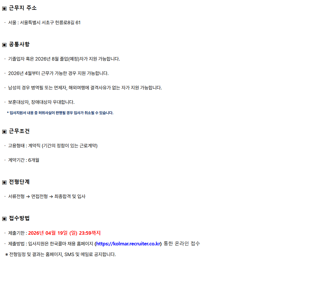 ¤ý Á¦Ãâ¹æ¹ý : ÀÔ»çÁö¿øÀº Çѱ¹Äݸ¶ ä¿ë ȨÆäÀÌÁö (https://kolmar.recruiter.co.kr) ÅëÇÑ ¿Â¶óÀÎ Á¢¼ö