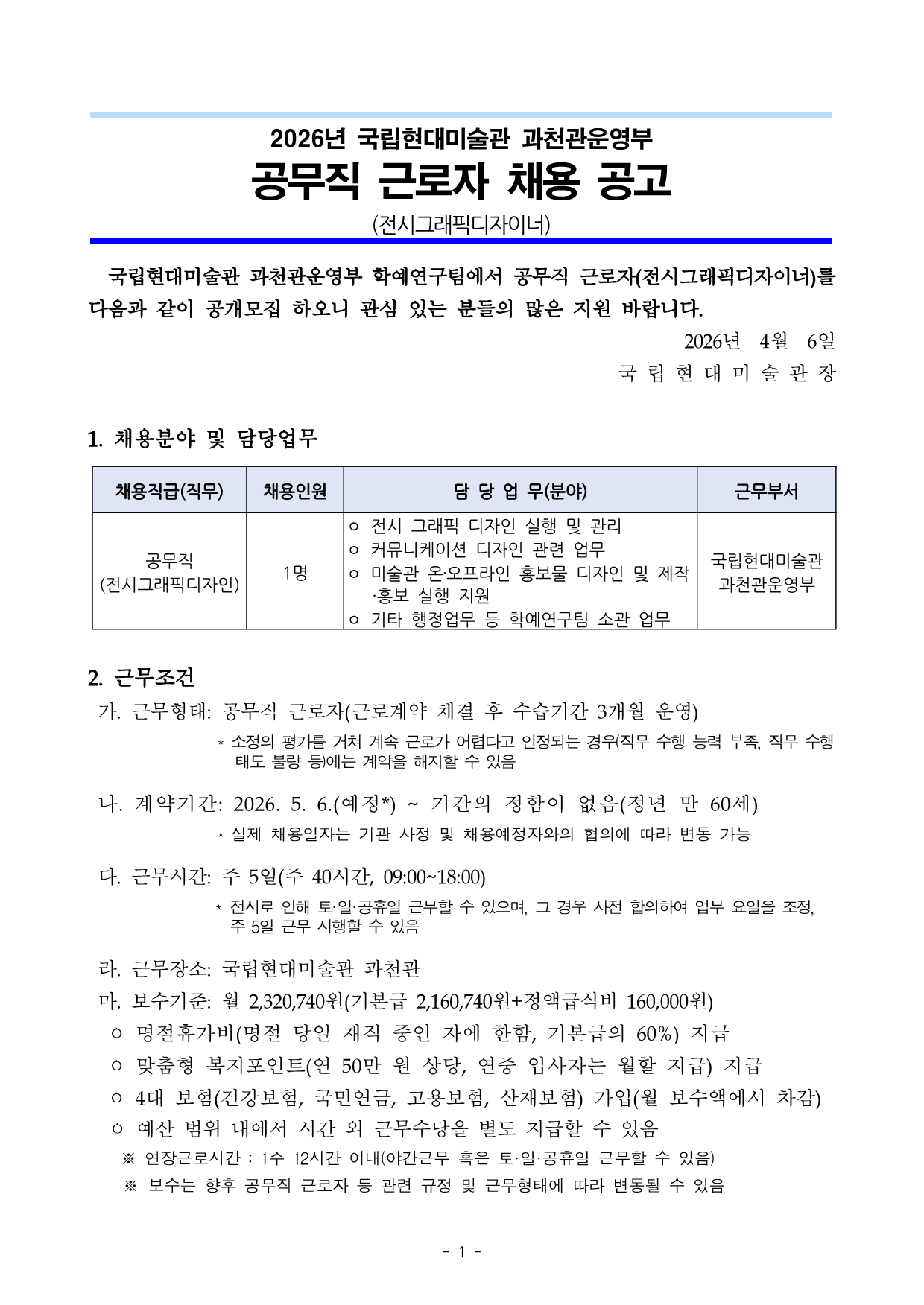 ±¹¸³Çö´ë¹Ì¼ú°ü °úõ°ü¿î¿µºÎ °ø¹«Á÷ ±Ù·ÎÀÚ(Àü½Ã±×·¡ÇȵðÀÚÀ̳Ê) ä¿ë °ø°í