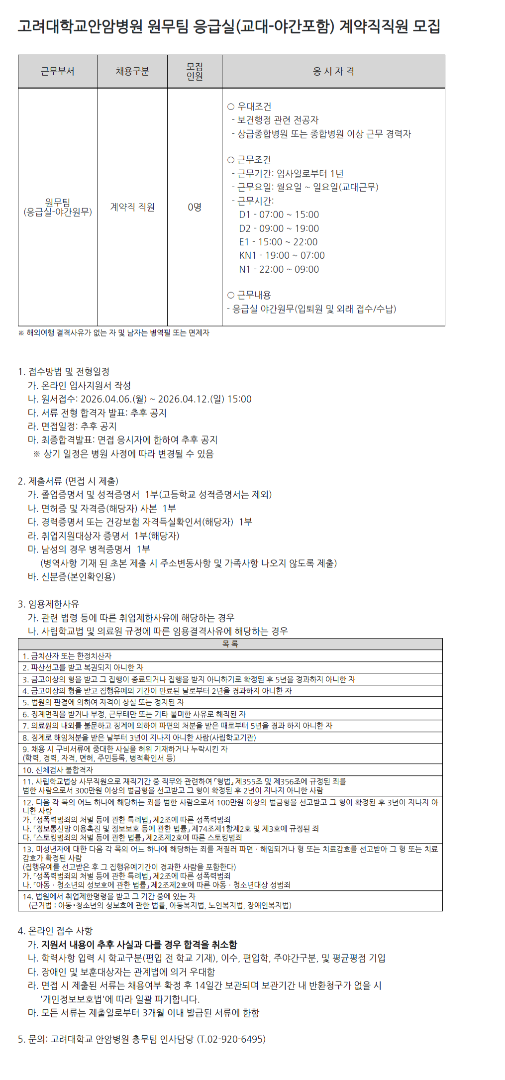 [¾È¾Ïº´¿ø 26-22]¿ø¹«ÆÀ ÀÀ±Þ½Ç(±³´ë±Ù¹«-¾ß°£Æ÷ÇÔ) °è¾àÁ÷ Á÷¿ø ¸ðÁý