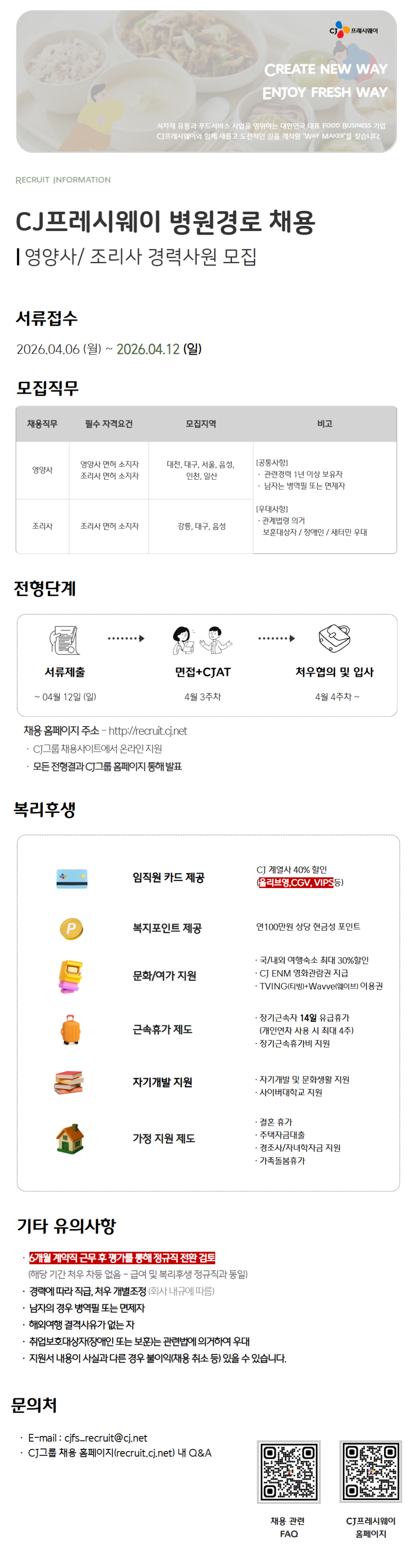 [CJÇÁ·¹½Ã¿þÀÌ] ´Üü±Þ½Ä(º´¿ø°æ·Î) Á¶¸®»ç¡¤¿µ¾ç»ç °æ·Â»ç¿ø ¸ðÁý