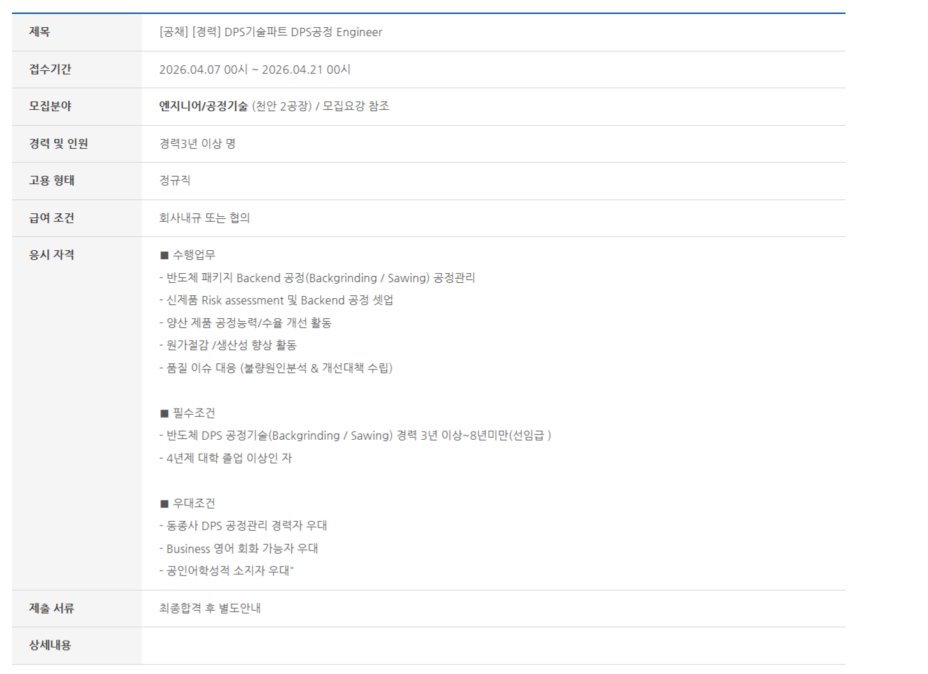 - ¹ÝµµÃ¼ DPS °øÁ¤±â¼ú(Backgrinding / Sawing) °æ·Â 3³â ÀÌ»ó~8³â¹Ì¸¸(¼±ÀÓ±Þ )