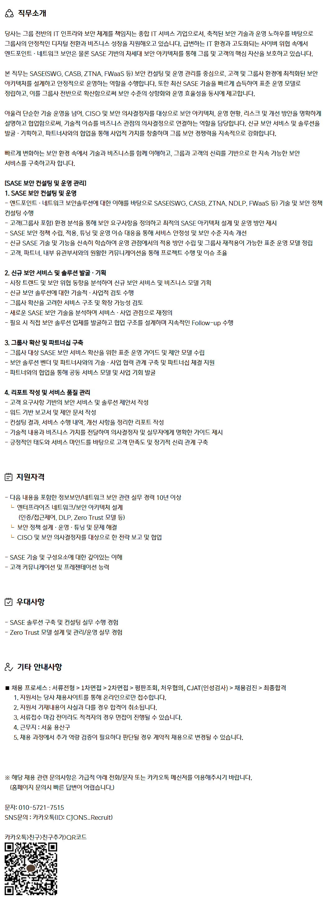 º» Á÷¹«´Â SASE(SWG, CASB, ZTNA, FWaaS µî) º¸¾È ÄÁ¼³ÆÃ ¹× ¿î¿µ °ü¸®¸¦ Áß½ÉÀ¸·Î, °í°´ ¹× ±×·ì»ç ȯ°æ¿¡ ÃÖÀûÈµÈ º¸¾È ¾ÆÅ°ÅØÃ³¸¦ ¼³°èÇÏ°í ¾ÈÁ¤ÀûÀ¸·Î ¿î¿µÇÏ´Â ¿ªÇÒÀ» ¼öÇàÇÕ´Ï´Ù. ¶ÇÇÑ ÃֽŠSASE ±â¼úÀ» ºü¸£°Ô ½ÀµæÇÏ¿© Ç¥ÁØ ¿î¿µ ¸ðµ¨·Î Á¤¸³Çϰí, À̸¦ ±×·ì»ç Àü¹ÝÀ¸·Î È®»êÇÔÀ¸·Î½á º¸¾È ¼öÁØÀÇ »óÇâÈ¿Í ¿î¿µ È¿À²¼ºÀ» µ¿½Ã¿¡ Á¦°íÇÕ´Ï´Ù.