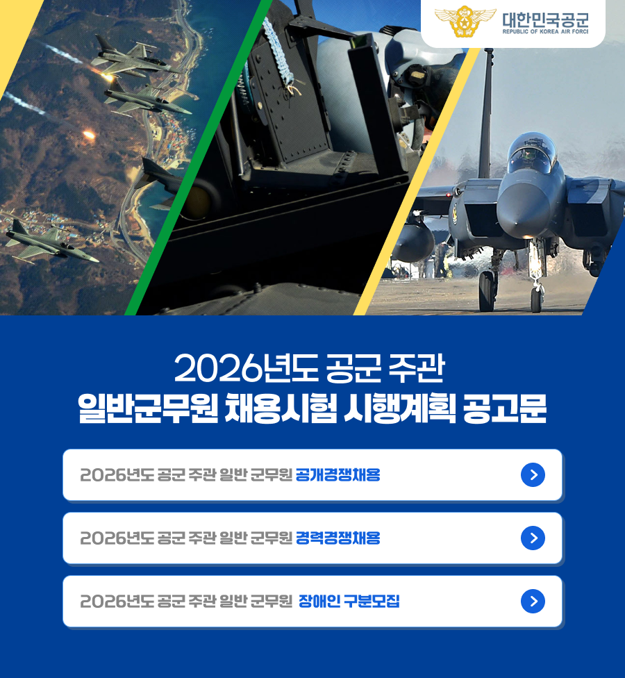 ´ëÇѹα¹°ø±º REPUBLIC OF KOREA AIR FORCE 2026³âµµ °ø±º ÁÖ°ü ÀϹݱº¹«¿ø ä¿ë½ÃÇè ½ÃÇà°èȹ °ø°í¹® 2026³âµµ °ø±º ÁÖ°ü ÀÏ¹Ý ±º¹«¿ø °ø°³°æÀïä¿ë > 2026³âµµ °ø±º ÁÖ°ü ÀÏ¹Ý ±º¹«¿ø °æ·Â°æÀïä¿ë > 2026³âµµ °ø±º ÁÖ°ü ÀÏ¹Ý ±º¹«¿ø Àå¾ÖÀÎ ±¸ºÐ¸ðÁý >