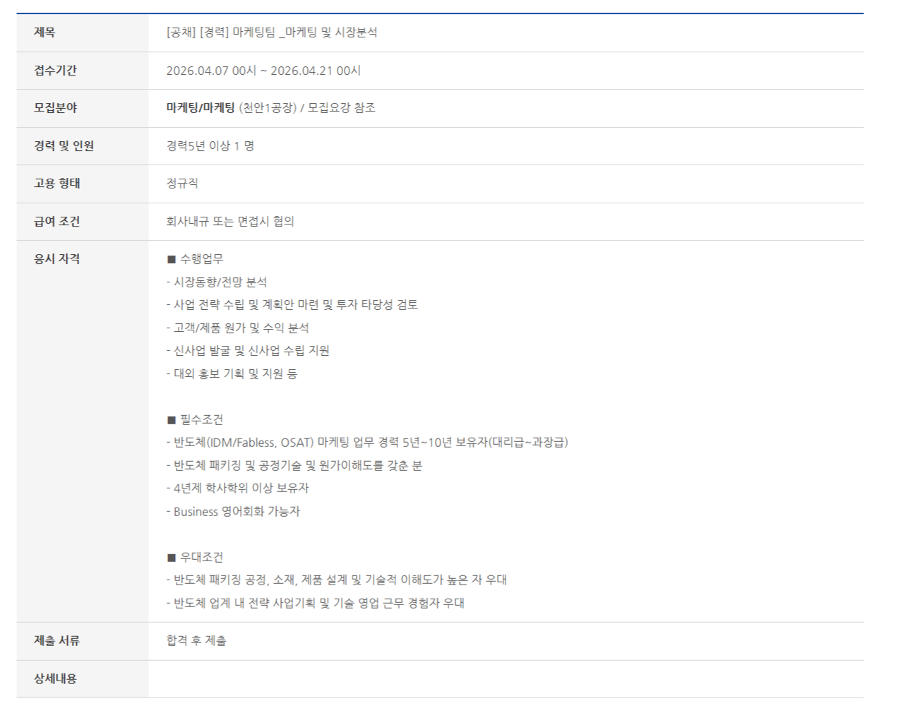- ¹ÝµµÃ¼(IDM/Fabless, OSAT) ¸¶ÄÉÆÃ ¾÷¹« °æ·Â 5³â~10³â º¸À¯ÀÚ(´ë¸®±Þ~°úÀå±Þ)
