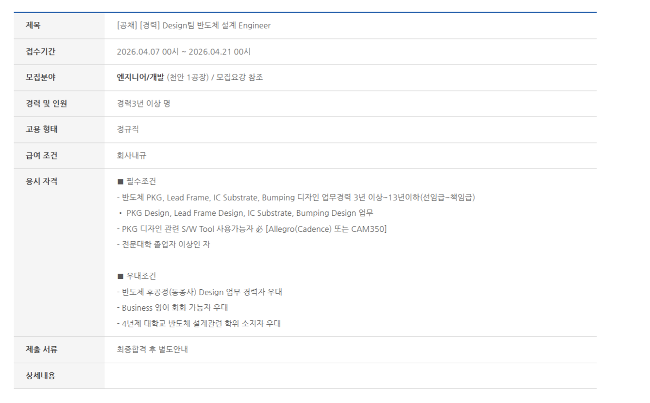 - ¹ÝµµÃ¼ PKG, Lead Frame, IC Substrate, Bumping µðÀÚÀÎ ¾÷¹«°æ·Â 3³â ÀÌ»ó~13³âÀÌÇÏ(¼±ÀÓ±Þ~Ã¥ÀÓ±Þ)