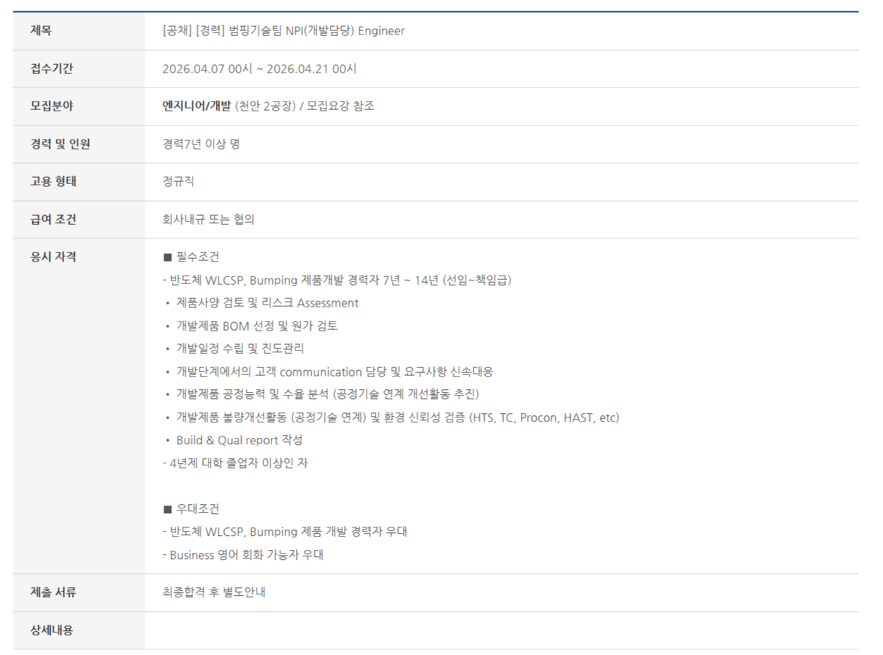 - ¹ÝµµÃ¼ WLCSP, Bumping Á¦Ç°°³¹ß °æ·ÂÀÚ 7³â ~ 14³â (¼±ÀÓ~Ã¥ÀÓ±Þ)