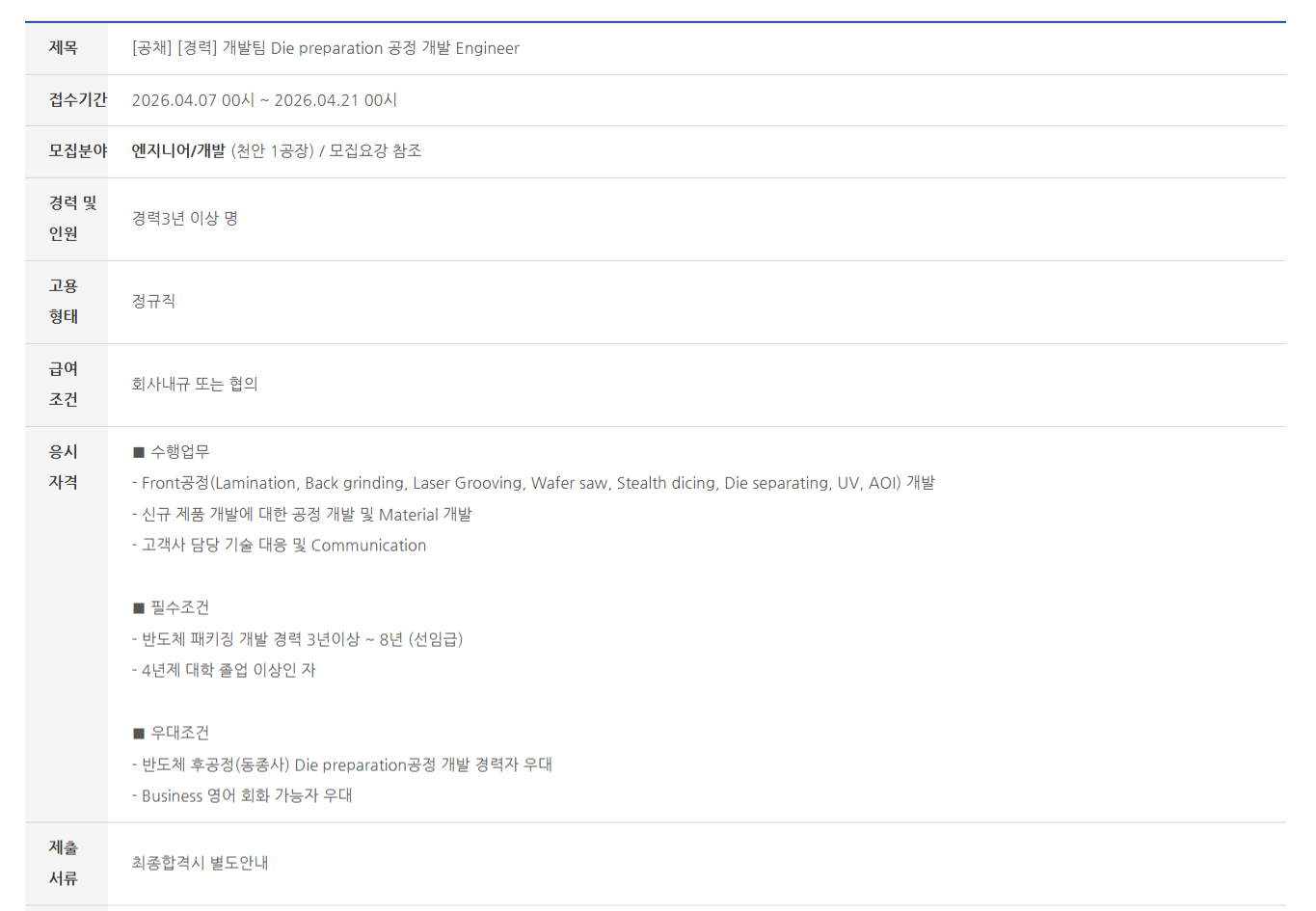 - ¹ÝµµÃ¼ ÈİøÁ¤(µ¿Á¾»ç) Die preparation°øÁ¤ °³¹ß °æ·ÂÀÚ ¿ì´ë