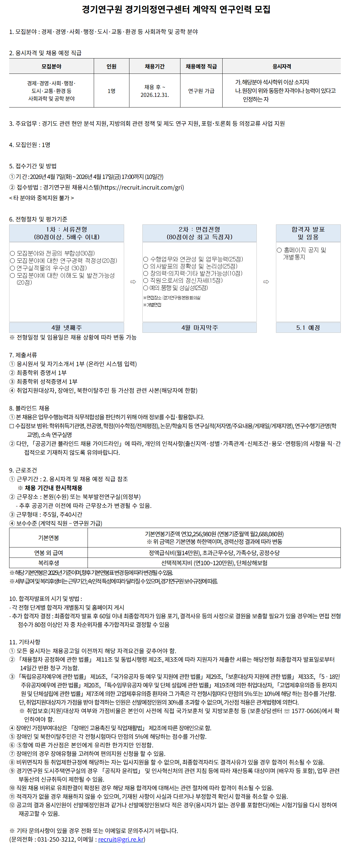 °æ±â¿¬±¸¿ø °æ±âÀÇÁ¤¿¬±¸¼¾ÅÍ °è¾àÁ÷ ¿¬±¸Àη ¸ðÁý 1. ¸ðÁýºÐ¾ß : °æÁ¦¡¤°æ¿µ¡¤»çȸ¡¤ÇàÁ¤¡¤µµ½Ã¡¤±³Å롤ȯ°æ µî »çȸ°úÇÐ ¹× °øÇÐ ºÐ¾ß 2. ÀÀ½ÃÀÚ°Ý ¹× ä¿ë ¿¹Á¤ Á÷±Þ ¸ðÁýºÐ¾ß Àοø ä¿ë±â°£ ä¿ë¿¹Á¤ Á÷±Þ ÀÀ½ÃÀÚ°Ý °æÁ¦¡¤°æ¿µ¡¤»çȸ¡¤ÇàÁ¤¡¤ µµ½Ã¡¤±³Å롤ȯ°æ µî »çȸ°úÇÐ ¹× °øÇÐ ºÐ¾ß 1¸í ä¿ë ÈÄ ~ 2026.12.31. ¿¬±¸¿ø °¡±Þ °¡. ÇØ´çºÐ¾ß ¼®»çÇÐÀ§ ÀÌ»ó ¼ÒÁöÀÚ ³ª. ¿øÀåÀÌ À§¿Í µ¿µîÇÑ ÀÚ°ÝÀ̳ª ´É·ÂÀÌ ÀÖ´Ù°í ÀÎÁ¤ÇÏ´Â ÀÚ 3. ÁÖ¿ä¾÷¹« : °æ±âµµ °ü·Ã Çö¾È ºÐ¼® Áö¿ø, Áö¹æÀÇȸ °ü·Ã Á¤Ã¥ ¹× Á¦µµ ¿¬±¸ Áö¿ø, Æ÷·³・Åä·Ðȸ µî ÀÇÁ¤±³·ù »ç¾÷ Áö¿ø 4. ¸ðÁýÀοø : 1¸í 5. Á¢¼ö±â°£ ¹× ¹æ¹ý ¨ç ±â °£ : 2026³â 4¿ù 7ÀÏ(È­) ~ 2026³â 4¿ù 17ÀÏ(±Ý) 17:00±îÁö (10Àϰ£) ¨è Á¢¼ö¹æ¹ý : °æ±â¿¬±¸¿ø ä¿ë½Ã½ºÅÛ(https://recruit.incruit.com/gri) < Ÿ ºÐ¾ß¿Í Áߺ¹Áö¿ø ºÒ°¡ > 6. ÀüÇüÀýÂ÷ ¹× Æò°¡±âÁØ 1Â÷ : ¼­·ùÀüÇü (80Á¡ÀÌ»ó, 5¹è¼ö À̳») 2Â÷ : ¸éÁ¢ÀüÇü (80Á¡ÀÌ»ó ÃÖ°í µæÁ¡ÀÚ) ÇÕ°ÝÀÚ ¹ßÇ¥ ¹× ÀÓ¿ë ¡Û ¸ðÁýºÐ¾ß¿Í Àü°øÀÇ ºÎÇÕ¼º(30Á¡) ¡Û ¸ðÁýºÐ¾ß¿¡ ´ëÇÑ ¿¬±¸°æ·Â ÀûÁ¤¼º(20Á¡) ¡Û ¿¬±¸½ÇÀû¹°ÀÇ ¿ì¼ö¼º (30Á¡) ¡Û ¸ðÁýºÐ¾ß¿¡ ´ëÇÑ ÀÌÇØµµ ¹× ¹ßÀü°¡´É¼º(20Á¡) ⇨ ¡Û ¼öÇà¾÷¹«¿Í ¿¬°ü¼º ¹× ¾÷¹«´É·Â(25Á¡) ¡Û ÀÇ»ç¹ßÇ¥ÀÇ Á¤È®¼º ¹× ³í¸®¼º(25Á¡) ¡Û âÀǷ¡¤ÀÇÁö·Â¡¤±âŸ ¹ßÀü°¡´É¼º(10Á¡) ¡Û Á÷¿øÀ¸·Î¼­ÀÇ Á¤½ÅÀÚ¼¼(15Á¡) ¡Û ¿¹ÀÇ․ǰÇà ¹× ¼º½Ç¼º(25Á¡) ¡Ø ¸éÁ¢Àå¼Ò : °æ±â¿¬±¸¿ø º»¿ø ȸÀÇ½Ç ¡Ø °³º°¸éÁ¢ ⇨ ¡Û ȨÆäÀÌÁö °øÁö ¹× °³º°ÅëÁö 4¿ù ³Ý°ÁÖ 4¿ù ¸¶Áö¸·ÁÖ 5.1 ¿¹Á¤ ¡Ø ÀüÇüÀÏÁ¤ ¹× ÀÓ¿ëÀÏÀº ä¿ë »óȲ¿¡ µû¶ó º¯µ¿ °¡´É 7. Á¦Ãâ¼­·ù ¨ç ÀÀ½Ã¿ø¼­ ¹× ÀÚ±â¼Ò°³¼­ 1ºÎ (¿Â¶óÀÎ ½Ã½ºÅÛ ÀÔ·Â) ¨è ÃÖÁ¾ÇÐÀ§ Áõ¸í¼­ 1ºÎ ¨é ÃÖÁ¾ÇÐÀ§ ¼ºÀûÁõ¸í¼­ 1ºÎ ¨ê Ãë¾÷Áö¿ø´ë»óÀÚ, Àå¾ÖÀÎ, ºÏÇÑÀÌÅ»ÁֹΠµî °¡»êÁ¡ °ü·Ã »çº»(ÇØ´çÀÚ¿¡ ÇÑÇÔ) 8. ºí¶óÀεå ä¿ë ¨ç º» ä¿ëÀº ¾÷¹«¼öÇà´É·Â°ú Á÷¹«ÀûÇÕ¼ºÀ» ÆÇ´ÜÇϱâ À§ÇØ ¾Æ·¡ Á¤º¸¸¦ ¼öÁý¡¤È°¿ëÇÕ´Ï´Ù. ☐ ¼öÁýÁ¤º¸ ¹üÀ§: ÇÐÀ§Ãëµæ±â°ü¸í, Àü°ø¸í, ÇÐÁ¡(À̼öÇÐÁ¡/ÀüüÆòÁ¡), ³í¹®/ÇмúÁö µî ¿¬±¸½ÇÀû(ÀúÀÚ¸í/ÁÖ¿ä³»¿ë/°ÔÀçÀÏ/°ÔÀçÁö¸í), ¿¬±¸¼öÇà±â°ü¸í(Çб³¸í), ¼Ò¼Ó ¿¬±¸½Ç¸í ¨è ´Ù¸¸, ¡¸°ø°ø±â°ü ºí¶óÀεå ä¿ë °¡À̵å¶óÀΡ¹¿¡ µû¶ó, °³ÀÎÀÇ ÀÎÀû»çÇ×(Ãâ½ÅÁö¿ª¡¤¼ºº°¡¤°¡Á·°ü°è¡¤½ÅüÁ¶°Ç¡¤¿ë¸ð¡¤¿¬·Éµî)ÀÇ »çÇ×À» Á÷¡¤°£Á¢ÀûÀ¸·Î ±âÀçÇÏÁö ¾Êµµ·Ï À¯Àǹٶø´Ï´Ù. 9. ±Ù·ÎÁ¶°Ç ¨ç ±Ù¹«±â°£ : 2. ÀÀ½ÃÀÚ°Ý ¹× ä¿ë ¿¹Á¤ Á÷±Þ ÂüÁ¶ ¡Ø ä¿ë ±â°£³» ÇѽÃÀûä¿ë ¨è ±Ù¹«Àå¼Ò : º»¿ø(¼ö¿ø) ¶Ç´Â ºÏºÎ¹ßÀü¿¬±¸½Ç(ÀÇÁ¤ºÎ) - ÃßÈÄ °ø°ø±â°ü ÀÌÀü¿¡ µû¶ó ±Ù¹«Àå¼Ò°¡ º¯°æµÉ ¼ö ÀÖÀ½. ¨é ±Ù¹«ÇüÅ : ÁÖ5ÀÏ, ÁÖ40½Ã°£ ¨ê º¸¼ö¼öÁØ (°è¾àÁ÷ Á÷¿ø – ¿¬±¸¿ø °¡±Þ) ±âº»¿¬ºÀ ±âº»¿¬ºÀ±âÁØ¾× ¿¬32,256,980¿ø (¿¬ºÀ±âÁØ¿ù¾× ¿ù2,688,080¿ø) ¡Ø À§ ±Ý¾×Àº ±âº»¿¬ºÀ ÇÏÇѾ×À̸ç, °æ·Â»êÁ¤ °á°ú¿¡ µû¶ó º¯µ¿ ¿¬ºÀ ¿Ü ±Þ¿© Á¤¾×±Þ½Äºñ(¿ù14¸¸¿ø), Ãʰú±Ù¹«¼ö´ç, °¡Á·¼ö´ç, °øÁ¤¼ö´ç º¹¸®ÈÄ»ý ¼±ÅÃÀûº¹Áöºñ (¿¬100~120¸¸¿ø), ´Üü»óÇØº¸Çè ¡Ø ÇØ´ç ±âº»¿¬ºÀÀº 2025³â ±âÁØÀ̸ç, ÇâÈÄ ±âº»¿¬ºÀÇ¥ º¯°æ µî¿¡ µû¶ó º¯°æµÉ ¼ö ÀÖÀ½. ¡Ø ¼¼ºÎ ±Þ¿© ¹× º¹¸®ÈÄ»ýºñ´Â ±Ù¹«±â°£, ¼ÓÀÎÀû Ư¼º¿¡ µû¶ó ´Þ¶óÁú ¼ö ÀÖÀ¸¸ç, °æ±â¿¬±¸¿ø º¸¼ö±ÔÁ¤¿¡ µû¸§. 10. ÇÕ°ÝÀÚ¹ßÇ¥ÀÇ ½Ã±â ¹× ¹æ¹ý : - °¢ ÀüÇü ´Ü°èº° ÇÕ°ÝÀÚ °³º°ÅëÁö ¹× ȨÆäÀÌÁö °Ô½Ã - Ãß°¡ ÇÕ°ÝÀÚ °áÁ¤ : ÃÖÁ¾ÇÕ°ÝÀÚ ¹ßÇ¥ ÈÄ 60ÀÏ À̳» ÃÖÁ¾ÇÕ°ÝÀÚ°¡ ÀÓ¿ë Æ÷±â, °á°Ý»çÀ¯ µîÀÇ »çÁ¤À¸·Î °á¿øÀ» º¸ÃæÇÒ Çʿ䰡 ÀÖÀ» °æ¿ì¿¡´Â ¸éÁ¢ ÀüÇü Á¡¼ö°¡ 80Á¡ ÀÌ»óÀÎ ÀÚ Áß Â÷¼øÀ§ÀÚ¸¦ Ãß°¡ÇÕ°ÝÀÚ·Î °áÁ¤ÇÒ ¼ö ÀÖÀ½ 11. ±âŸ»çÇ× ¨ç ¸ðµç ÀÀ½ÃÀڴ ä¿ë°ø°íÀÏ ÀÌÀü±îÁö ÇØ´ç ÀÚ°Ý¿ä°ÇÀ» °®Ãß¾î¾ß ÇÔ. ¨è ¡¸Ã¤¿ëÀýÂ÷ °øÁ¤È­¿¡ °üÇÑ ¹ý·ü¡¹ Á¦11Á¶ ¹× µ¿¹ý½ÃÇà·É Á¦2Á¶, Á¦3Á¶¿¡ µû¶ó Áö¿øÀÚ°¡ Á¦ÃâÇÑ ¼­·ù´Â ÇØ´çÀüÇü ÃÖÁ¾ÇÕ°ÝÀÚ ¹ßÇ¥ÀϷκÎÅÍ 14Àϰ£ ¹Ýȯ û±¸ °¡´ÉÇÔ. ¨é ¡¸µ¶¸³À¯°øÀÚ¿¹¿ì¿¡ °üÇÑ ¹ý·ü¡¹ Á¦16Á¶, ¡¸±¹°¡À¯°øÀÚ µî ¿¹¿ì ¹× Áö¿ø¿¡ °üÇÑ ¹ý·ü¡¹Á¦29Á¶,¡¸º¸ÈÆ´ë»óÀÚ Áö¿ø¿¡ °üÇÑ ¹ý·ü¡¹ Á¦33Á¶, ¡¸5¤ý18¹ÎÁÖÀ¯°øÀÚ¿¹¿ì¿¡ °üÇÑ ¹ý·ü¡¹Á¦20Á¶, ¡¸Æ¯¼öÀÓ¹«À¯°øÀÚ ¿¹¿ì ¹× ´Üü ¼³¸³¿¡ °üÇÑ ¹ý·ü¡¹Á¦19Á¶¿¡ ÀÇÇÑ Ãë¾÷´ë»óÀÚ, ¡¸°í¿±Á¦ÈÄÀ¯ÀÇÁõ µî 