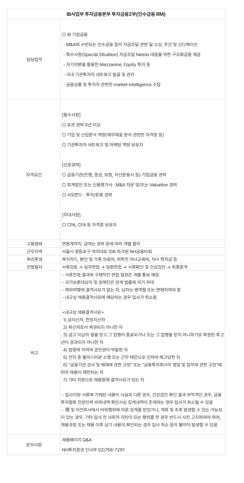 ¡Û IB ±â¾÷±ÝÀ¶ - M&A¿¡ ¼ö¹ÝµÇ´Â Àμö±ÝÀ¶ µîÀÇ ÀÚ±ÝÁ¶´Þ °ü·Ã µô ¼Ò½Ì, ÁÖ¼± ¹× ½ÅµðÄÉÀÌ¼Ç - Ư¼ö»çÇ×(Special Situation) ÀÚ±ÝÁ¶´Þ Needs ´ëÀÀÀ» À§ÇÑ ±¸Á¶È­±ÝÀ¶ Á¦°ø - ÀÚ±âÀÚº»À» Ȱ¿ëÇÑ Mezzanine, Equity ÅõÀÚ µî - ±¹³» ±â°üÅõÀÚÀÚ ³×Æ®¿öÅ© ¹ß±¼ ¹× °ü¸® - ±ÝÀ¶»óǰ ¹× ÅõÀÚÀÚ °ü·ÃÇÑ market intelligence ¼öÁý ÀÚ°Ý¿ä°Ç [Çʼö»çÇ×] ¡Û À¯°ü °æ·Â 5³â ÀÌ»ó ¡Û ±â¾÷ ¹× »ê¾÷ºÐ¼® ¿ª·®(À繫Á¦Ç¥ ºÐ¼® °ü·ÃÇÑ ÀÚ°ÝÁõ µî) ¡Û ±â°üÅõÀÚÀÚ ³×Æ®¿öÅ© ¹× ¸¶ÄÉÆÃ ¿ª·® º¸À¯ÀÚ [¼±È£°æ·Â] ¡Û ±ÝÀ¶±â°ü(ÀºÇà, Áõ±Ç, º¸Çè, ÀÚ»ê¿î¿ë»ç µî) ±â¾÷±ÝÀ¶ °æ·Â ¡Û ȸ°è¹ýÀÎ ¶Ç´Â ½Å¿ëÆò°¡»ç : M&A ÀÚ¹® ¹×/¶Ç´Â Valuation °æ·Â ¡Û »ç¸ðÆÝµå : ÅõÀÚ/¿î¿ë °æ·Â [¿ì´ë»çÇ×] ¡Û CPA, CFA µî ÀÚ°ÝÁõ º¸À¯ÀÚ