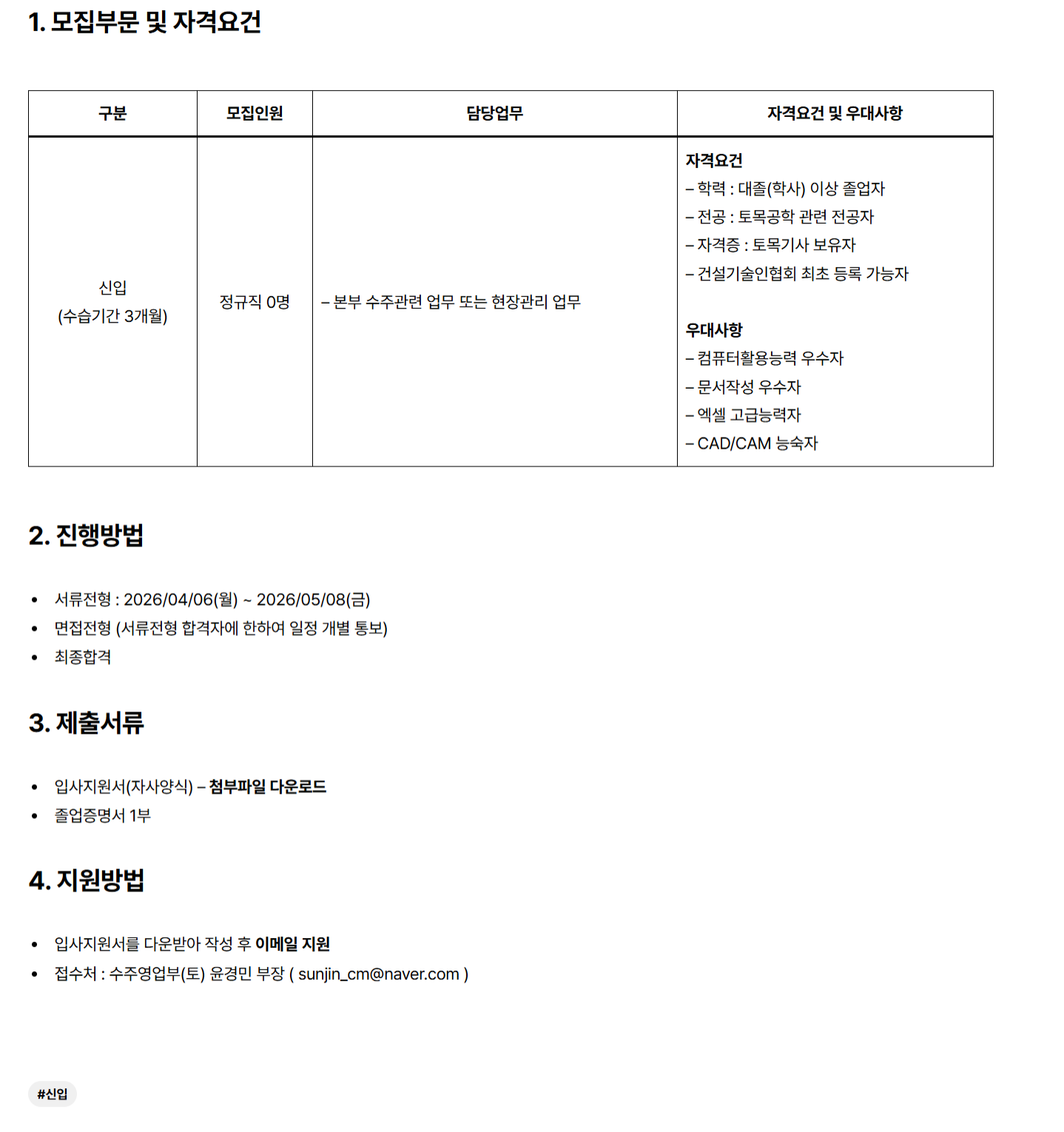(¼ö½À±â°£ 3°³¿ù) Á¤±ÔÁ÷ 0¸í – º»ºÎ ¼öÁÖ°ü·Ã ¾÷¹« ¶Ç´Â ÇöÀå°ü¸® ¾÷¹« ÀÚ°Ý¿ä°Ç