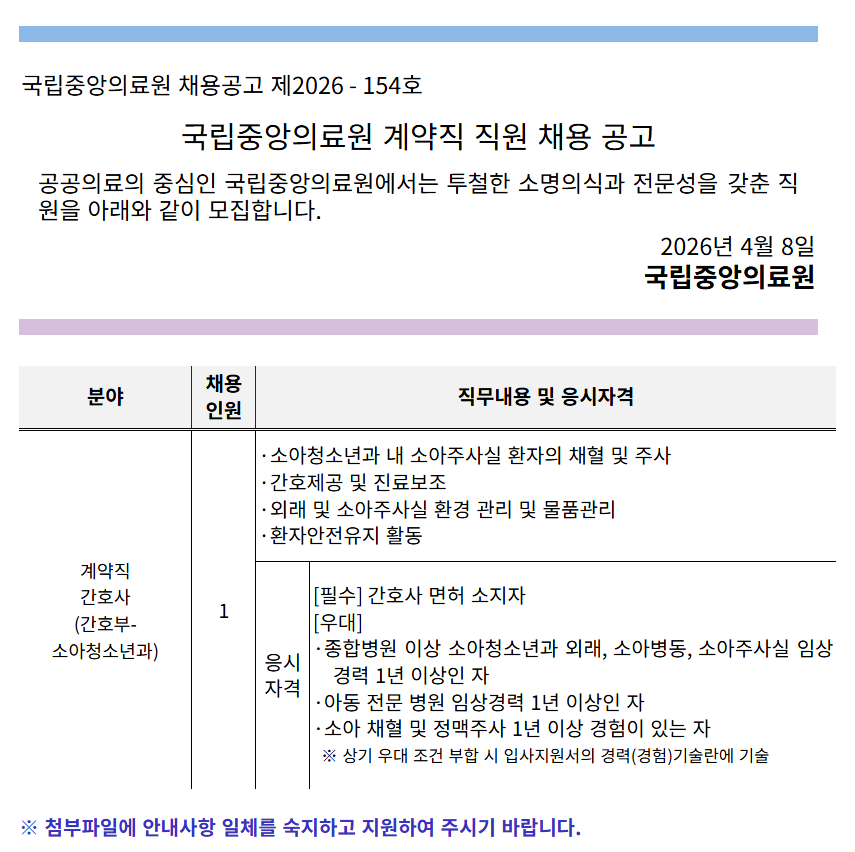 ±¹¸³Áß¾ÓÀÇ·á¿ø ä¿ë°ø°í Á¦2026 - 154È£ ±¹¸³Áß¾ÓÀÇ·á¿ø °è¾àÁ÷ Á÷¿ø ä¿ë °ø°í °ø°øÀÇ·áÀÇ Áß½ÉÀÎ ±¹¸³Áß¾ÓÀÇ·á¿ø¿¡¼­´Â ÅõöÇÑ ¼Ò¸íÀǽİú Àü¹®¼ºÀ» °®Ãá Á÷¿øÀ» ¾Æ·¡¿Í °°ÀÌ ¸ðÁýÇÕ´Ï´Ù. 2026³â 4¿ù 8ÀÏ ±¹¸³Áß¾ÓÀÇ·á¿ø ºÐ¾ß ä¿ë Àοø Á÷¹«³»¿ë ¹× ÀÀ½ÃÀÚ°Ý °è¾àÁ÷ °£È£»ç (°£È£ºÎ-¼Ò¾ÆÃ»¼Ò³â°ú) 1 ¡¤¼Ò¾ÆÃ»¼Ò³â°ú ³» ¼Ò¾ÆÁÖ»ç½Ç ȯÀÚÀÇ Ã¤Ç÷ ¹× ÁÖ»ç ¡¤°£È£Á¦°ø ¹× Áø·áº¸Á¶ ¡¤¿Ü·¡ ¹× ¼Ò¾ÆÁÖ»ç½Ç ȯ°æ °ü¸® ¹× ¹°Ç°°ü¸® ¡¤È¯ÀÚ¾ÈÀüÀ¯Áö Ȱµ¿ ÀÀ½Ã ÀÚ°Ý [Çʼö] °£È£»ç ¸éÇã ¼ÒÁöÀÚ [¿ì´ë] ¡¤Á¾ÇÕº´¿ø ÀÌ»ó ¼Ò¾ÆÃ»¼Ò³â°ú ¿Ü·¡, ¼Ò¾Æº´µ¿, ¼Ò¾ÆÁÖ»ç½Ç ÀÓ»ó°æ·Â 1³â ÀÌ»óÀÎ ÀÚ ¡¤¾Æµ¿ Àü¹® º´¿ø ÀÓ»ó°æ·Â 1³â ÀÌ»óÀÎ ÀÚ ¡¤¼Ò¾Æ äÇ÷ ¹× Á¤¸ÆÁÖ»ç 1³â ÀÌ»ó °æÇèÀÌ ÀÖ´Â ÀÚ ¡Ø »ó±â ¿ì´ë Á¶°Ç ºÎÇÕ ½Ã ÀÔ»çÁö¿ø¼­ÀÇ °æ·Â(°æÇè)±â¼ú¶õ¿¡ ±â¼ú ¡Ø ÷ºÎÆÄÀÏ¿¡ ¾È³»»çÇ× ÀÏü¸¦ ¼÷ÁöÇϰí Áö¿øÇÏ¿© Áֽñ⠹ٶø´Ï´Ù.