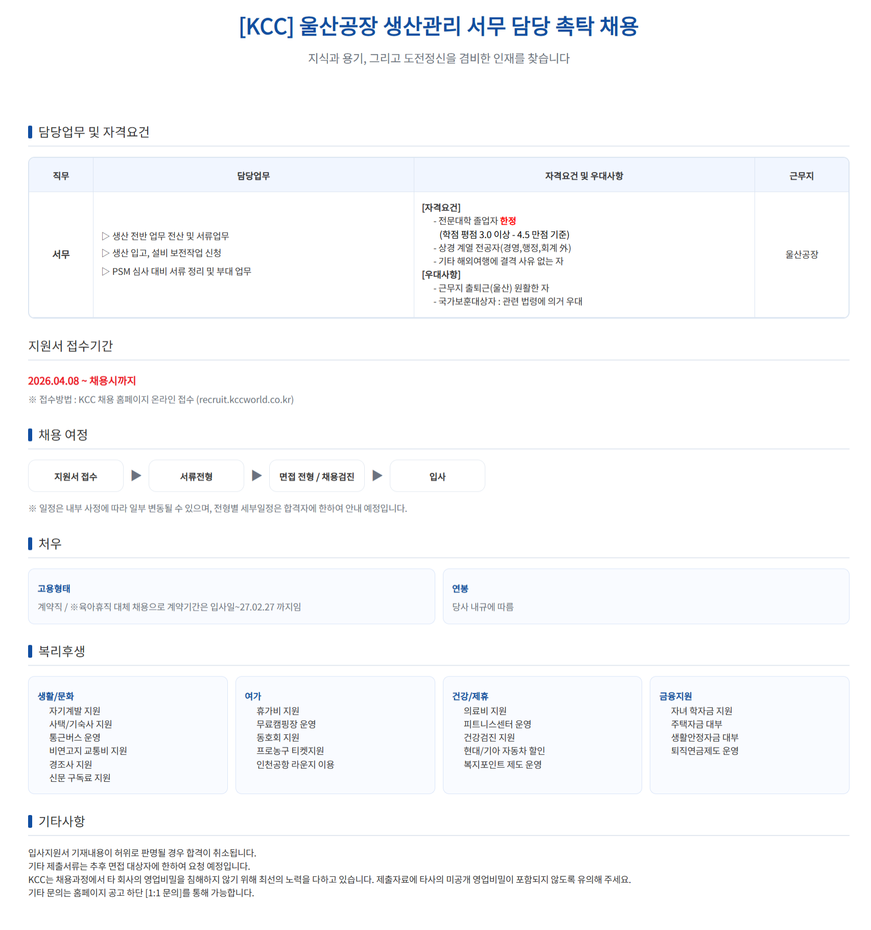 ¡Ø Á¢¼ö¹æ¹ý : KCC ä¿ë ȨÆäÀÌÁö ¿Â¶óÀÎ Á¢¼ö (recruit.kccworld.co.kr)
