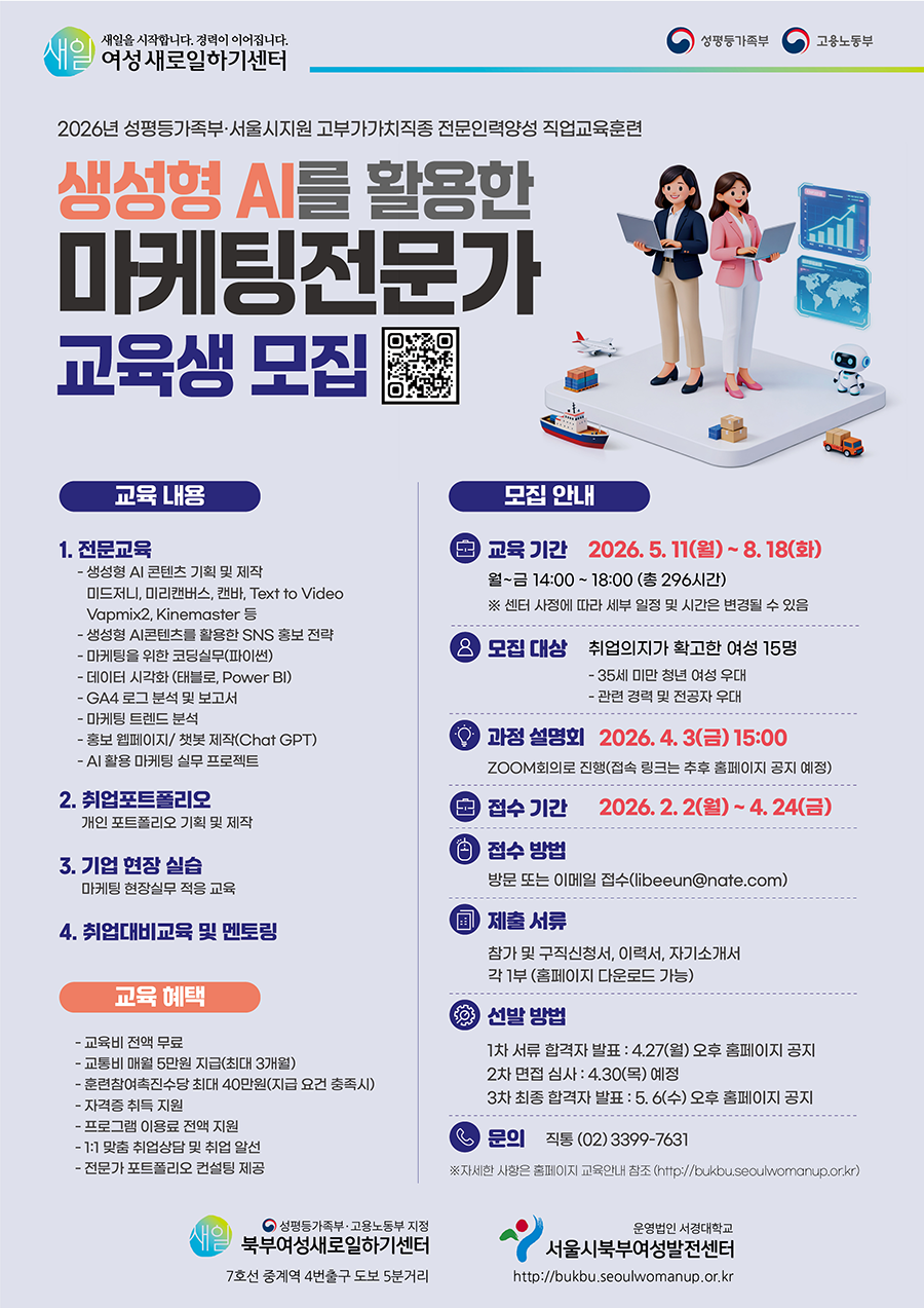 »õÀÏÀ» ½ÃÀÛÇÕ´Ï´Ù. °æ·ÂÀÌ À̾îÁý´Ï´Ù. ¿©¼º »õ·ÎÀÏÇϱ⼾ÅÍ ¼ºÆòµî°¡Á·ºÎ °íÀÀ³ëµ¿ºÎ 2026³â ¼ºÆòµî°¡Á·ºÎ?¼­¿ï½ÃÁö¿ø °íºÎ°¡°¡Ä¡Á÷Á¾ Àü¹®Àη¾缺 Á÷¾÷±³À°ÈÆ·Ã »ý¼ºÇü AI¸¦ Ȱ¿ëÇÑ ¸¶ÄÉÆÃÀü¹®°¡ ±³À°»ý ¸ðÁý ±³À° ³»¿ë 1. Àü¹®±³À° - »ý¼ºÇü AI ÄÜÅÙÃ÷ ±âȹ ¹× Á¦ÀÛ DEALI, DIR, 28, Text to Video Vapmix2, Kinemaster 5 - »ý¼ºÇü AIÄÜÅÙÃ÷¸¦ Ȱ¿ëÇÑ SNS È«º¸ Àü·« - ¸¶ÄÉÆÃÀ» À§ÇÑ ÄÚµù½Ç¹«(ÆÄÀ̽ã) - µ¥ÀÌÅÍ ½Ã°¢È­ (źí·Î, Power BI) - GA4 ·Î±× ºÐ¼® ¹× º¸°í¼­ - ¸¶ÄÉÆÃ Æ®·»µå ºÐ¼® - È«º¸ À¥ÆäÀÌÁö/ ÇÞº¿ Á¦ÀÛ(Chat GPT) - AI Ȱ¿ë ¸¶ÄÉÆÃ ½Ç¹« ÇÁ·ÎÁ§Æ® 2. Ãë¾÷Æ÷Æ®Æú¸®¿À °³ÀÎ Æ÷Æ®Æú¸®¿À ±âȹ ¹× Á¦ÀÛ 3. ±â¾÷ ÇöÀå ½Ç½À ¸¶ÄÉÆÃ ÇöÀå½Ç¹« ÀûÀÀ ±³À° 4. Ãë¾÷´ëºñ±³À° ¹× ¸àÅ丵 ±³À° ÇýÅà - ±³À°ºñ Àü¾× ¹«·á - ±³Åëºñ ¸Å¿ù 5¸¸¿ø Áö±Þ(ÃÖ´ë 3°³¿ù) - ÈÆ·ÃÂü¿©ÃËÁø¼ö´ç ÃÖ´ë 40¸¸¿ø(Áö±Þ ¿ä°Ç ÃæÁ·½Ã) - ÀÚ°ÝÁõ Ãëµæ Áö¿ø - ÇÁ·Î±×·¥ ÀÌ¿ë·á Àü¾× Áö¿ø - 1:1 ¸ÂÃã Ãë¾÷»ó´ã ¹× Ãë¾÷ ¾Ë¼± - Àü¹®°¡ Æ÷Æ®Æú¸®¿À ÄÁ¼³ÆÃ Á¦°ø ¸ðÁý ¾È³» ±³À° ±â°£ 2026. 5. 11(¿ù)~ 8. 18(È­) ¿ù~±Ý 14:00~ 18:00 (ÃÑ 296½Ã°£) ¡Ø ¼¾ÅÍ »çÁ¤¿¡ µû¶ó ¼¼ºÎ ÀÏÁ¤ ¹× ½Ã°£Àº º¯°æµÉ ¼ö ÀÖÀ½ ¸ðÁý ´ë»ó Ãë¾÷ÀÇÁö°¡ È®°íÇÑ ¿©¼º 15¸í - 35¼¼ ¹Ì¸¸ û³â ¿©¼º ¿ì´ë - °ü·Ã °æ·Â ¹× Àü°øÀÚ ¿ì´ë ? °úÁ¤ ¼³¸íȸ 2026. 4. 3(±Ý) 15:00 ZOOMȸÀÇ·Î ÁøÇà(Á¢¼Ó ¸µÅ©´Â ÃßÈÄ È¨ÆäÀÌÁö °øÁö ¿¹Á¤) Á¢¼ö ±â°£ 2026.2. 2(¿ù)~ 4.24(±Ý) Á¢¼ö ¹æ¹ý ¹æ¹® ¶Ç´Â À̸ÞÀÏ Á¢¼ö(******@*******.***) Á¦Ãâ ¼­·ù Âü°¡ ¹× ±¸Á÷½Åû¼­, À̷¼­, ÀÚ±â¼Ò°³¼­ °¢ 1ºÎ(ȨÆäÀÌÁö ´Ù¿î·Îµå °¡´É) ¼±¹ß ¹æ¹ý 1Â÷ ¼­·ù ÇÕ°ÝÀÚ ¹ßÇ¥ : 4.27(¿ù) ¿ÀÈÄ È¨ÆäÀÌÁö °øÁö 2Â÷ ¸éÁ¢ ½É»ç : 4.30(¸ñ) ¿¹Á¤ 3Â÷ ÃÖÁ¾ ÇÕ°ÝÀÚ ¹ßÇ¥ : 5. 6(¼ö) ¿ÀÈÄ È¨ÆäÀÌÁö °øÁö ¹®ÀÇ Á÷µ¿ (***-****-**** ¡Ø ÀÚ¼¼ÇÑ »çÇ×Àº ȨÆäÀÌÁö ±³À°¾È³» ÂüÁ¶ (http://bukbu.seoulwomanup.or.kr) ? ¼ºÆòµî°¡Á·ºÎ? °í¿ë³ëµ¿ºÎ ÁöÁ¤ ºÏºÎ¿©¼º»õ·ÎÀÏÇϱ⼾ÅÍ 7È£¼± Á߰迪 4¹øÃⱸ µµº¸ 5ºÐ°Å¸® ¿î¿µ¹ýÀÎ ¼­°æ´ëÇб³ ¼­¿ï½ÃºÏºÎ¿©¼º¹ßÀü¼¾ÅÍ http://bukou.seoulwomanup.or.kr