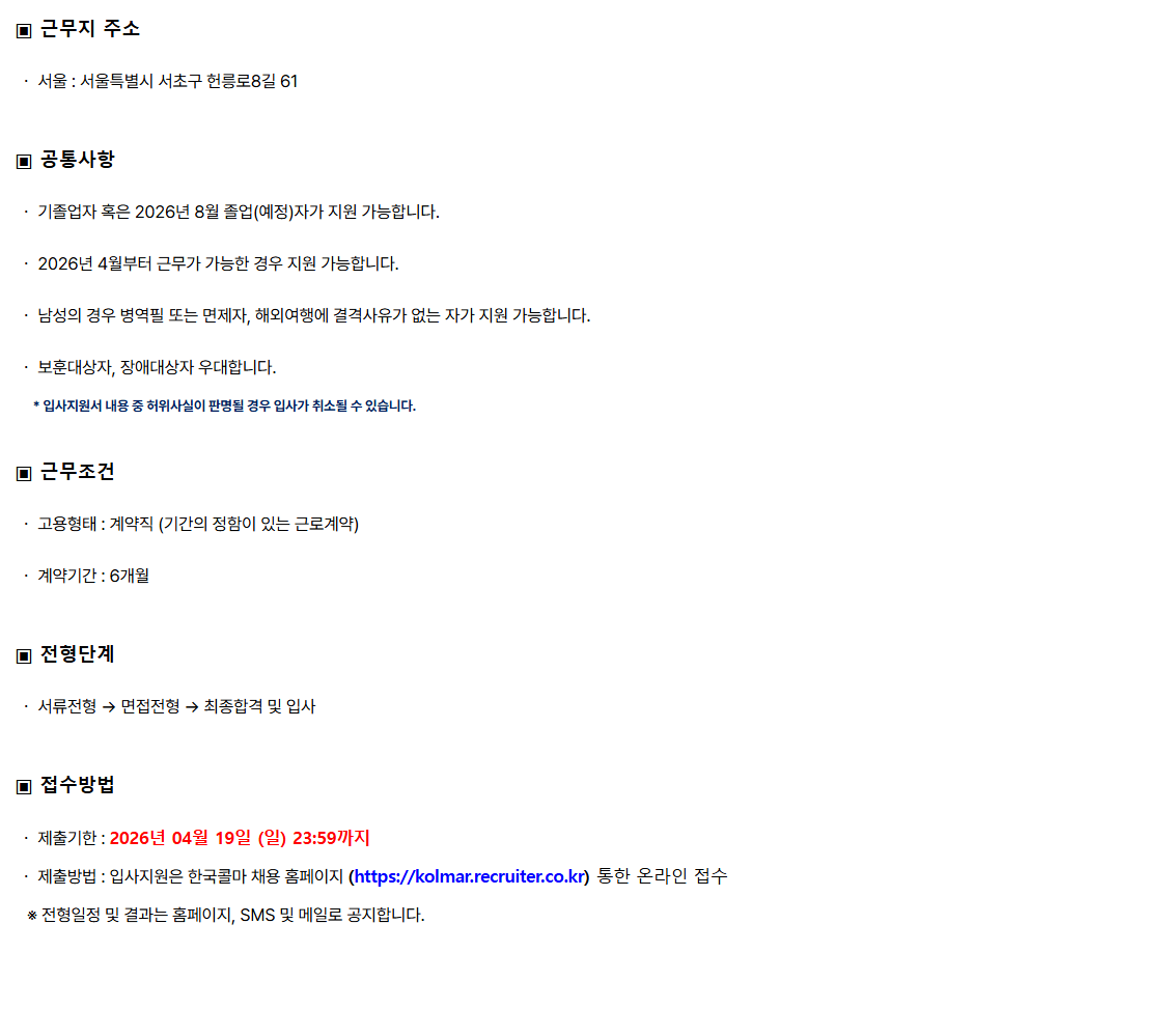 ¤ý Á¦Ãâ¹æ¹ý : ÀÔ»çÁö¿øÀº Çѱ¹Äݸ¶ ä¿ë ȨÆäÀÌÁö (https://kolmar.recruiter.co.kr) ÅëÇÑ ¿Â¶óÀÎ Á¢¼ö